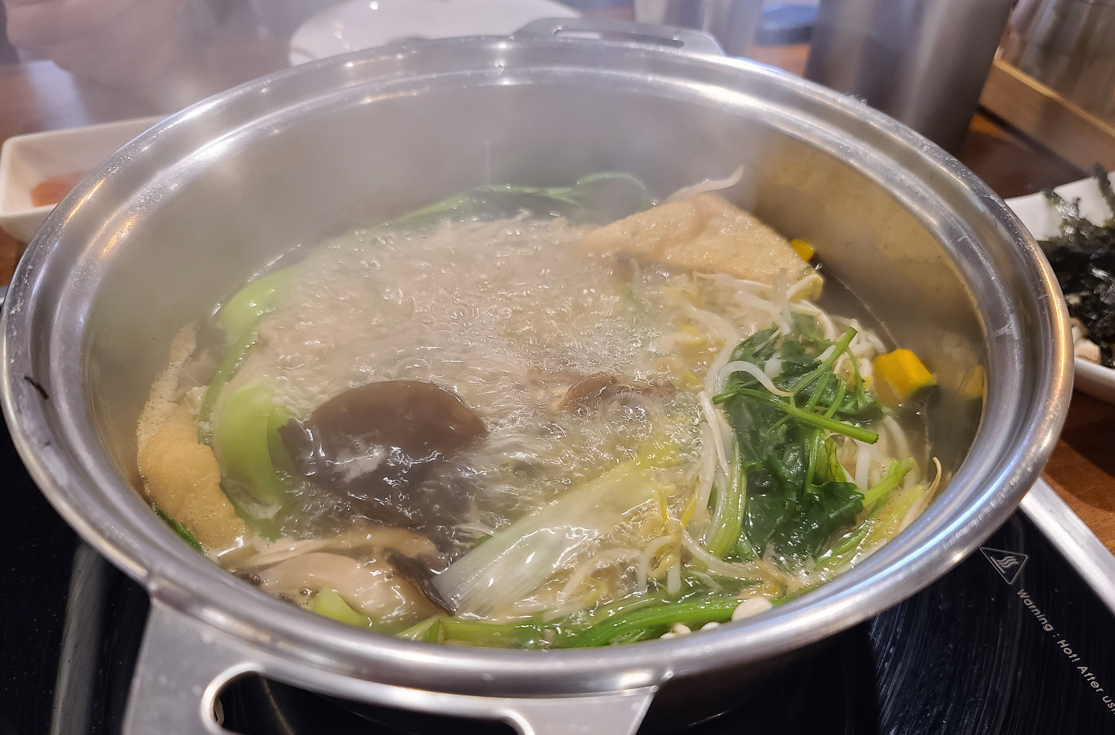 등심 칼국수에는 위와 같이 각종 반찬들과 육수, 볶음밥 재료와 칼국수 재료 등을 함께 제공하고 있었습니다. 샤브샤브 전용 육수를 끓이기 시작하였고, 곧이어 채소들과 재료를 넣고 익히기 시작했습니다.