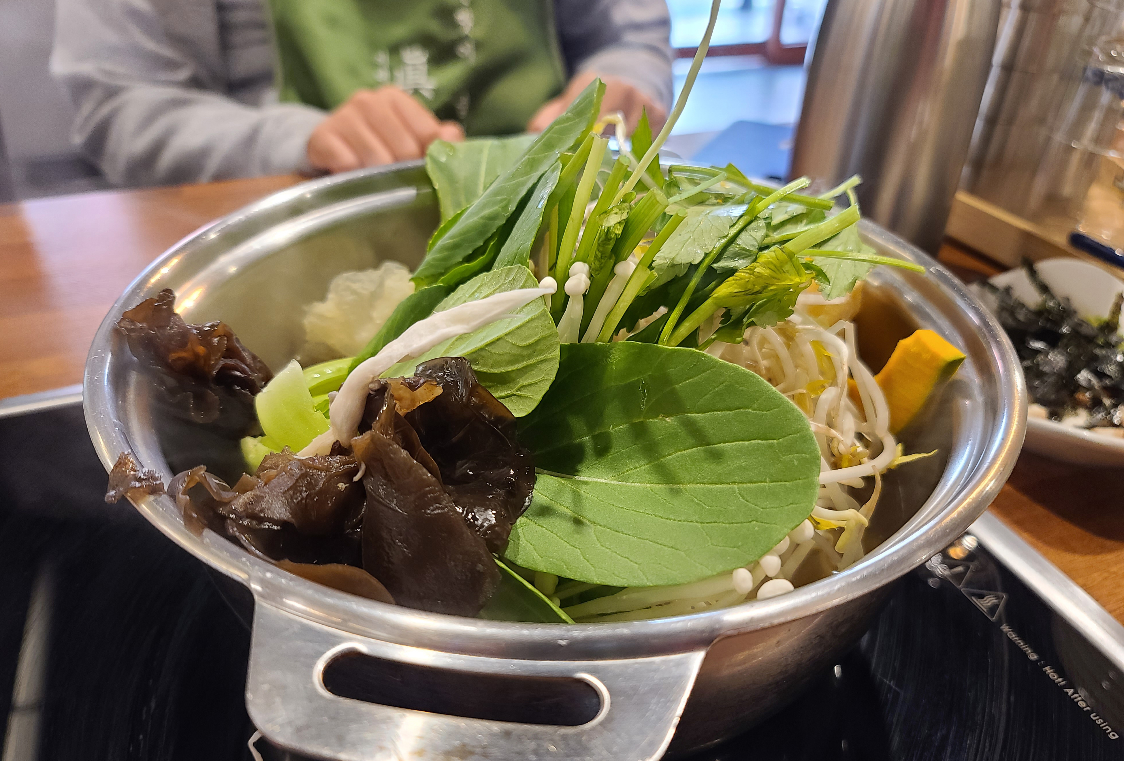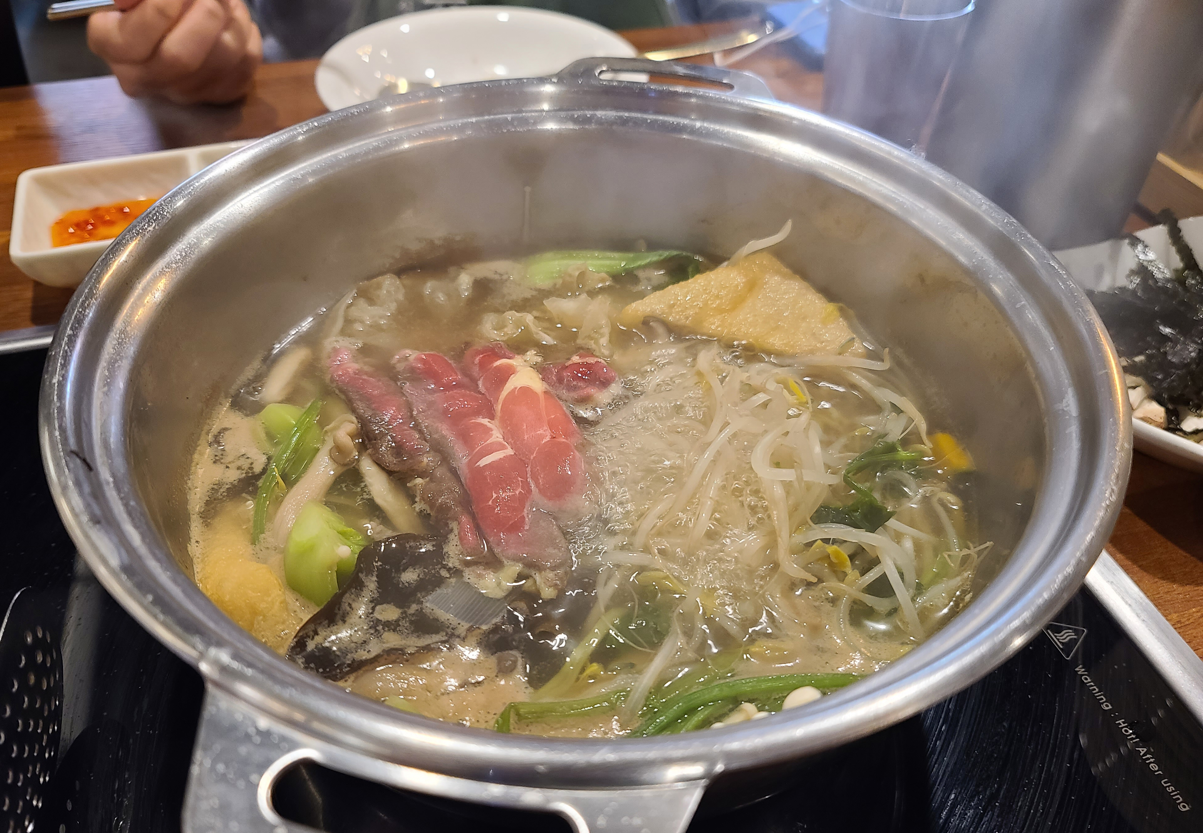 샤브샤브 육수에 각종 버섯과 채소들을 넣고 끓여주다가, 고기를 넣어 익혀먹었습니다. 고기추가를 했더니 고기 양이 많아서 좋긴 하더라고요. 전체적으로 맛도 괜찮고 고기도 먹을만했습니다.