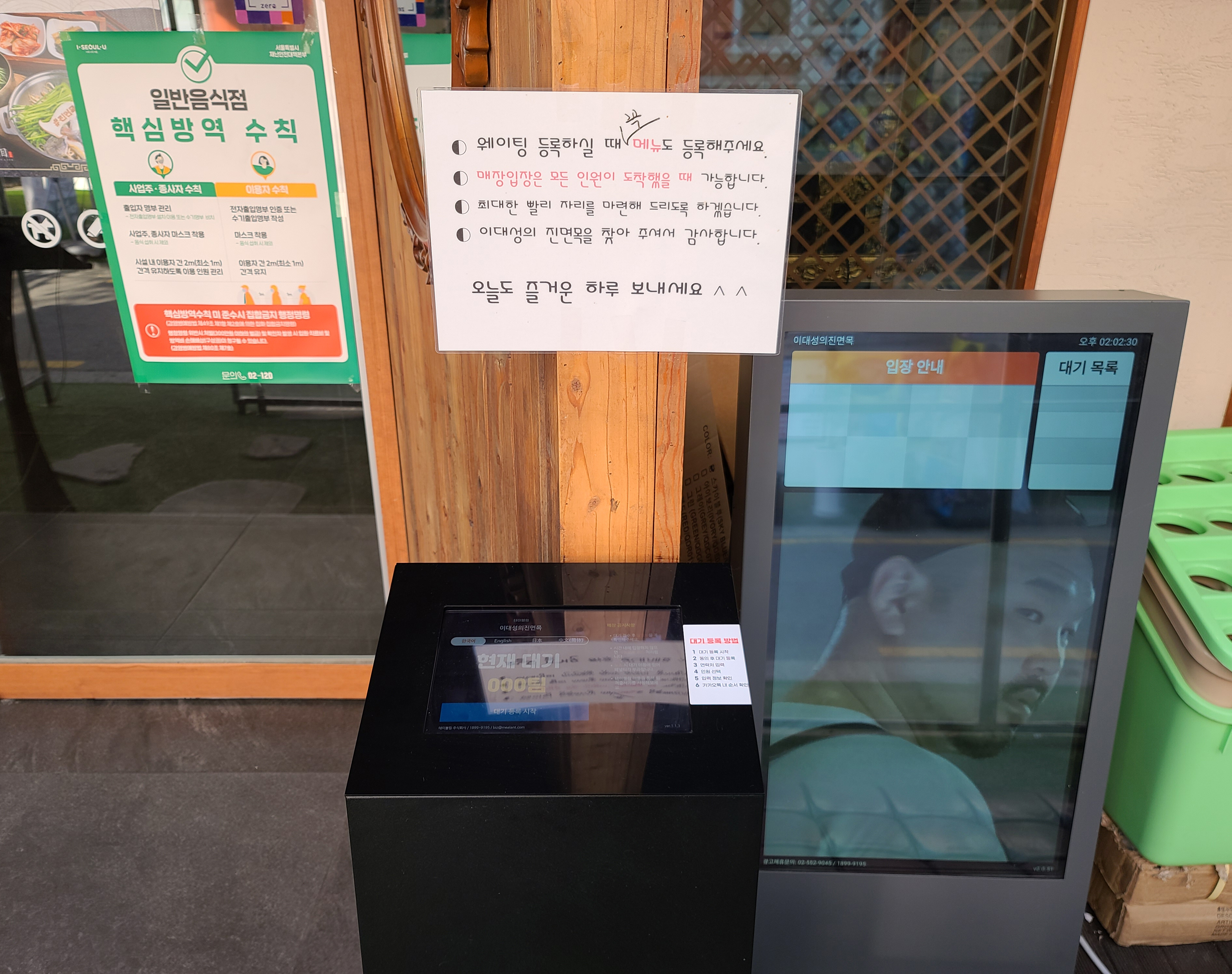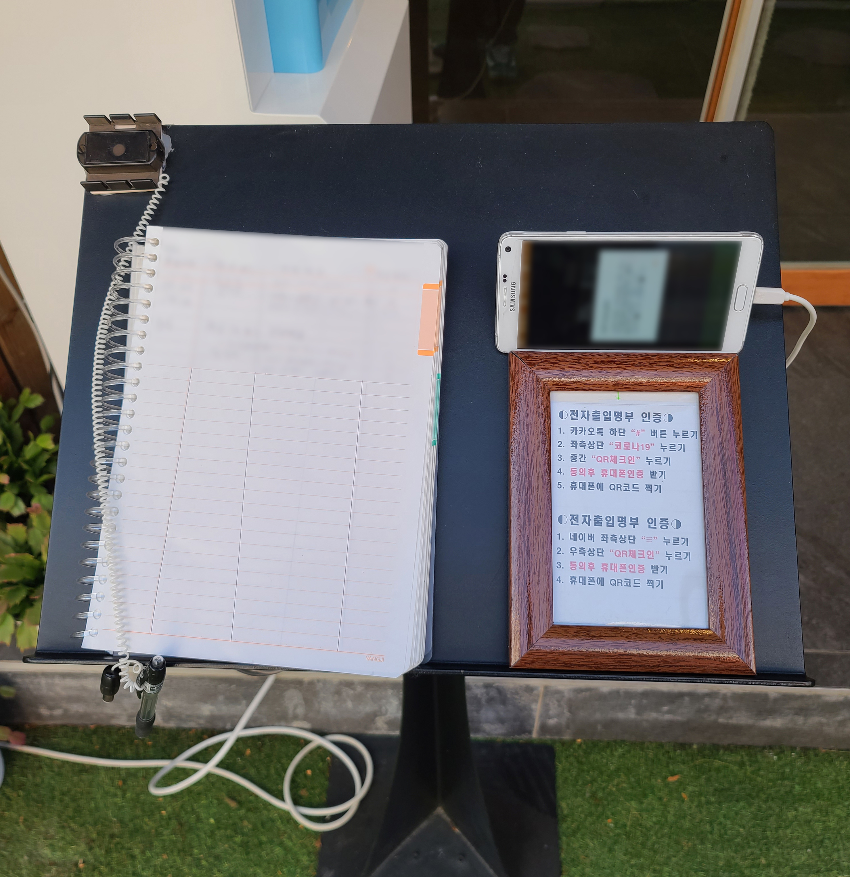 삼성동 이대성의진면목 가게에 입장하기 전에 먼저, QR 코드 체크인을 해주었고, 전자출입 명부 작성이 어려운 분들을 위해 방문 시간과 개인정보를 수기 작성하는 노트도 있었습니다.