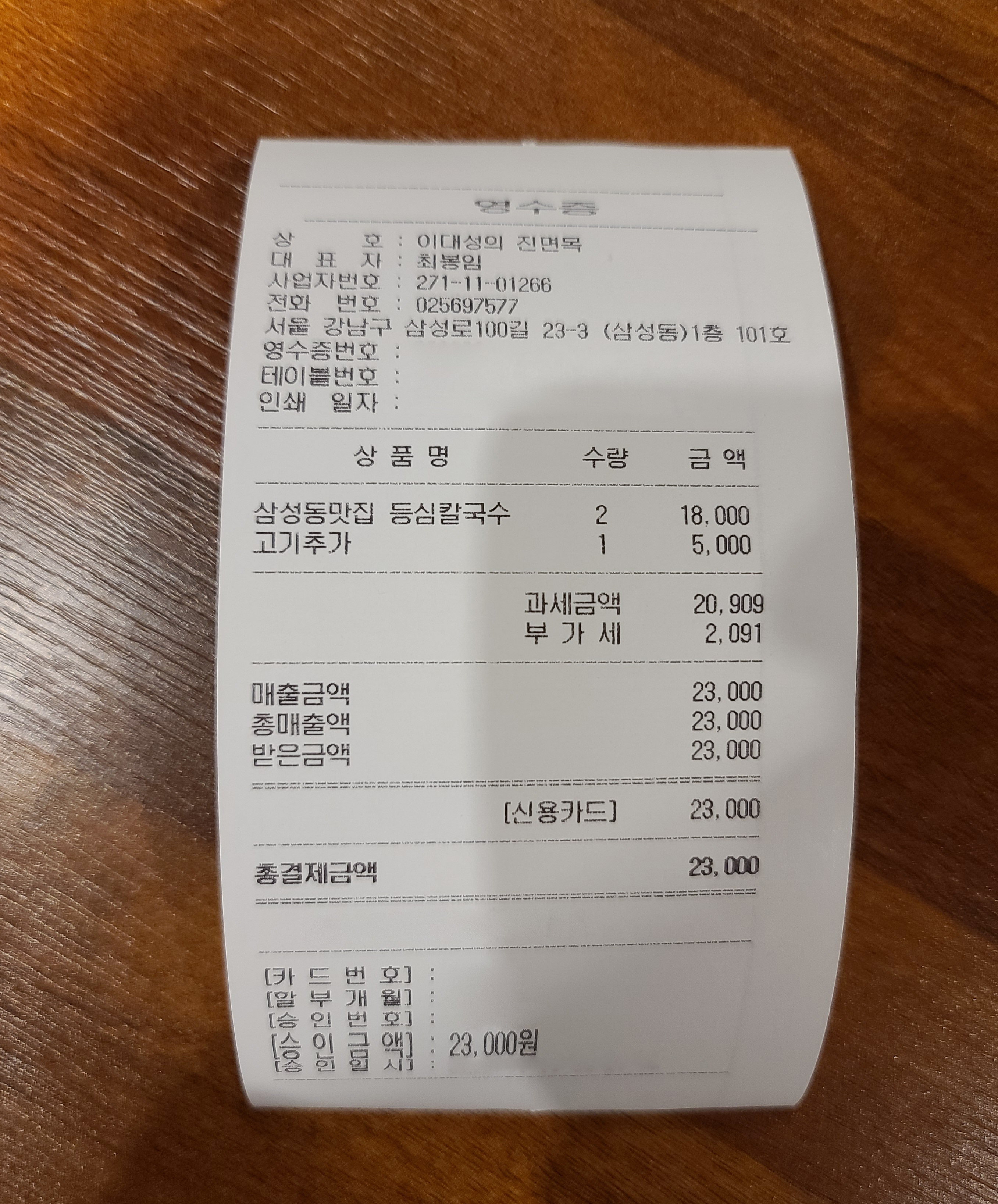 총금액은 등심칼국수 2인분에 고기 추가하여 23,000원이 나왔습니다. 이대성의진면목 가게는 전체적으로 맛도 괜찮고, 손님들도 많이 찾는 가게였습니다. 가게에 보니 유명 연예인들도 방문했던 것 같더라고요. 관심이 있으신 분은 한 번 이용해보시는 것을 추천드리고요. 오늘도 좋은 하루 보내세요.