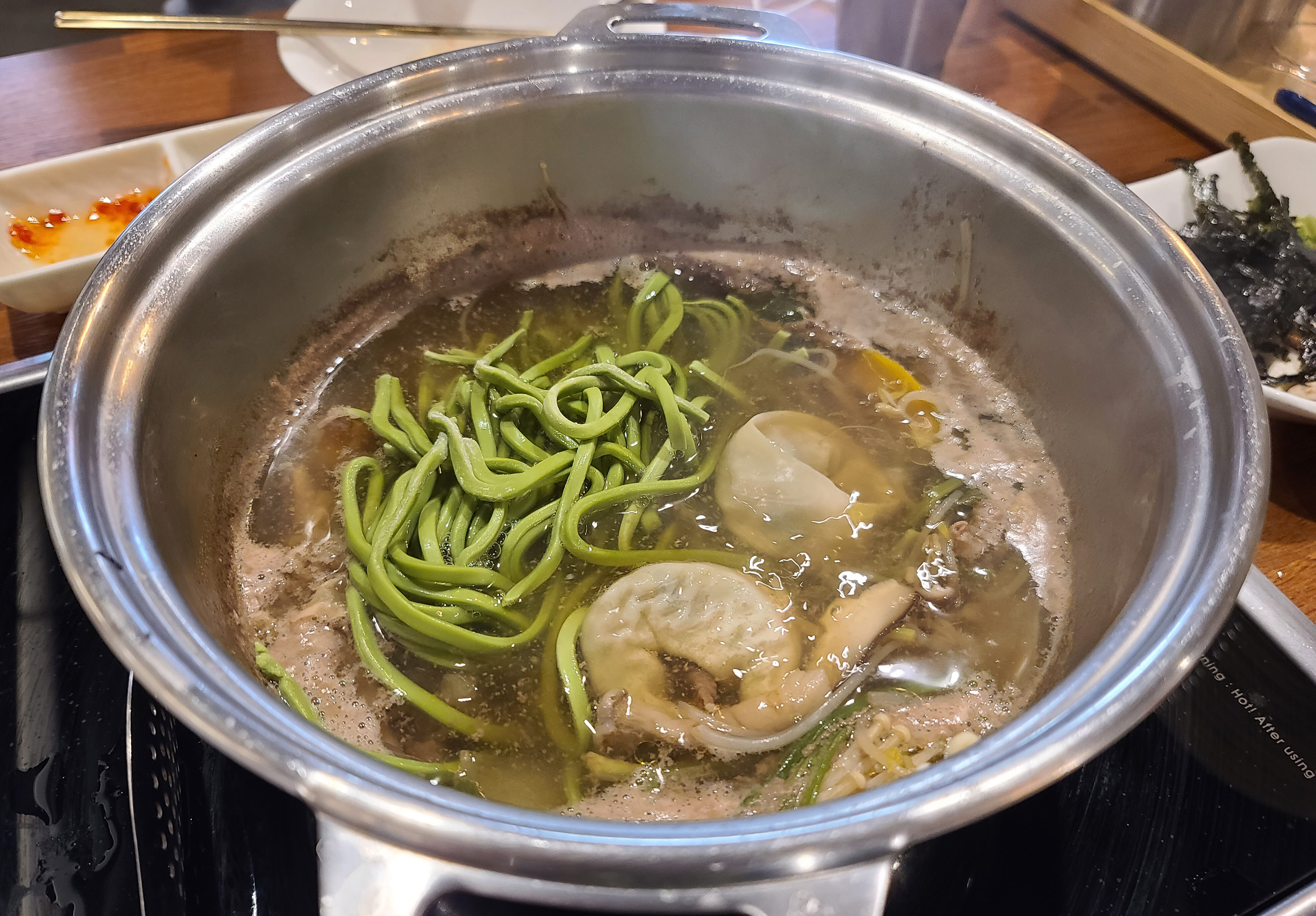 고기야 채소를 끓인 육수에 이대성의 진면목의 클로렐라 면과 만두를 넣고 끓여주었습니다. 고기도 적당히 남겨두어서 칼국수와 고기를 동시에 먹는 것도 괜찮더라고요. 끝으로 남은 국물에 죽을 끓였습니다.