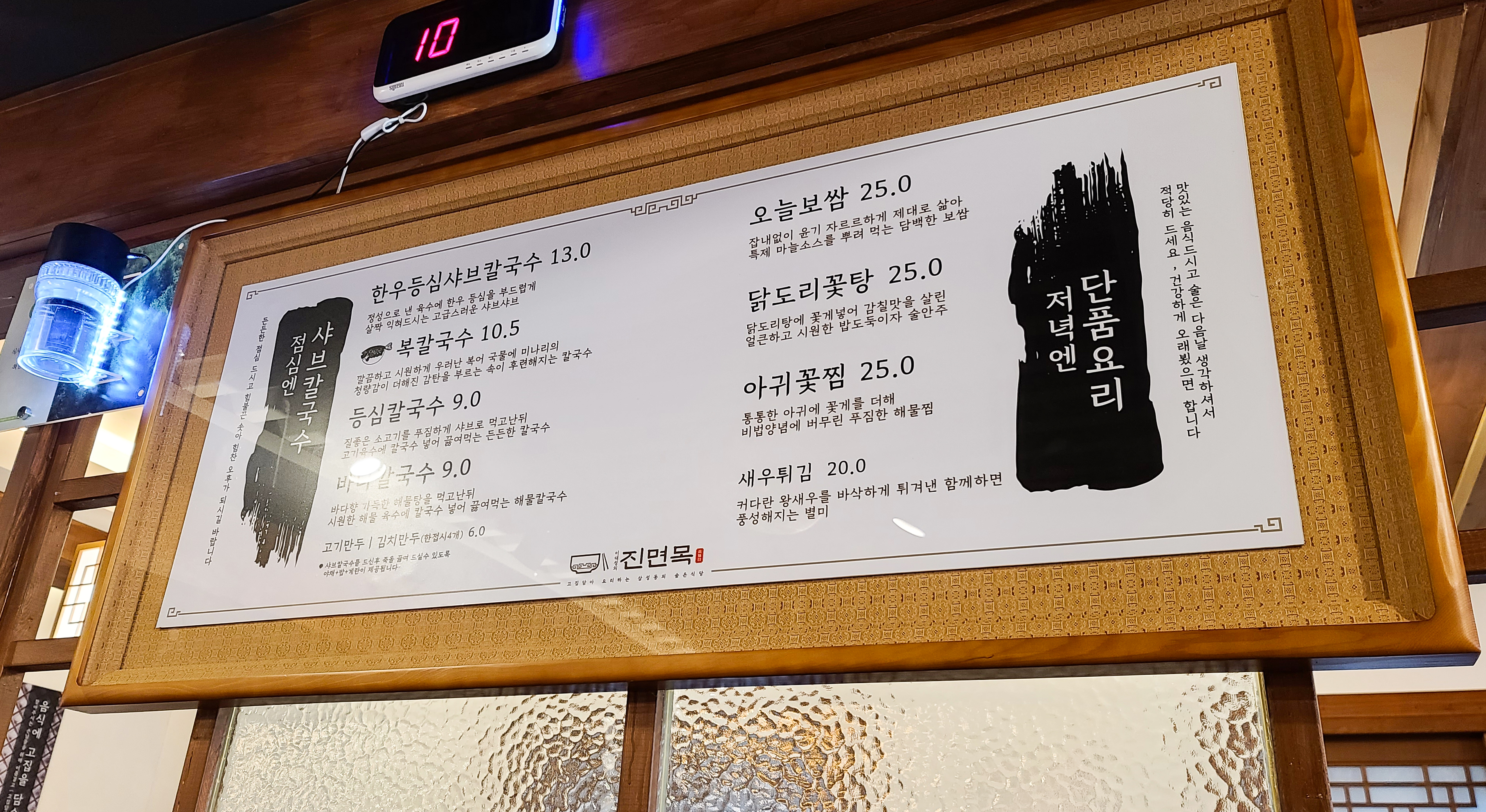 이대성의진면목의 메뉴는 위와 같았습니다. 한우등심샤브칼국수, 복칼국수, 등심칼국수, 바다칼국수, 고기만두, 김치만두, 야채추가, 고기추가, 오늘보쌈, 닭도리꽃탕, 아귀꽃찜, 새우튀김 등이 있었습니다. 가격은 샤브샤브 기준 9,000원~ 13,000원 사이였으며, 크게 부담스럽지 않은 편이었습니다. 저희는 등심 칼국수 2인분을 주문하고, 고기추가를 했습니다.