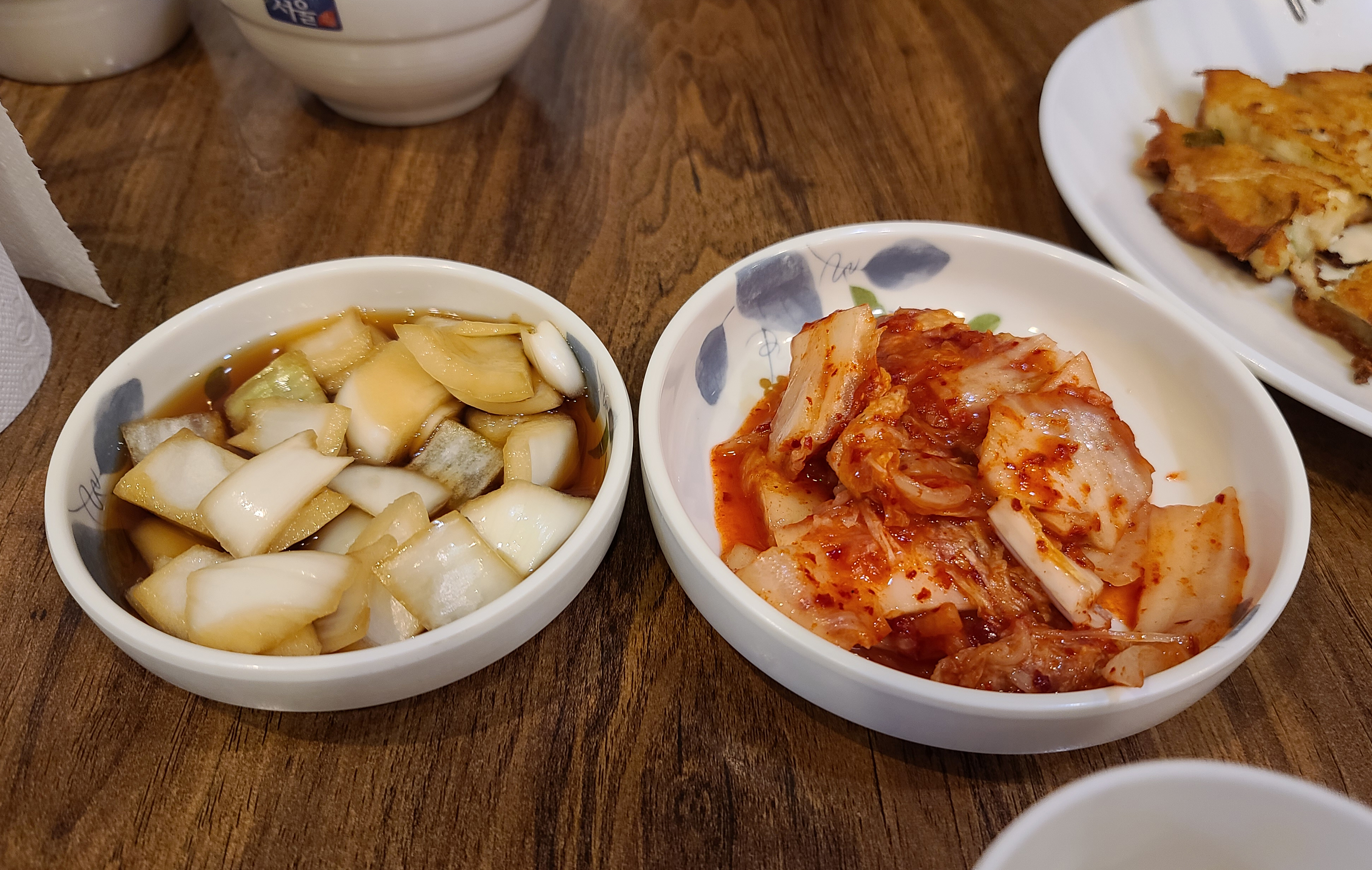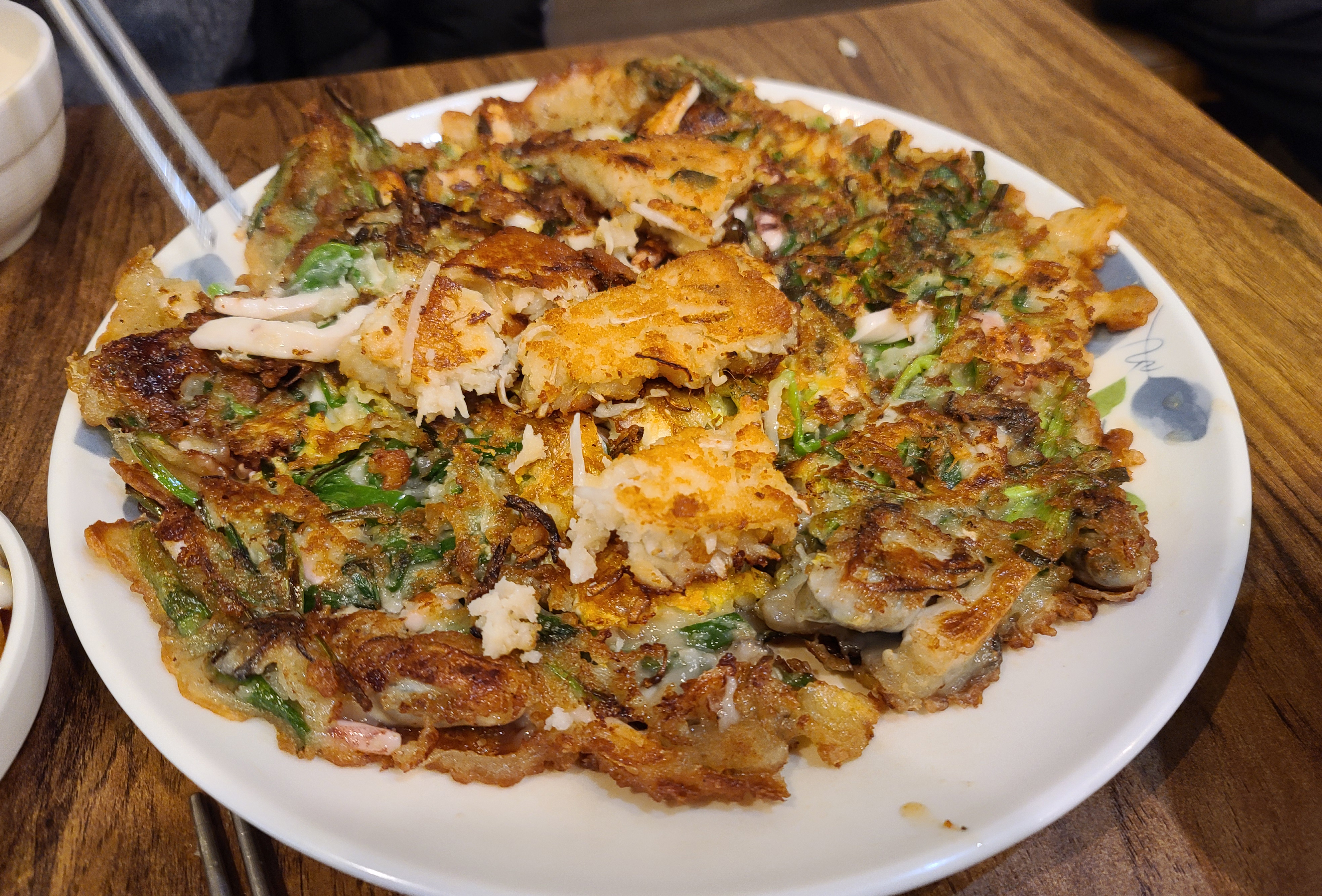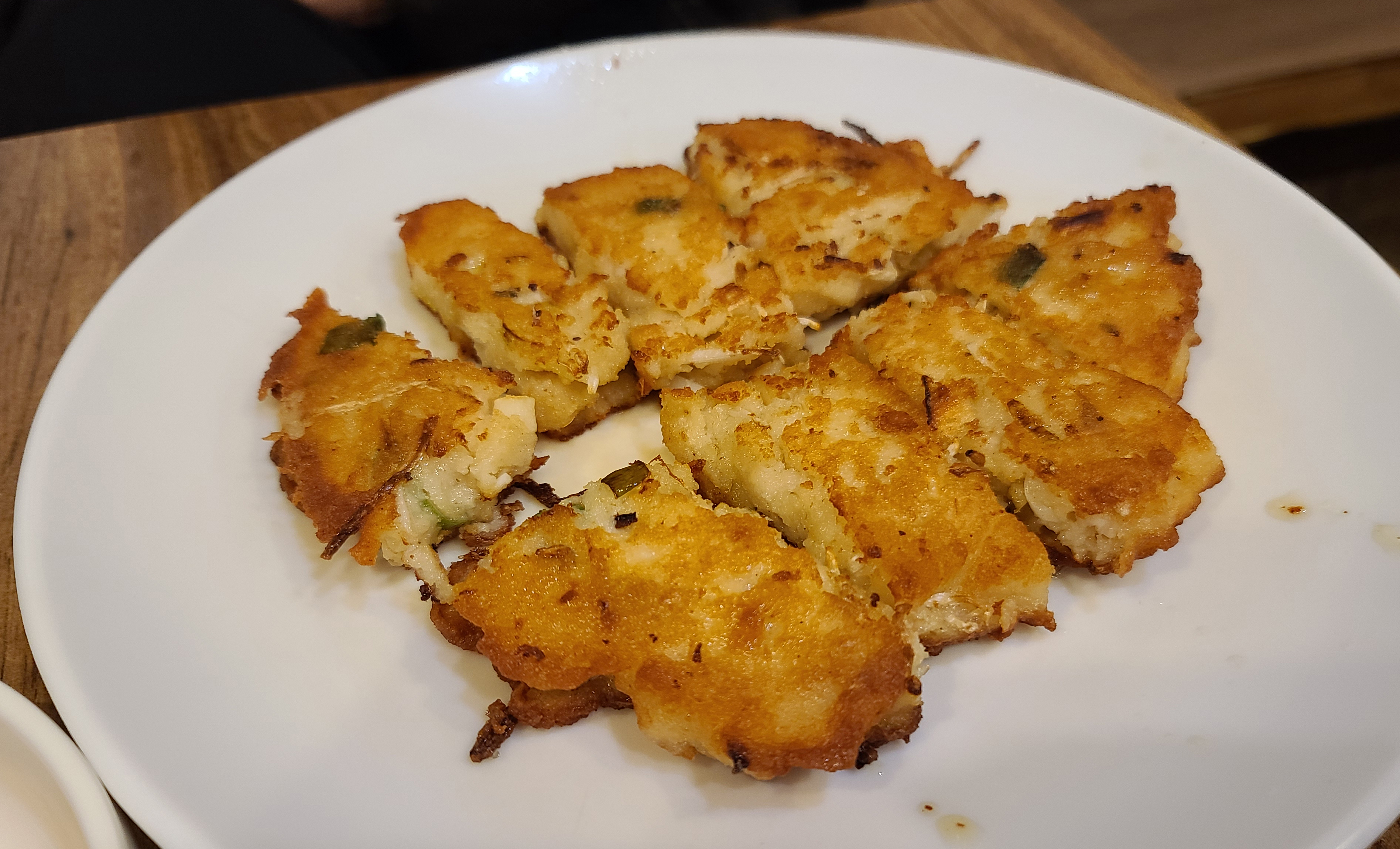 빈대떡은 김치와 양파장과 함께 제공되었습니다. 녹두로 만든 빈대떡은 기름에 부쳐내 느끼하지만 고소한 맛이 있었고, 해물파전은 굴과 오징어가 많이 들어가 있어 감칠맛이 있어 좋았습니다. 주로 기름에 부쳐낸 음식이라 맛은 괜찮았지만 느끼한 것은 어쩔 수 없더라고요. 그래도 빈대떡과 파전이 두루 맛있었습니다.