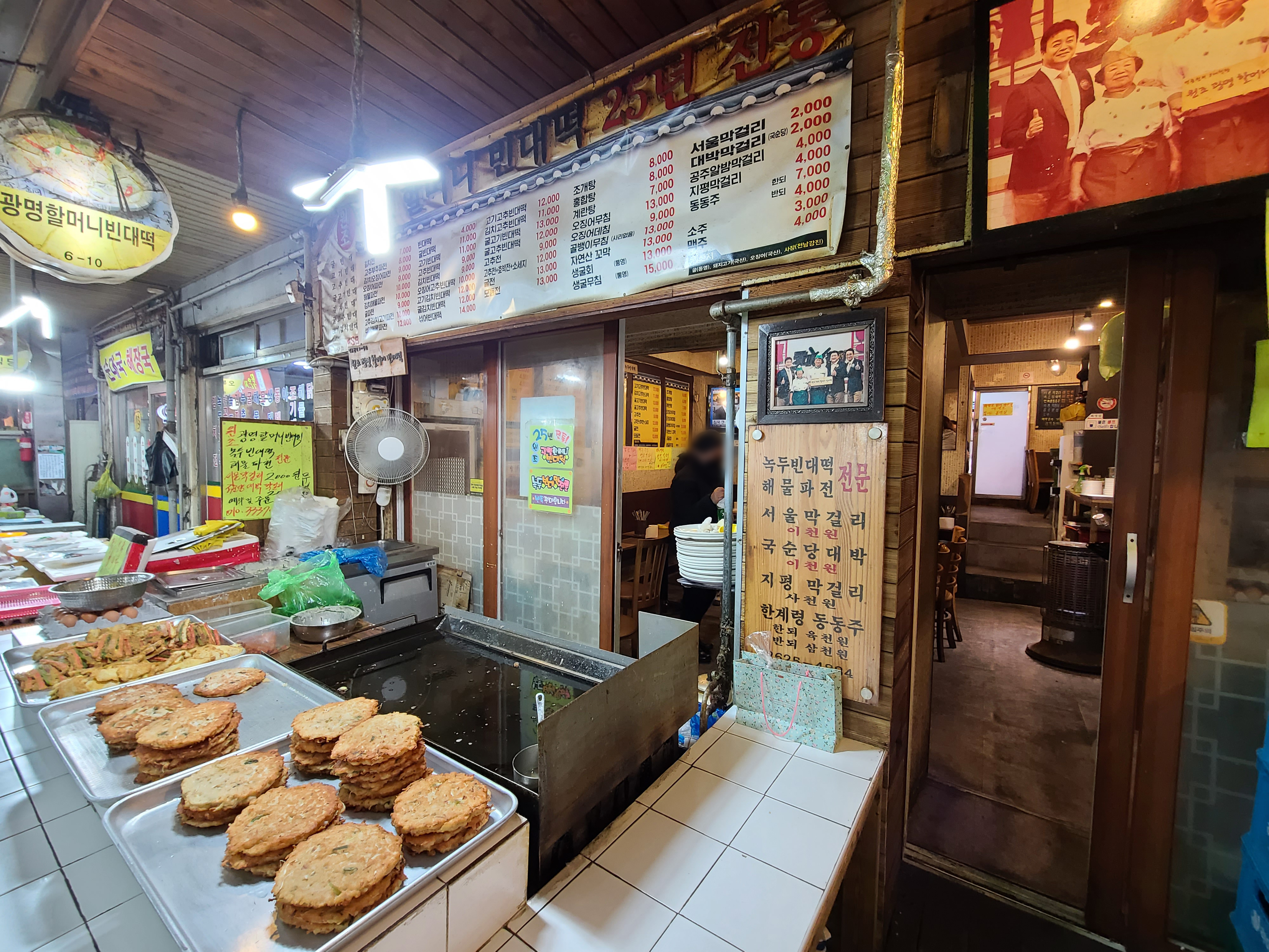 광명시장 원조광명할머니빈대떡 가게는 본점과 분점이 있는듯 했고요, 저는 본점에서 식사를 했습니다. 특이한 점은 두 메뉴판을 비교해보니 원조광명할머니빈대떡 본점의 가격이 1,000원 정도 저렴하게 형성되어있더라고요. (왜 가격이 차이 있는지는 잘 모르겠습니다.)