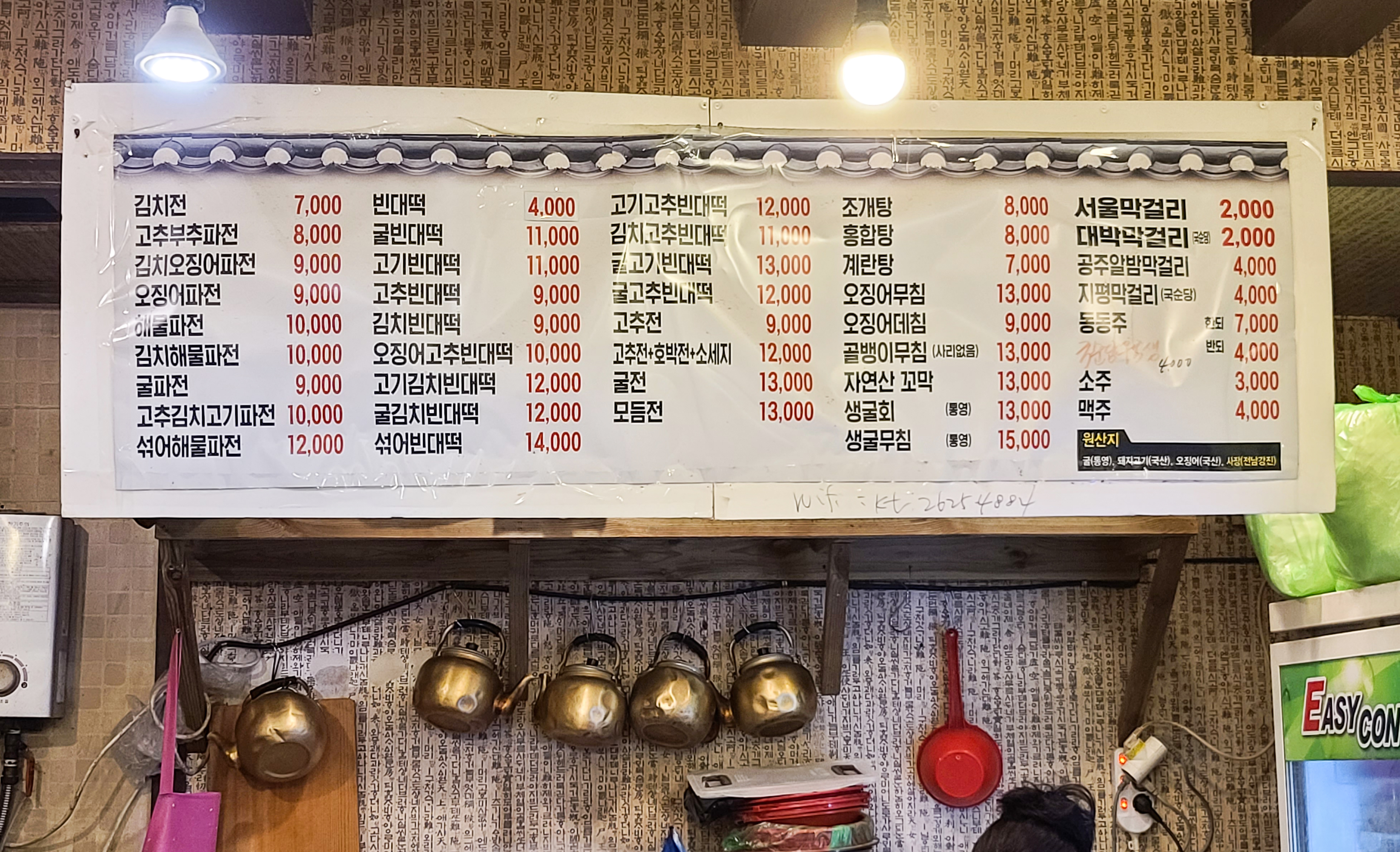 본점의 메뉴는 위와 같습니다. 김치전, 고추부추파전, 김치오징어파전, 오징어파전, 해물파전, 김치해물파전, 굴파전, 고추김치고기파전, 섞어해물파전, 빈대떡, 굴빈대떡, 고기빈대떡, 고추빈대떡, 김치빈대떡, 오징어고추빈대떡, 고기김치빈대떡, 굴김치빈대떡, 섞어빈대떡, 고기고추빈대떡, 김치고추빈대떡, 굴고기빈대떡, 굴고추빈대떡, 고추전, 고추전+호박전+소세지, 굴전, 모듬전, 조개탕, 홍합탕, 계란탕, 오징어무침, 오징어데침, 골뱅이무침, 자연산꼬막, 생굴회, 생굴무침 등이 있었습니다. 가격대는 4,000원~ 15,000원 사이로 부담스럽지는 않았습니다. (저는 빈대떡과 해물파전을 주문했습니다.)