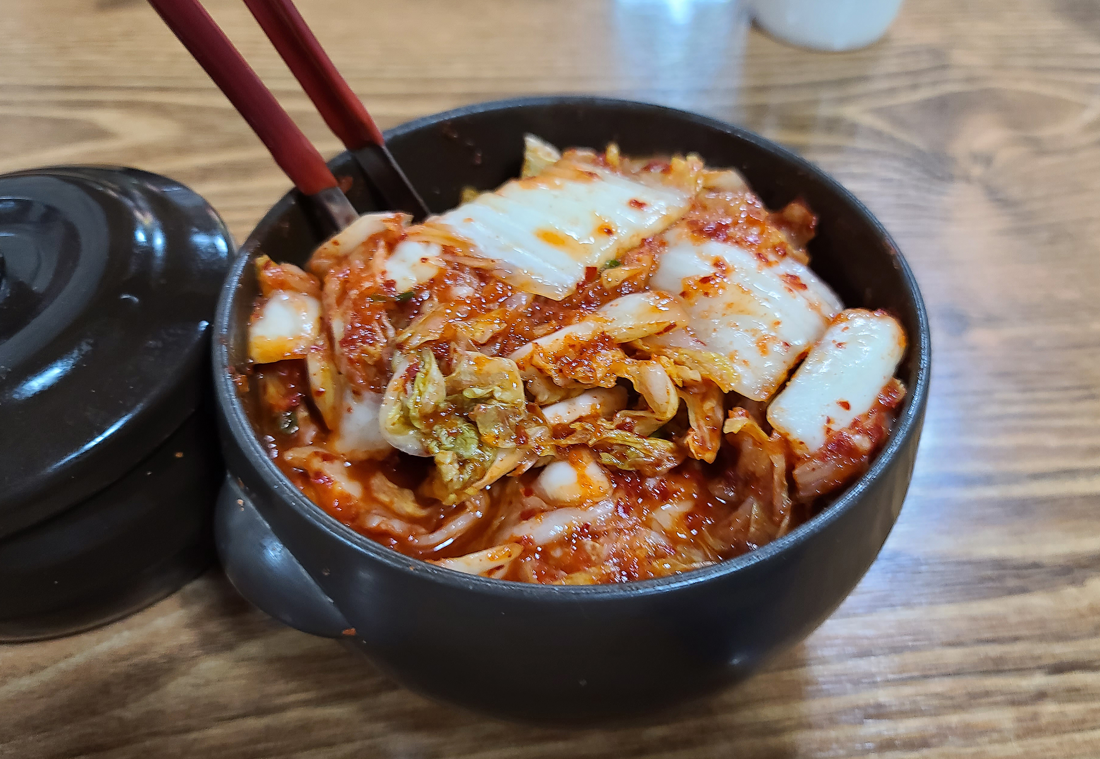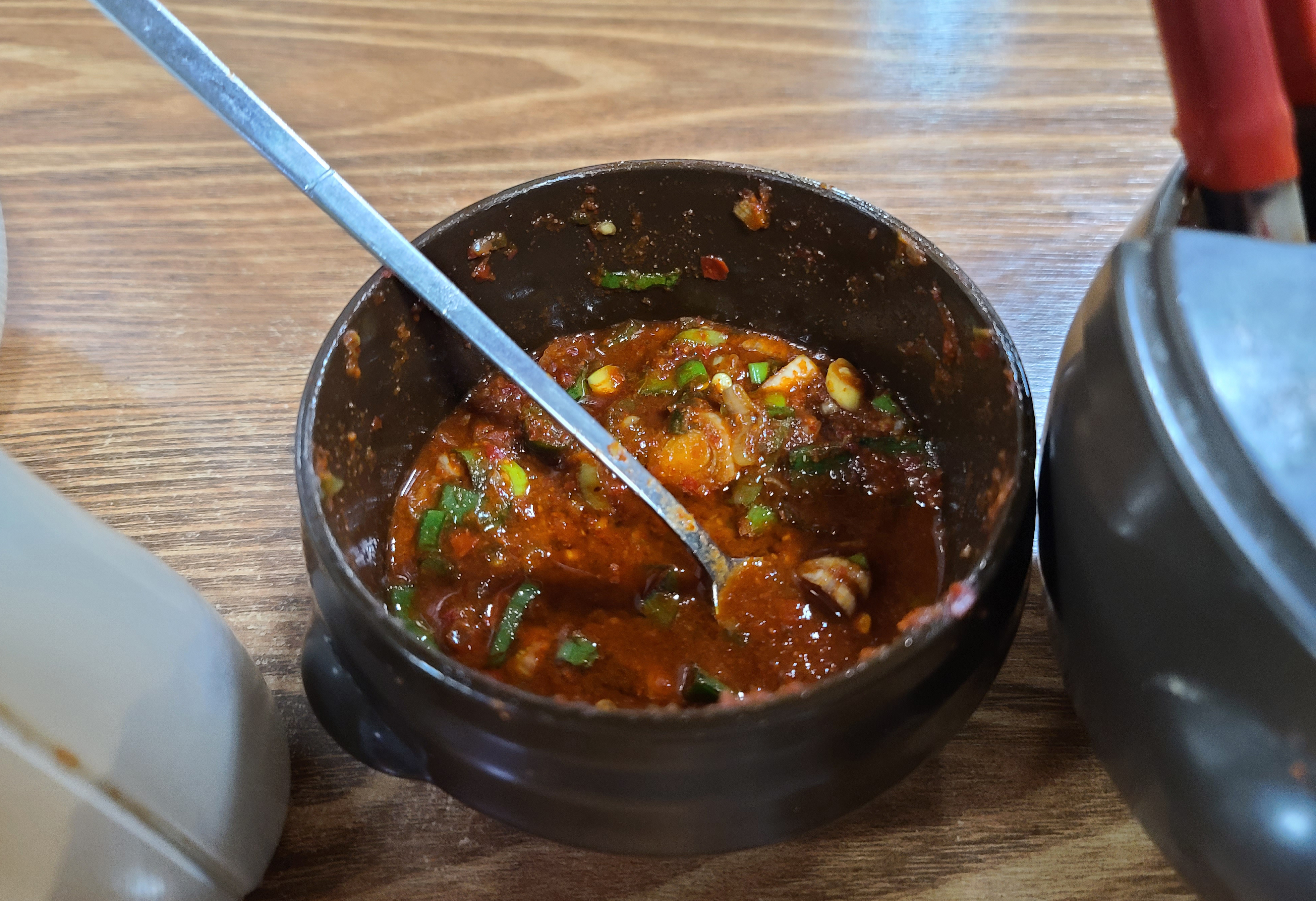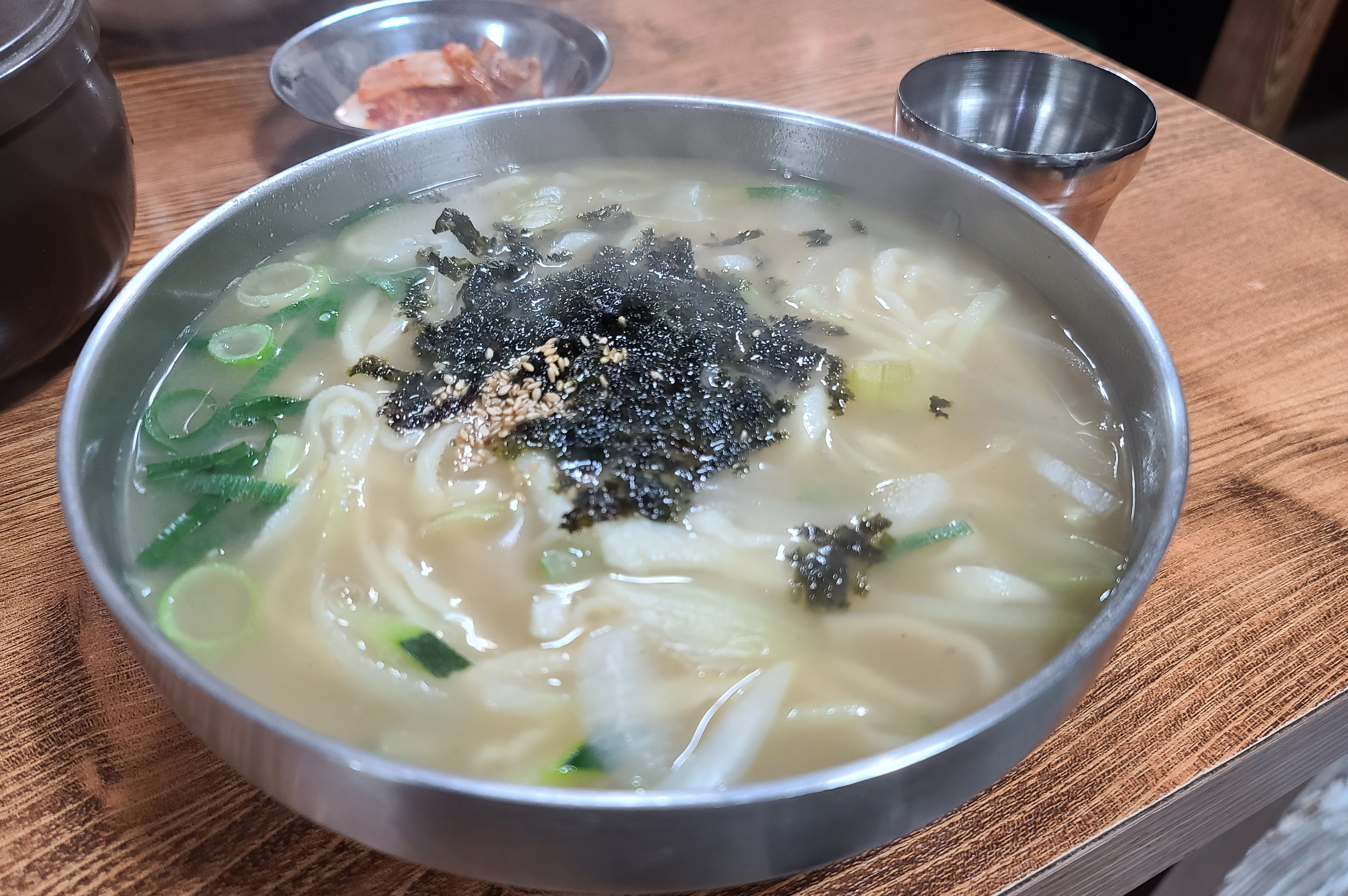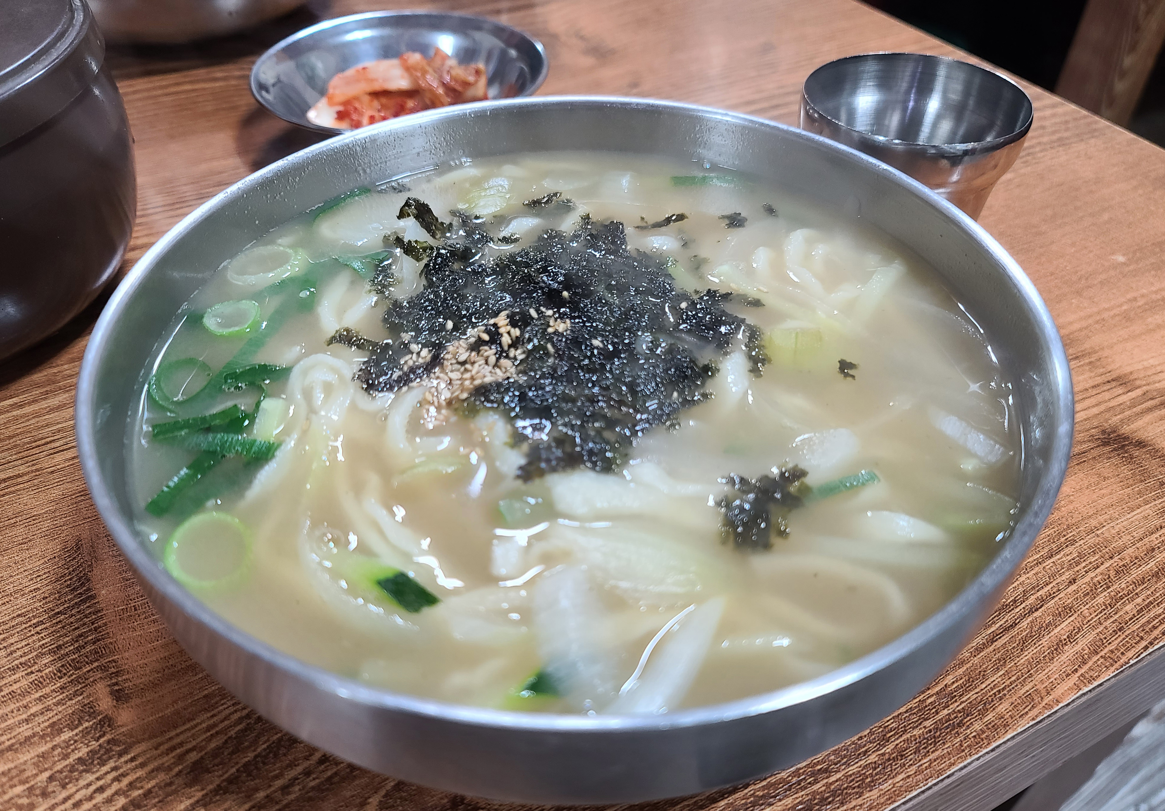 칼국수와 곁들이는 배추김치는 중국산이었고, 양념장이 함께 테이블에 놓여있어 기호에 맞게 먹을 수 있었습니다. 곧 칼국수가 나왔고, 칼국수는 큰 재료들은 없었지만, 대파, 호박, 양파 등 채소로 만든 칼국수였습니다. 면발은 조금 얇은 편이었지만, 손칼국수여서 그런지 더 쫀득쫀득한 식감이 있는 면이 좋았습니다.