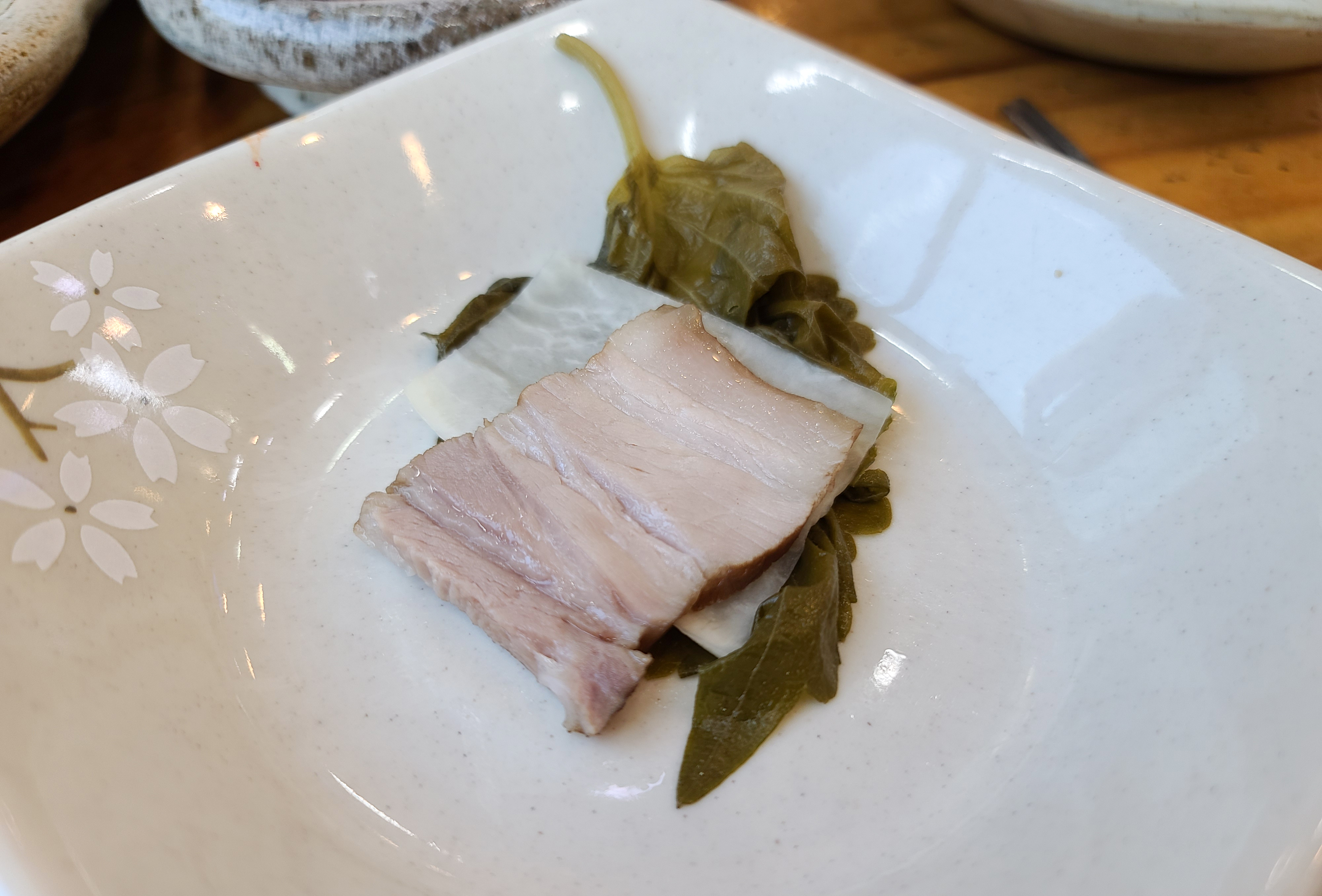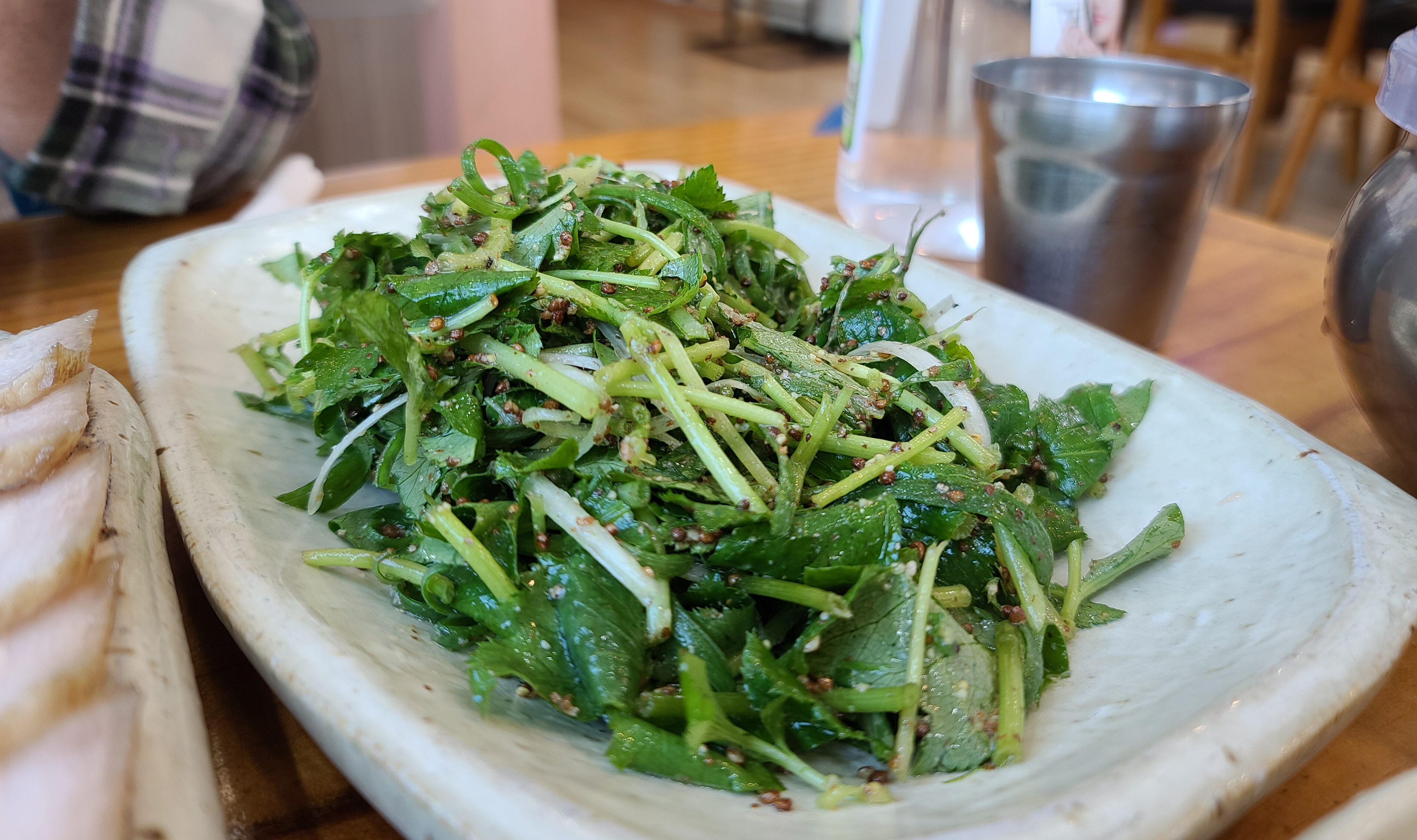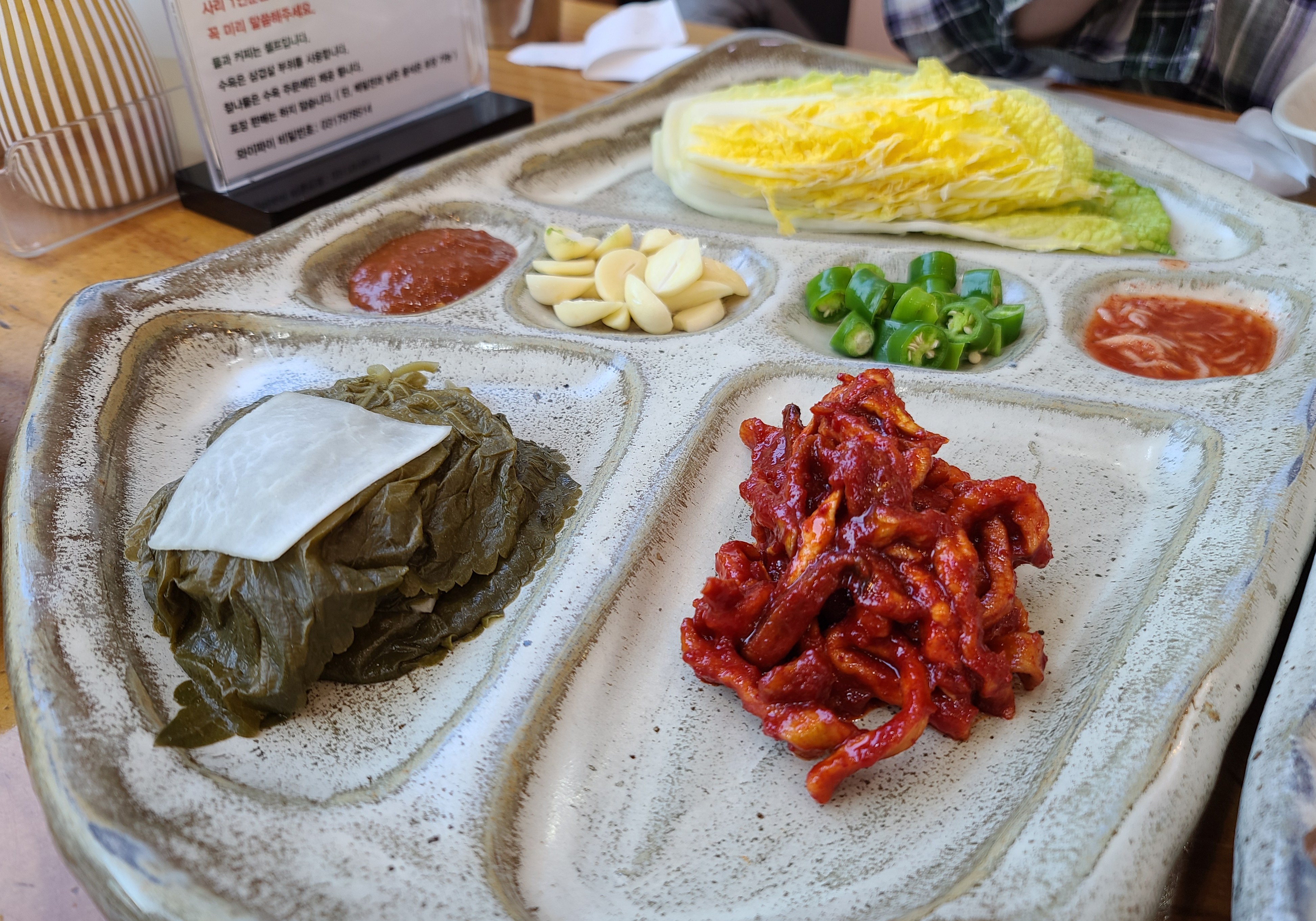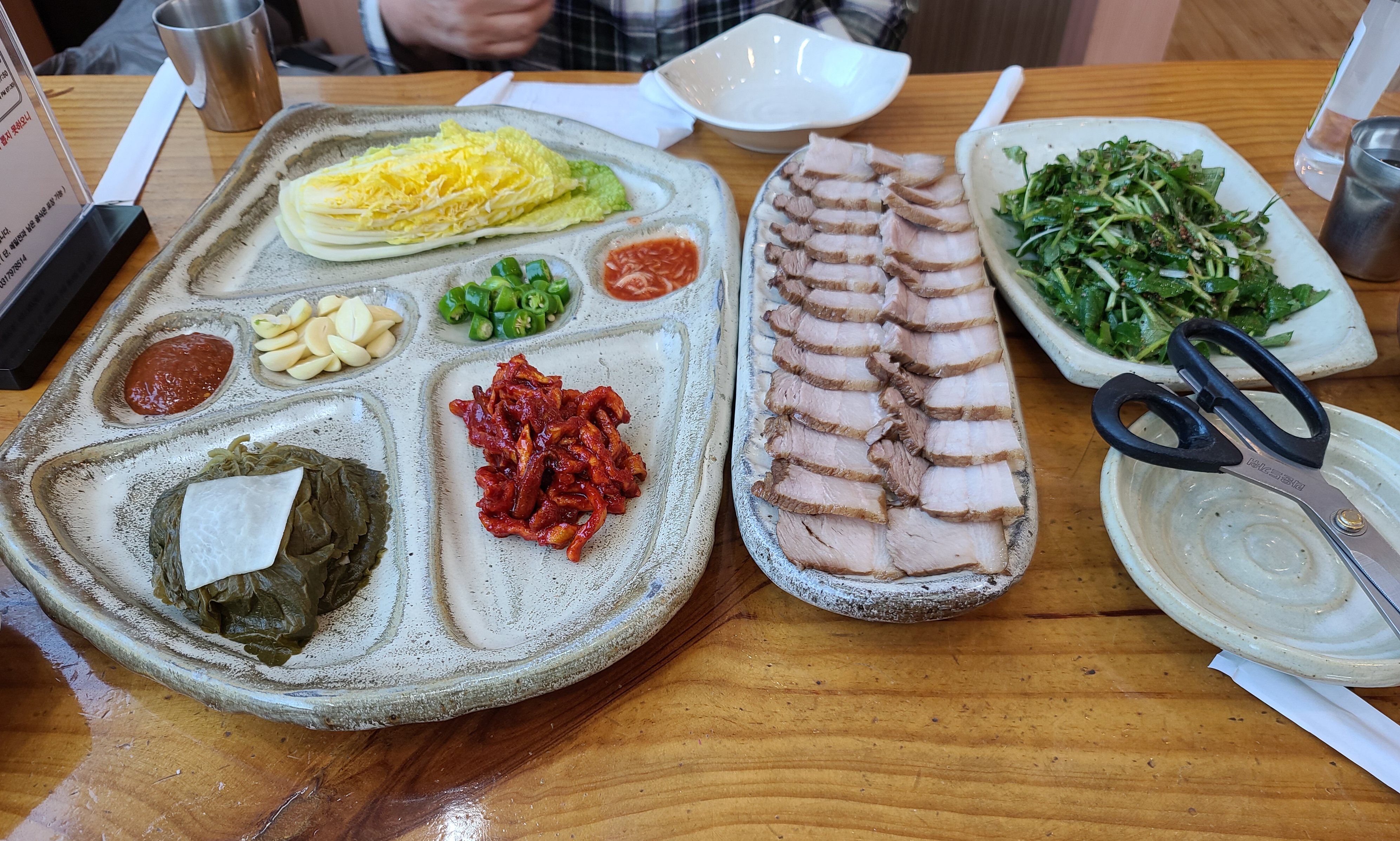 수육의 고기는 약간 뻣뻣한 감은 있었지만, 먹기에 괜찮았습니다. 깻잎쌈이랑 무말랭이와 함께 쌈을 싸서 먹었습니다. 가격이 22,000원인데 비하면 약간 아쉬운 느낌이 있었던 메뉴입니다.