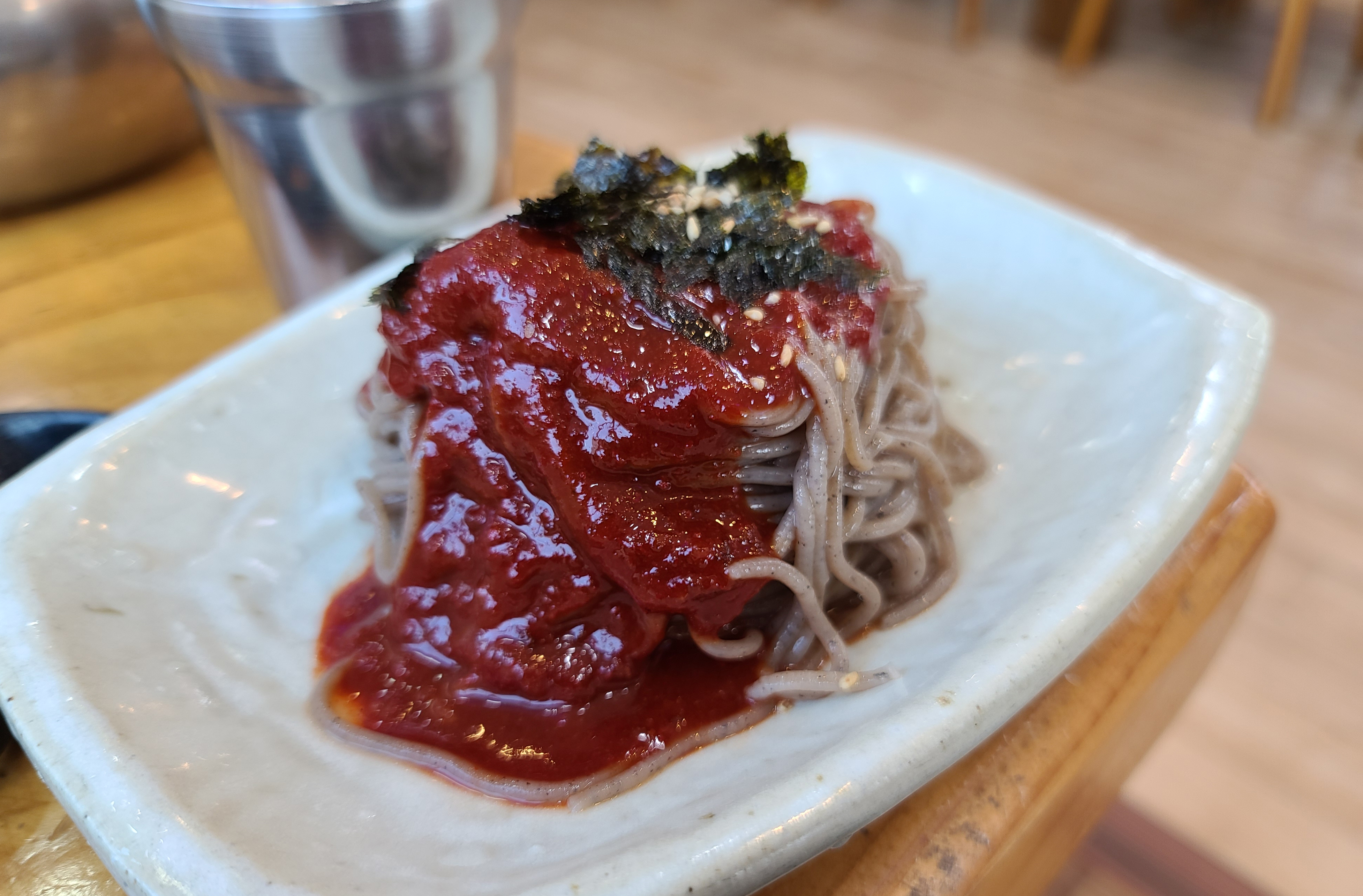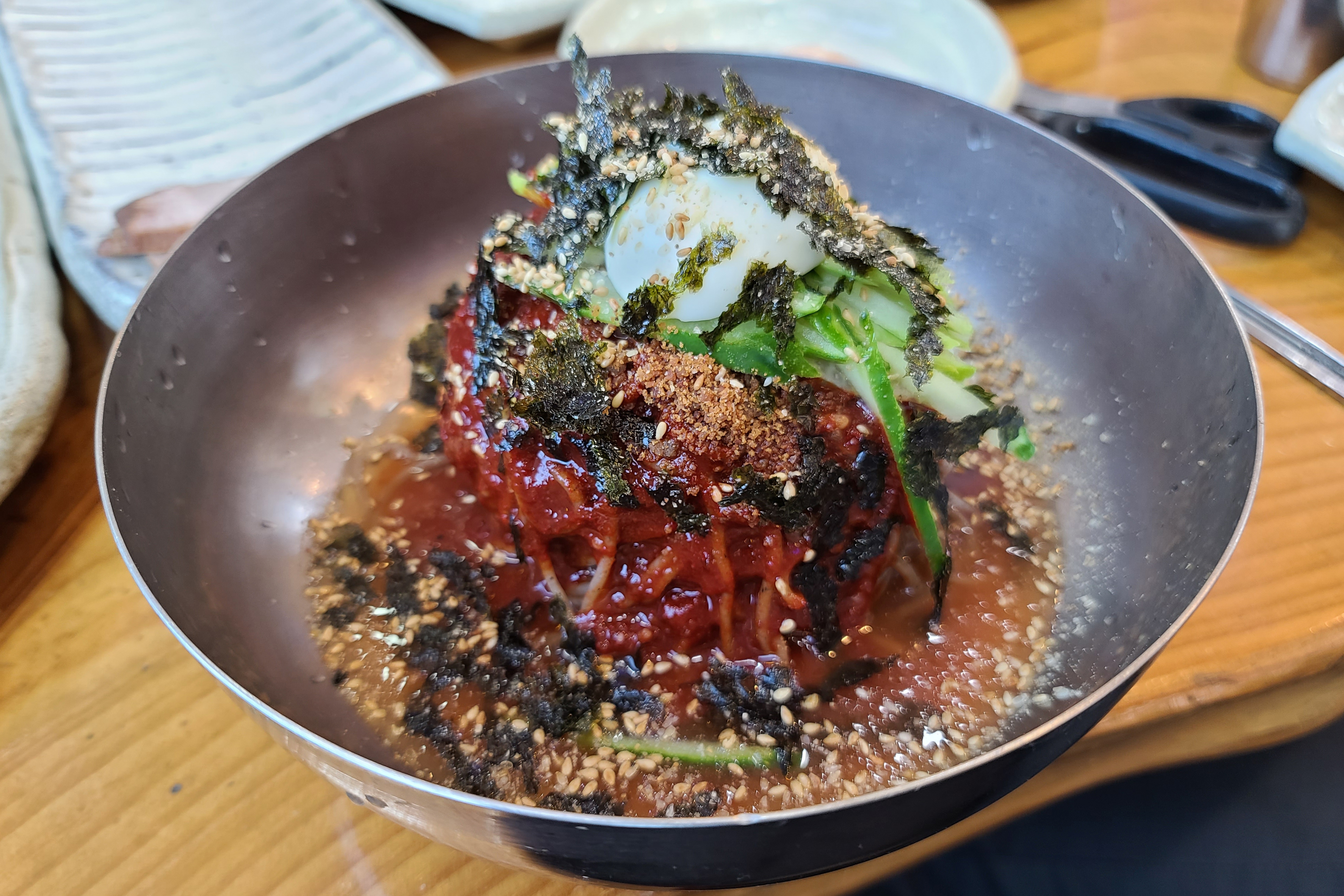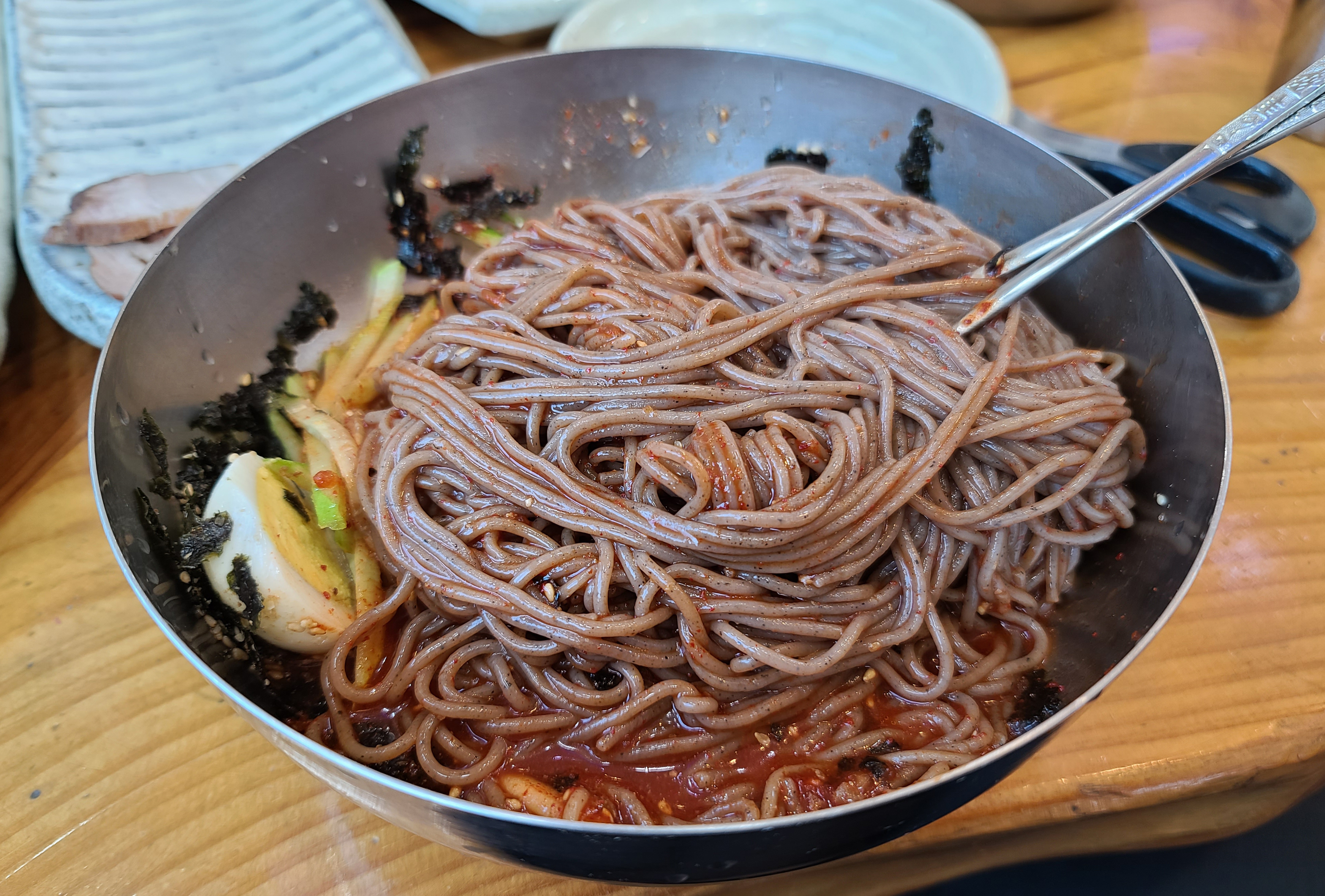 막국수와 사리를 같이 넣으니 양이 엄청 늘어났고, 막국수는 간이 자극적이지 않고 담백해서 맛있게 먹을 수 있었습니다. 막국수를 먹고 조금 아쉬운 느낌이 있어서 메밀전도 맛을 봤는데요,