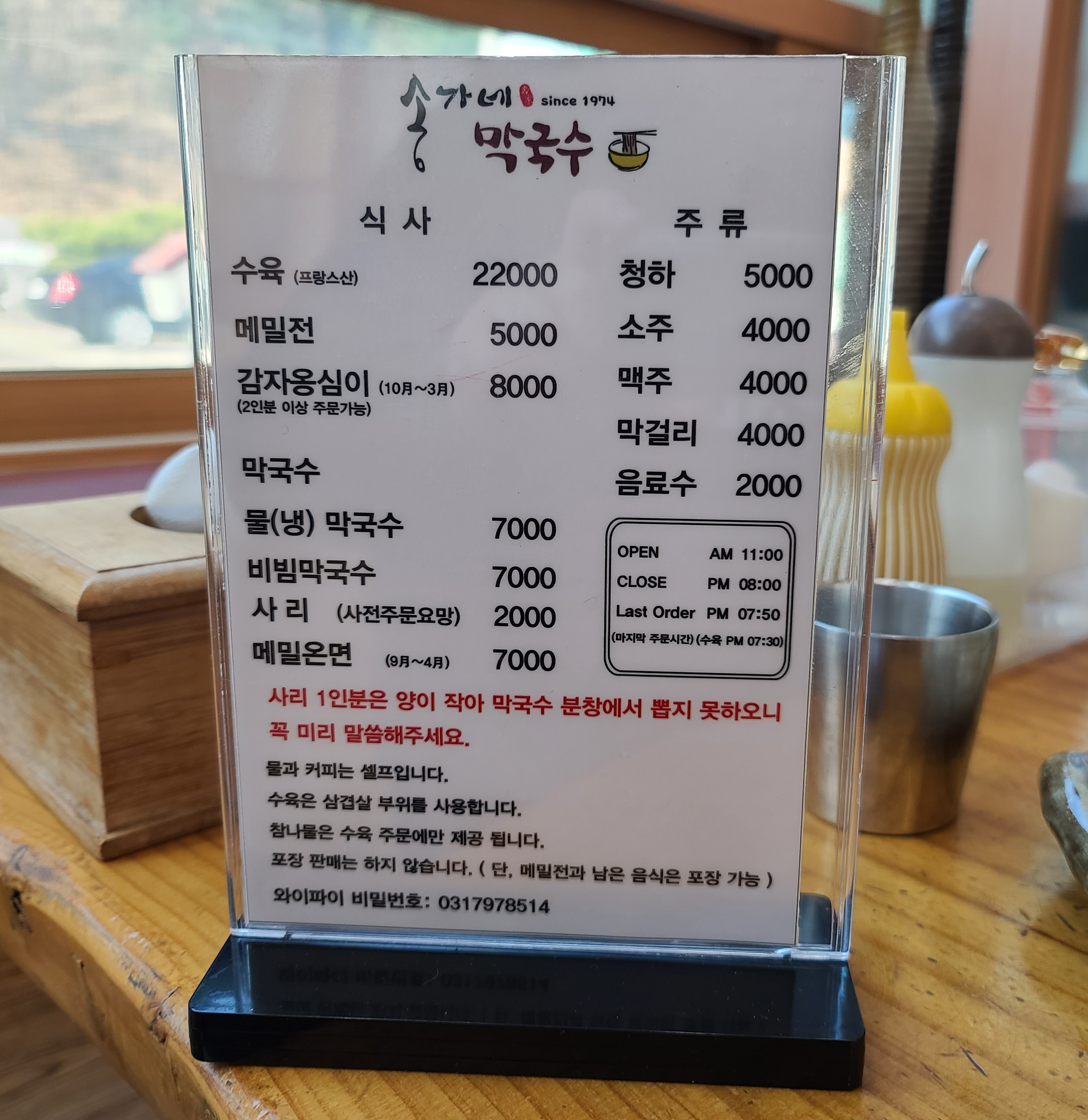 송가네막국수 메뉴는 수육, 메밀전, 감자옹심이, 물막국수, 비빔막국수, 사리, 메밀온면 등이 있었습니다. 저는 송가네 막국수의 수육, 메밀전, 비빔막국수 와 사리를 함께 주문했습니다.