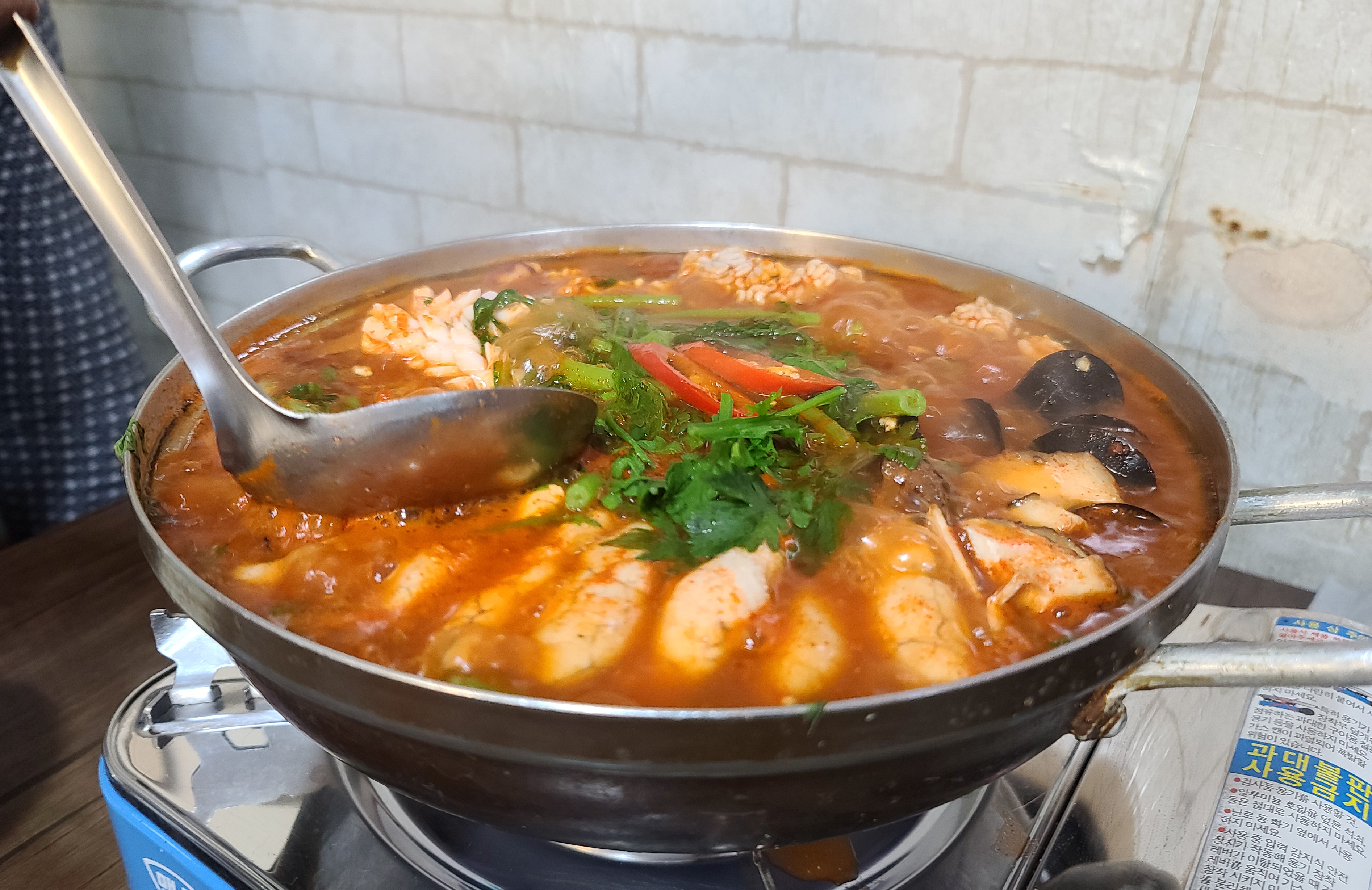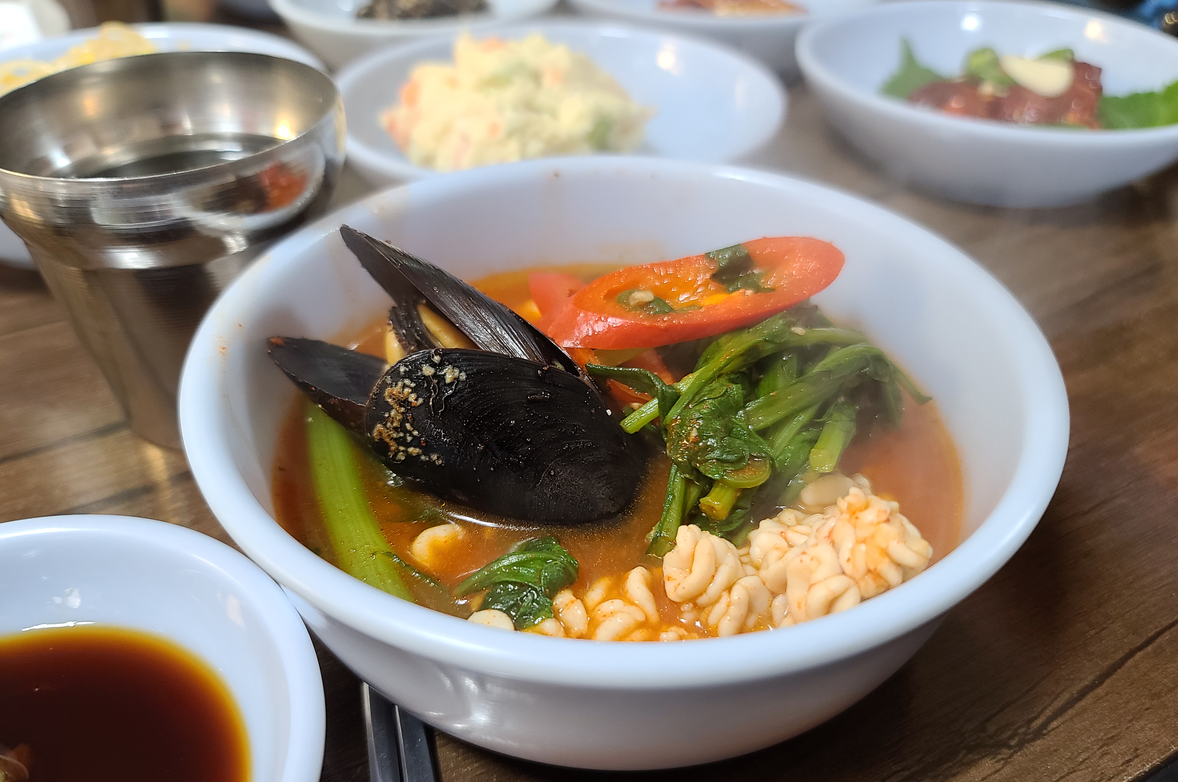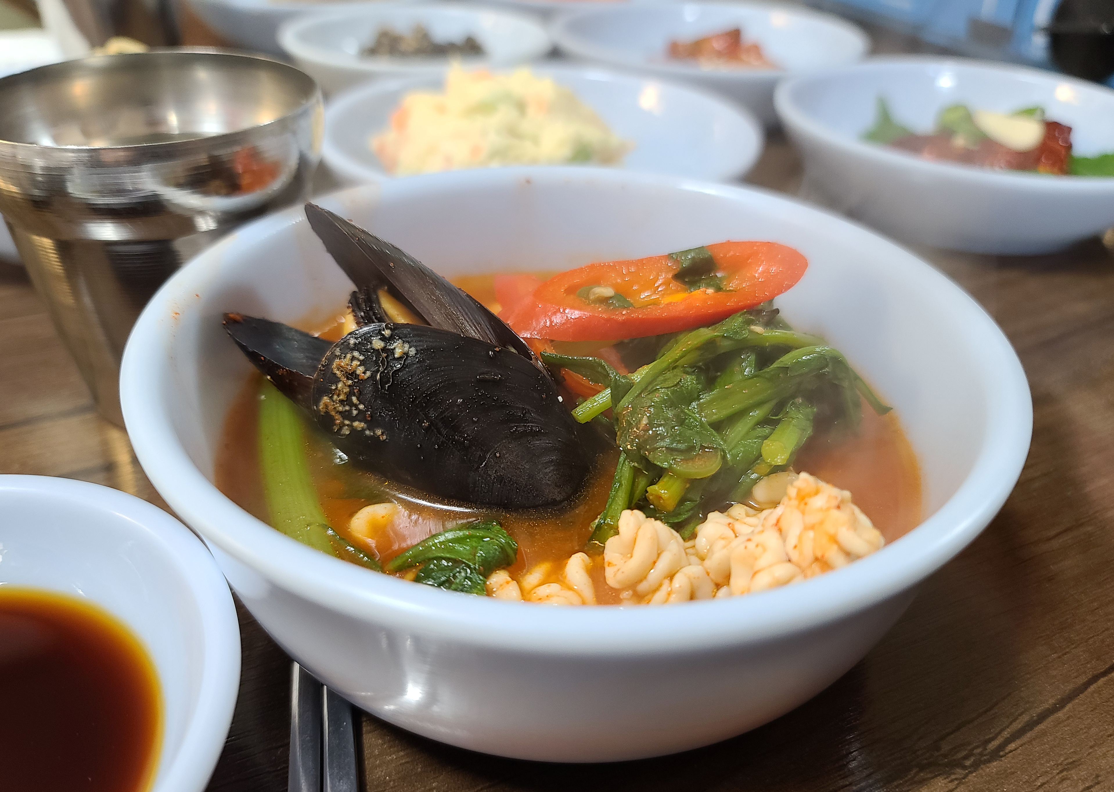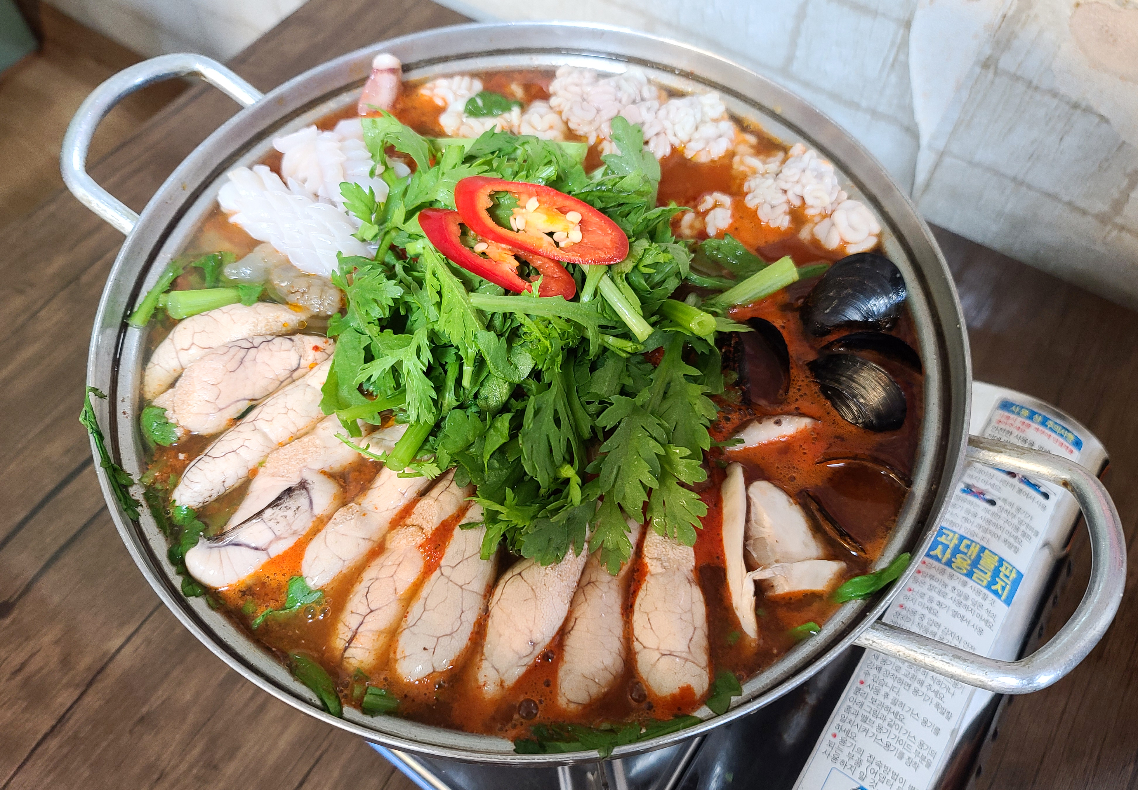 곧이어 메뉴가 자리에 나왔습니다. 알탕은 알과 곤이, 홍합 등이 들어간 메뉴였습니다. 밑반찬은 콩나물무침, 콩자반, 멸치볶음, 오징어젓갈, 마늘종, 배추김치, 샐러드가 나왔습니다.
