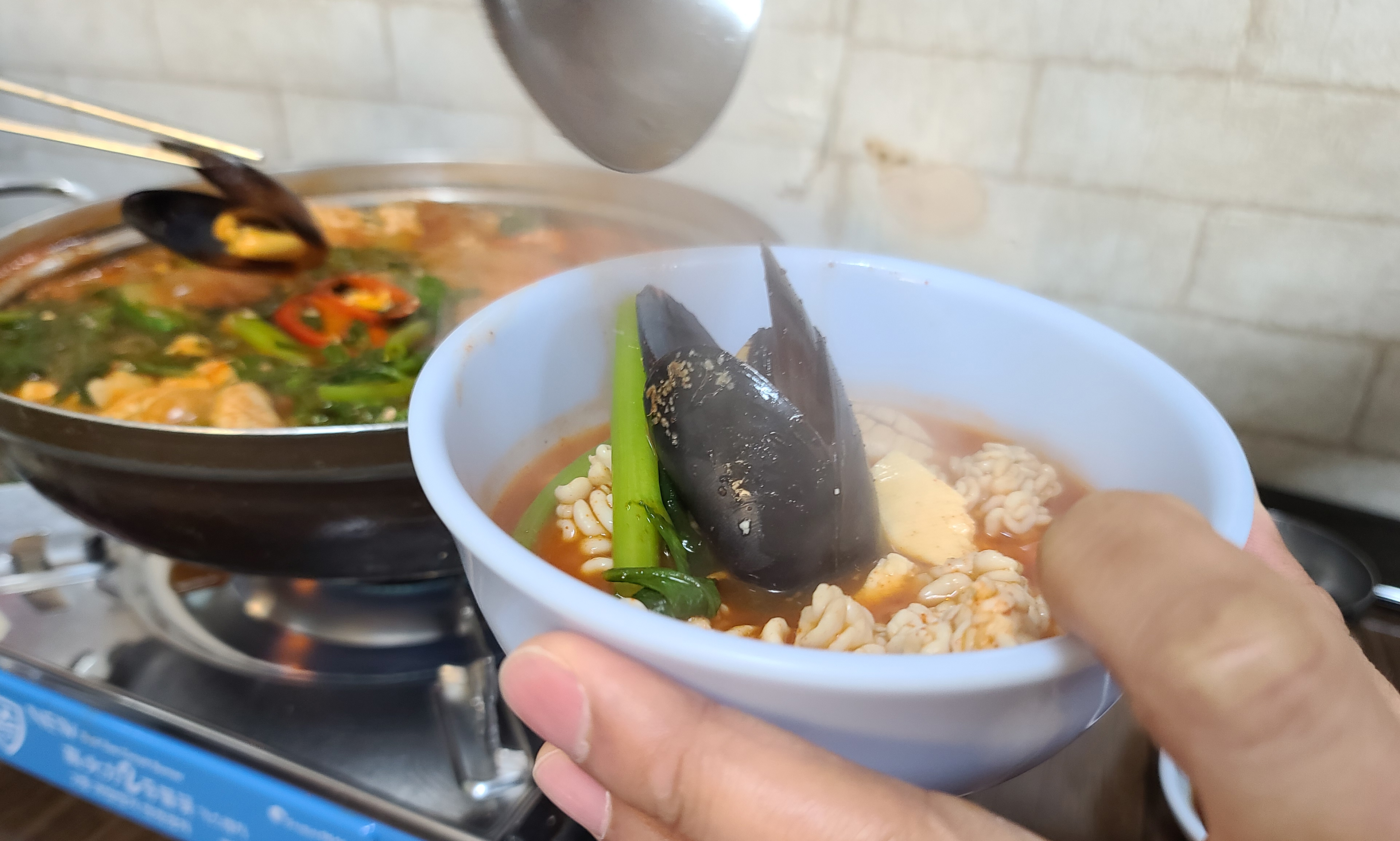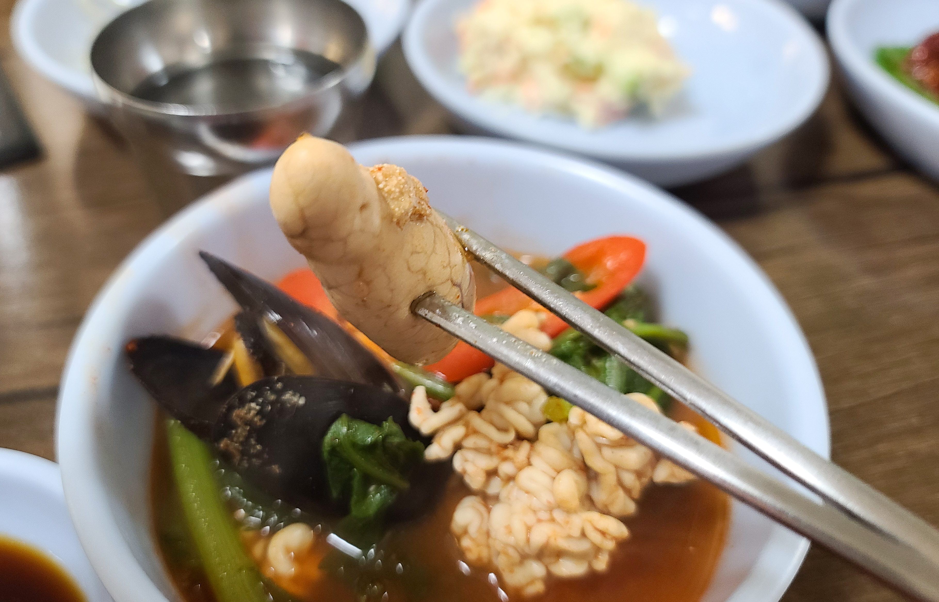 얼큰한 국물의 알탕이 맛있게 끓기 시작했고, 알과 곤이, 오징어, 홍합 그밖에 채소들이 익어갔습니다. 일 하고 계시는 아주머니에게 물어보니 익었다고 하여 알과 곤이 오징어 등을 그릇에 덜어내어 먹었습니다.