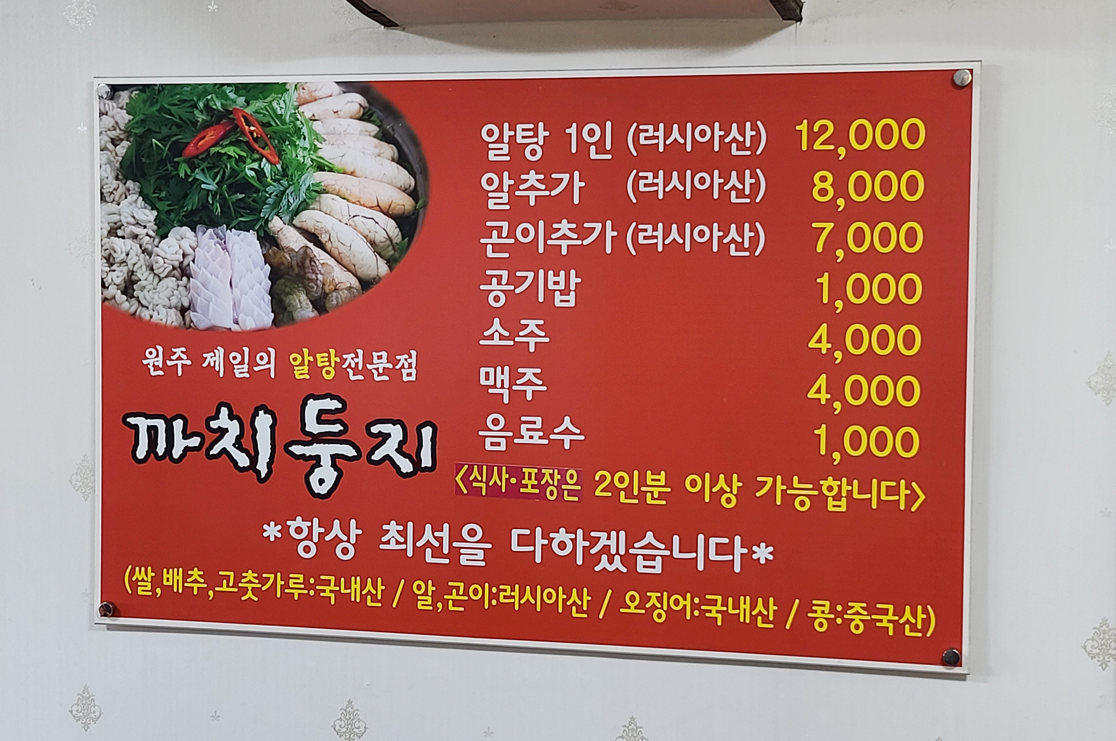 까치둥지의 메뉴는 알탕을 메인으로 알추가, 곤이추가 등이 있었습니다. 메뉴판에 "원주 제일의 알탕전문점" 이라는 문구도 눈에 띕니다. 금액은 1인 12,000원으로 크게 부담스럽지 않았습니다. 알과 곤이는 러시아산이고, 오징어는 국내산 재료를 사용하고 있었습니다.