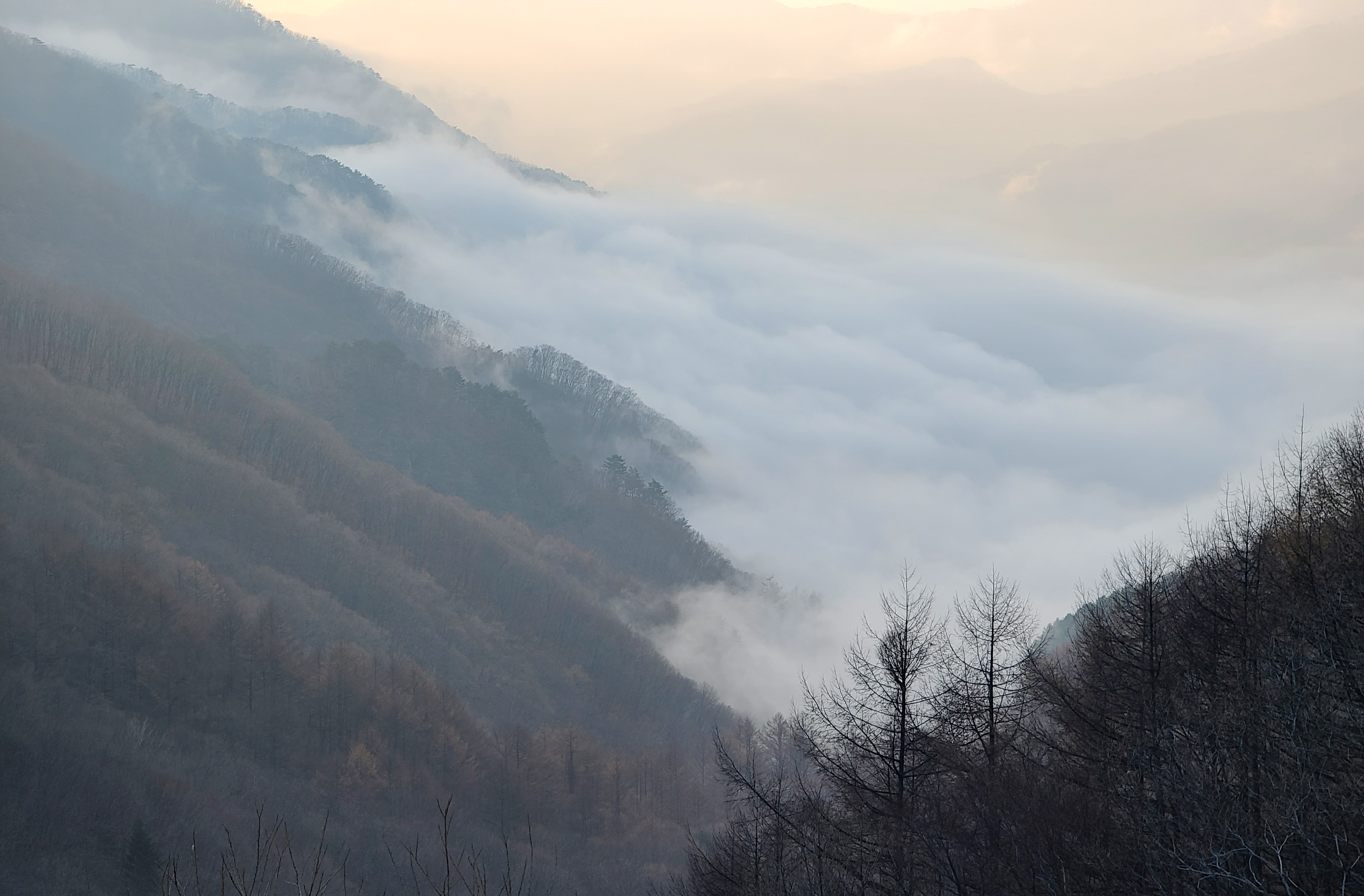 쌈지공원 전망대에서 저 멀리 운해가 보였습니다. 마치 산으로 바닷물이 차오른 것처럼 구름들이 펼쳐져있는데, 밤에 별 보는 풍경과 또 다른 멋진 장관을 볼 수 있어서 나름 밤새운 게 뿌듯하더라고요.