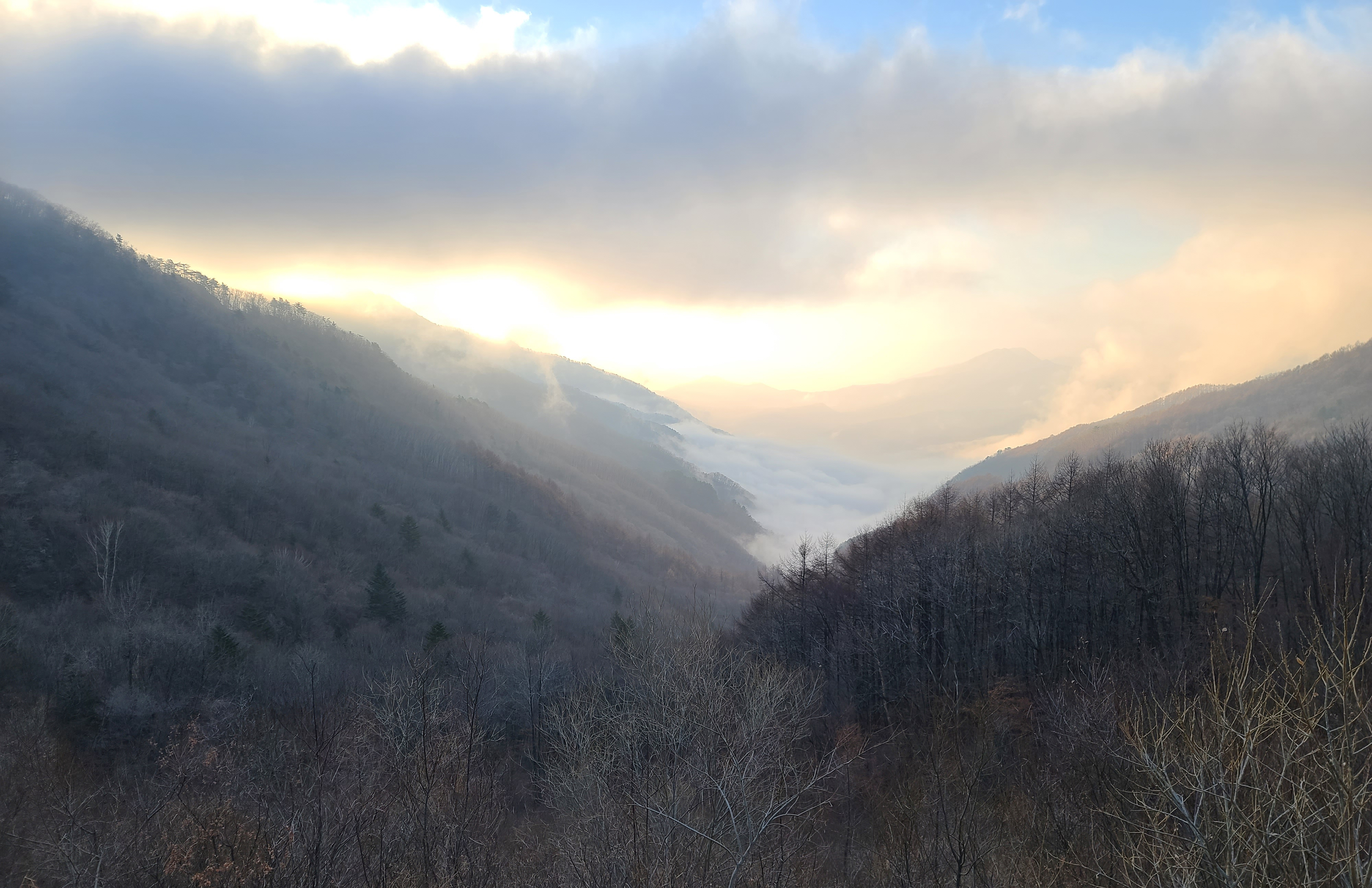 쌈지공원 전망대에서 저 멀리 운해가 보였습니다. 마치 산으로 바닷물이 차오른 것처럼 구름들이 펼쳐져있는데, 밤에 별 보는 풍경과 또 다른 멋진 장관을 볼 수 있어서 나름 밤새운 게 뿌듯하더라고요.