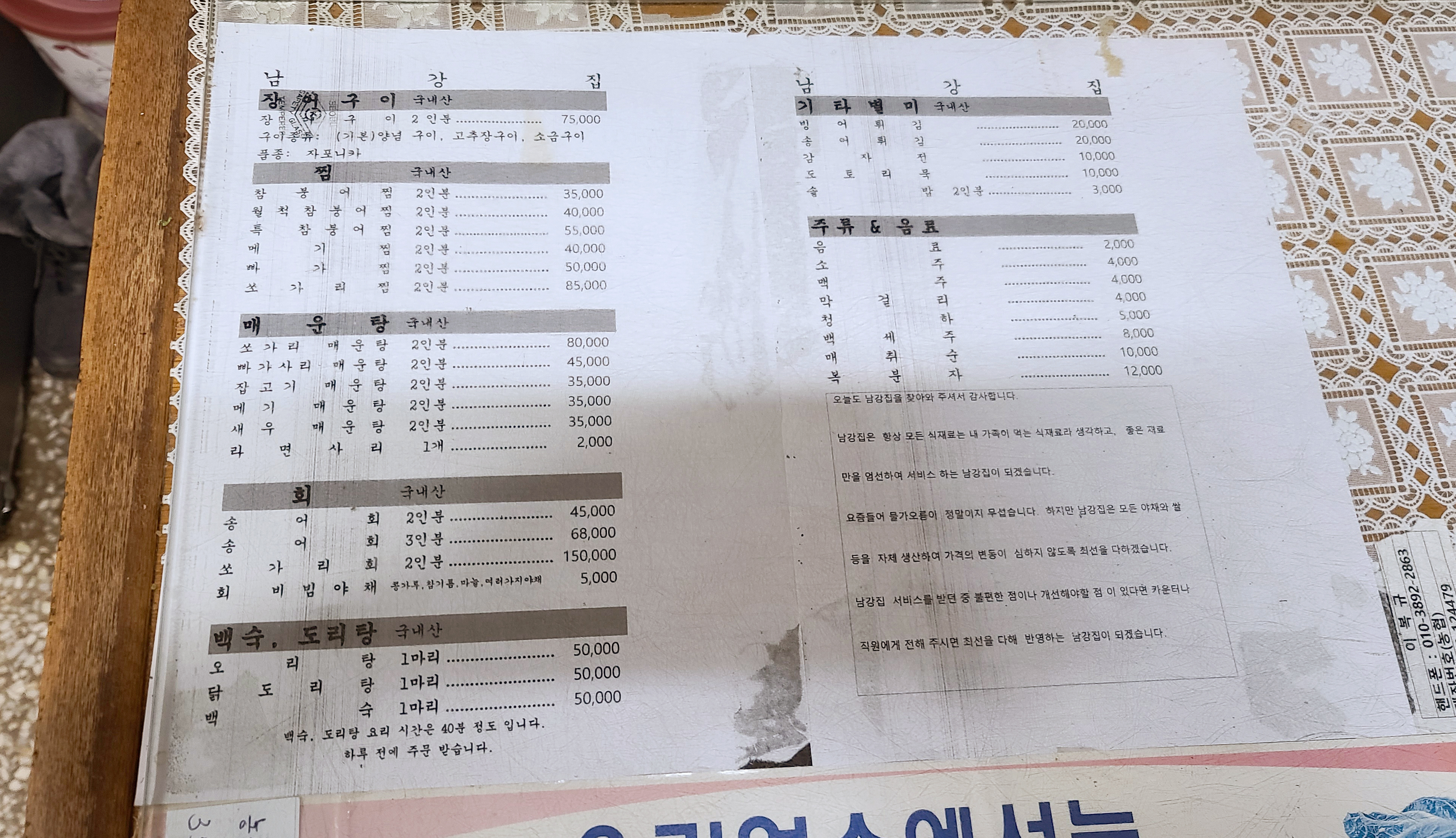 경기 광주 남강집의 메뉴는 위와 같습니다. 장어구이, 참붕어찜, 월척참붕어찜, 특참붕어찜, 메기찜, 빠가찜, 쏘가리찜, 송어회, 쏘가리회, 회, 쏘가리매운탕, 빠가사리매운탕, 잡고기매운탕, 메기매운탕, 새우매운탕, 라면사리, 오리탕, 닭도리탕, 백숙, 빙어튀김, 송어튀김, 감자전, 도토리묵, 솥밥 등이 있었습니다. 모든 재료는 국내산을 이용하고 있었고, 농산물 또한 자가 경작하여 가격을 최대한 유지하기 위해 노력하고 있다고 하더라고요. 저는 메기 매운탕을 먹었습니다.