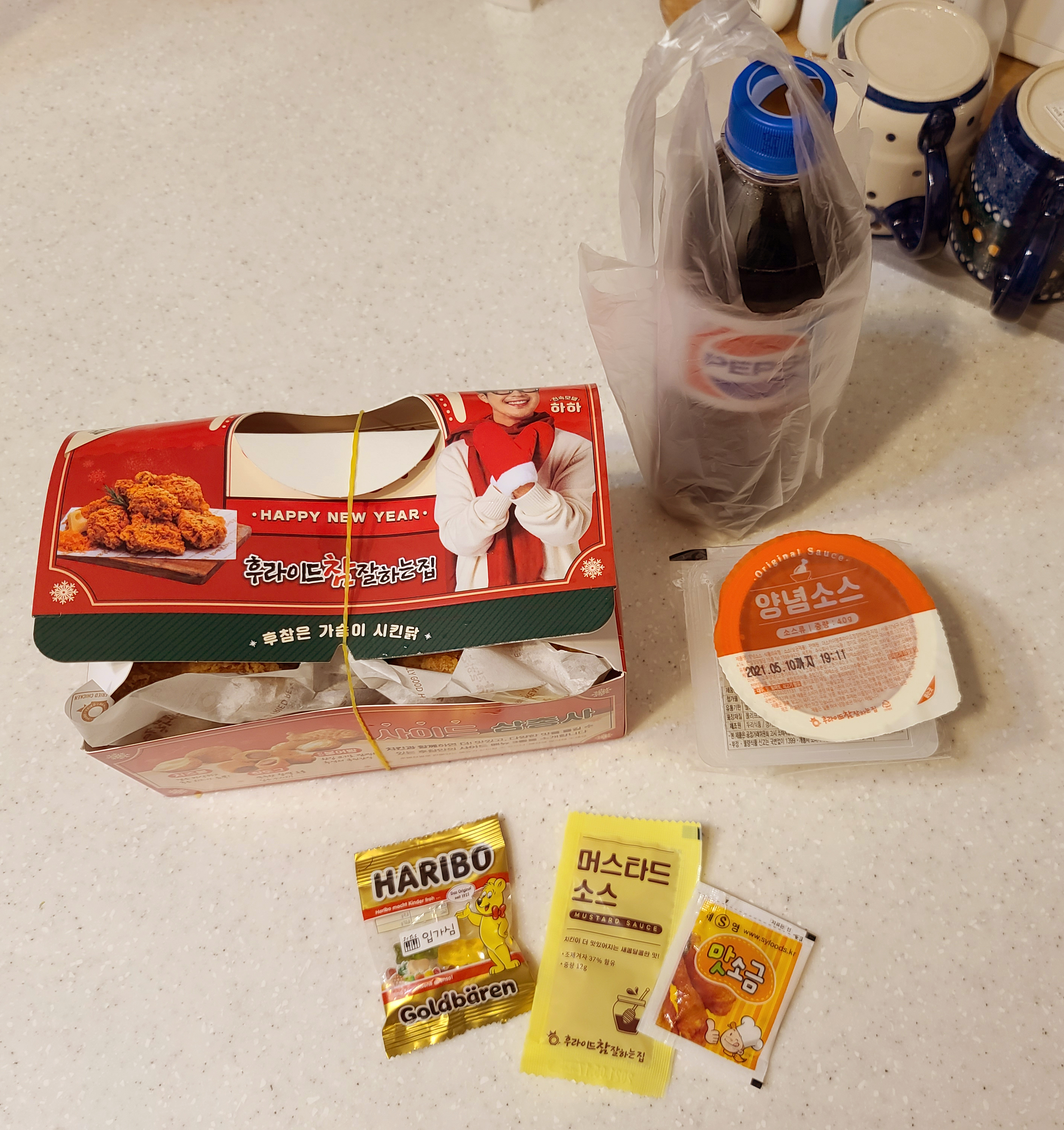 후라이드참잘하는집에 치킨을 주문하면, 주문한 치킨에 양념소스, 머스타드소스, 맛소금, 치킨무, 콜라, 간식까지 제공해주고 있었습니다. 가격도 타 치킨 브랜드에 비해 저렴한 편이고, 맛도 괜찮으면서 서비스도 좋아서 가끔씩 생각나게 하는 것 같습니다.