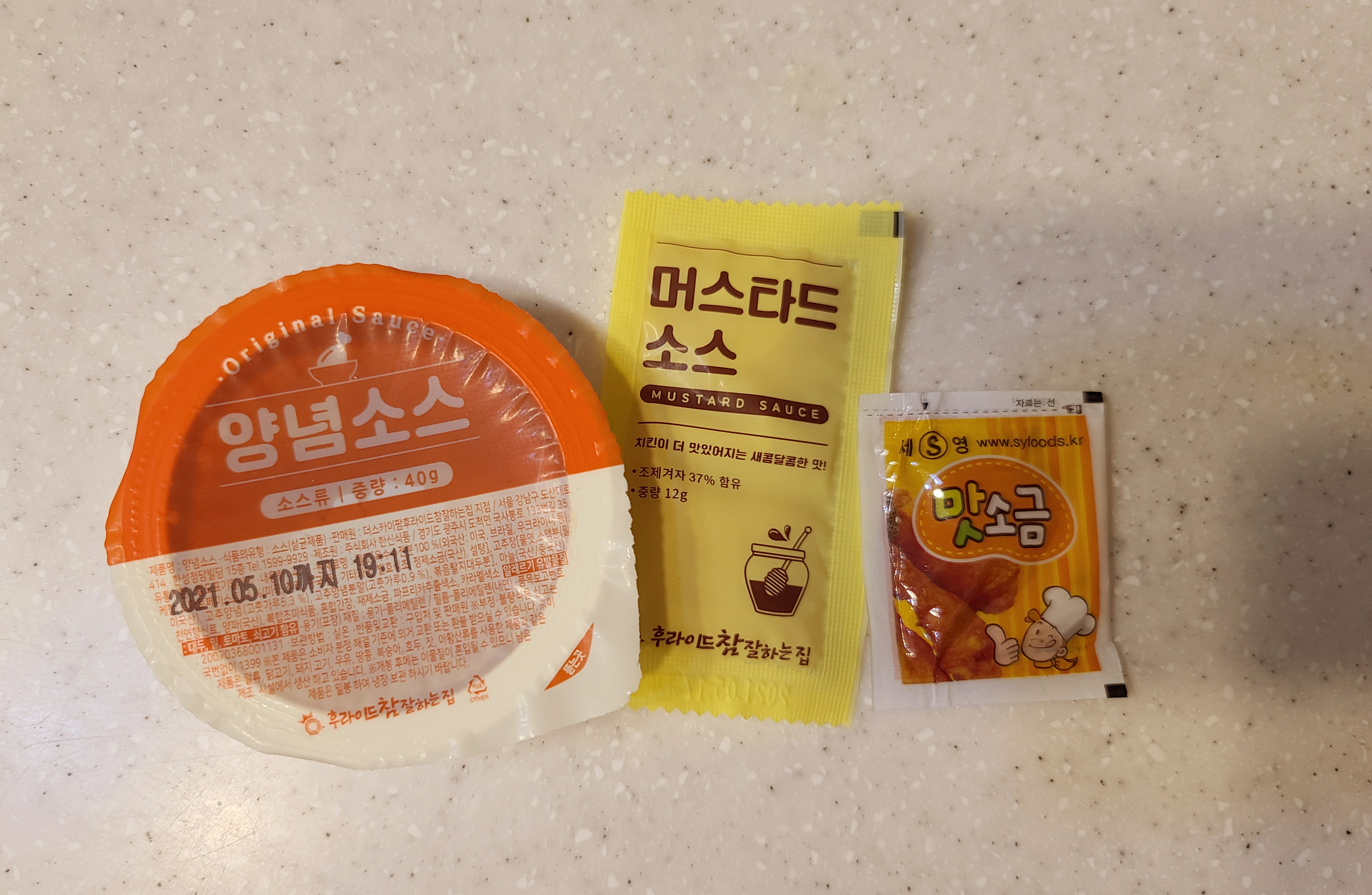 후라이드참잘하는집에 치킨을 주문하면, 주문한 치킨에 양념소스, 머스타드소스, 맛소금, 치킨무, 콜라, 간식까지 제공해주고 있었습니다. 가격도 타 치킨 브랜드에 비해 저렴한 편이고, 맛도 괜찮으면서 서비스도 좋아서 가끔씩 생각나게 하는 것 같습니다.
