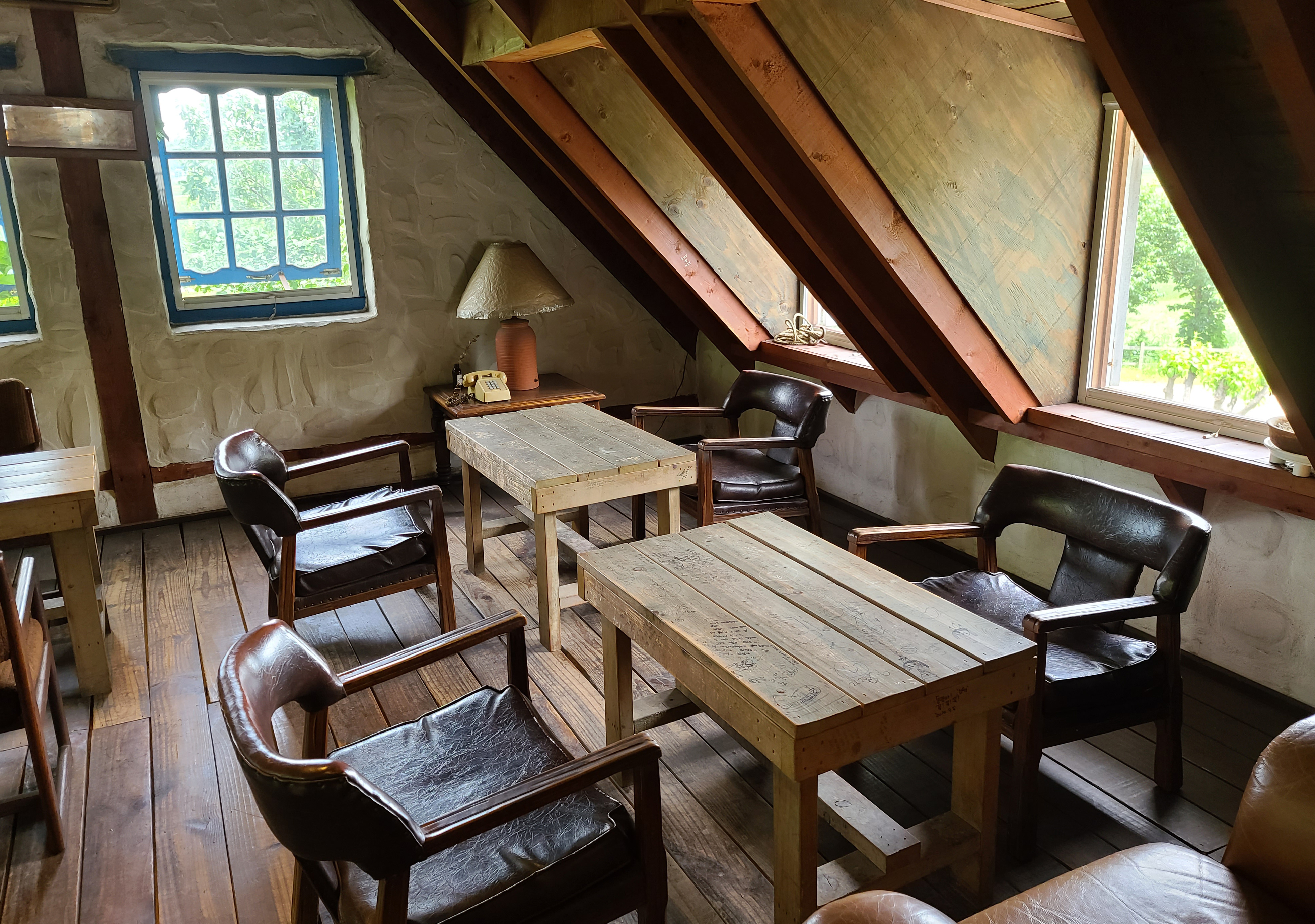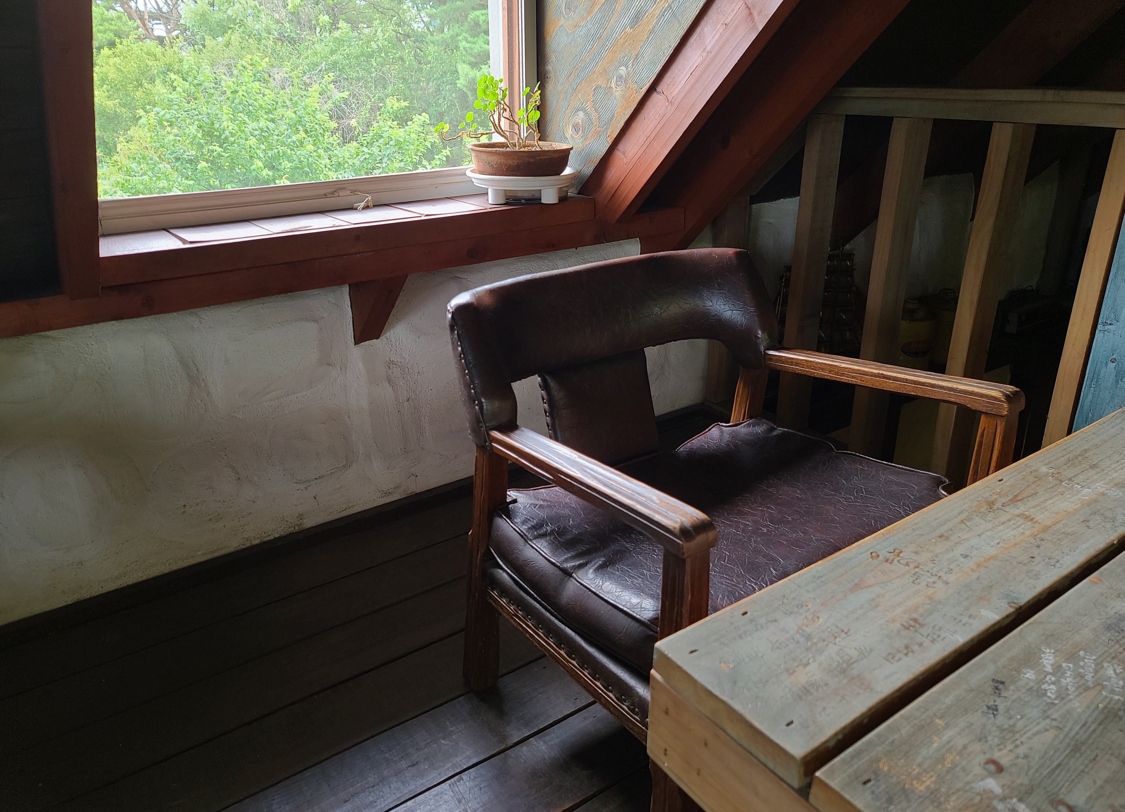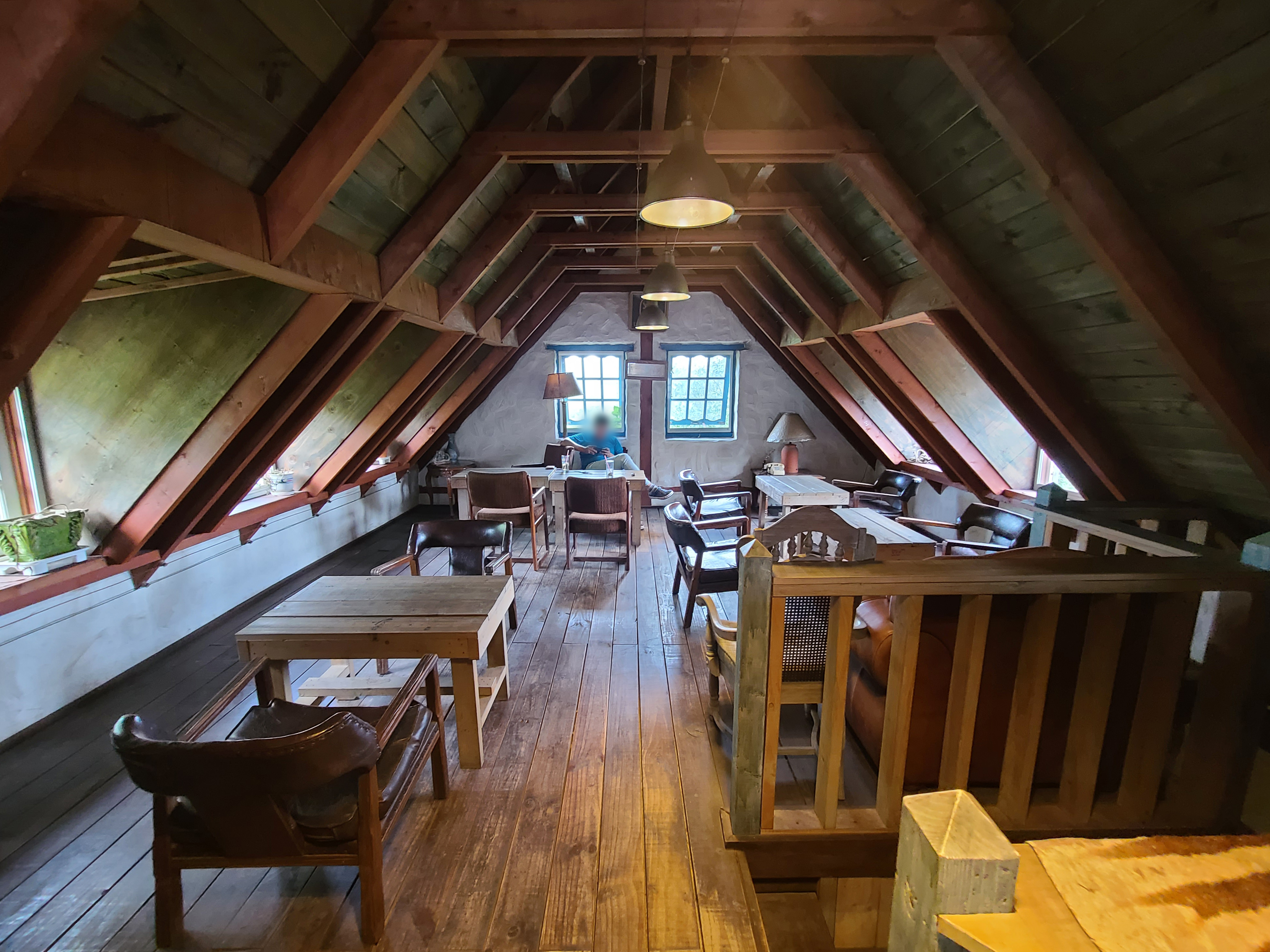 그리고, 2층은 제가 즐겨 이용하는 공간입니다. 박공형 지붕으로 되어있는 2층은 여름이나 봄에 가면 나뭇잎의 푸르름을 온전히 볼 수 있고, 따로 냉방을 하지 않아도 시원한 기운을 느낄 수 있어서 선호하는 곳입니다. 특히 비 올 때 2층에서 혼자 조용히 음악을 듣고 있으면, 기분이 더 묘하게 좋더라고요.