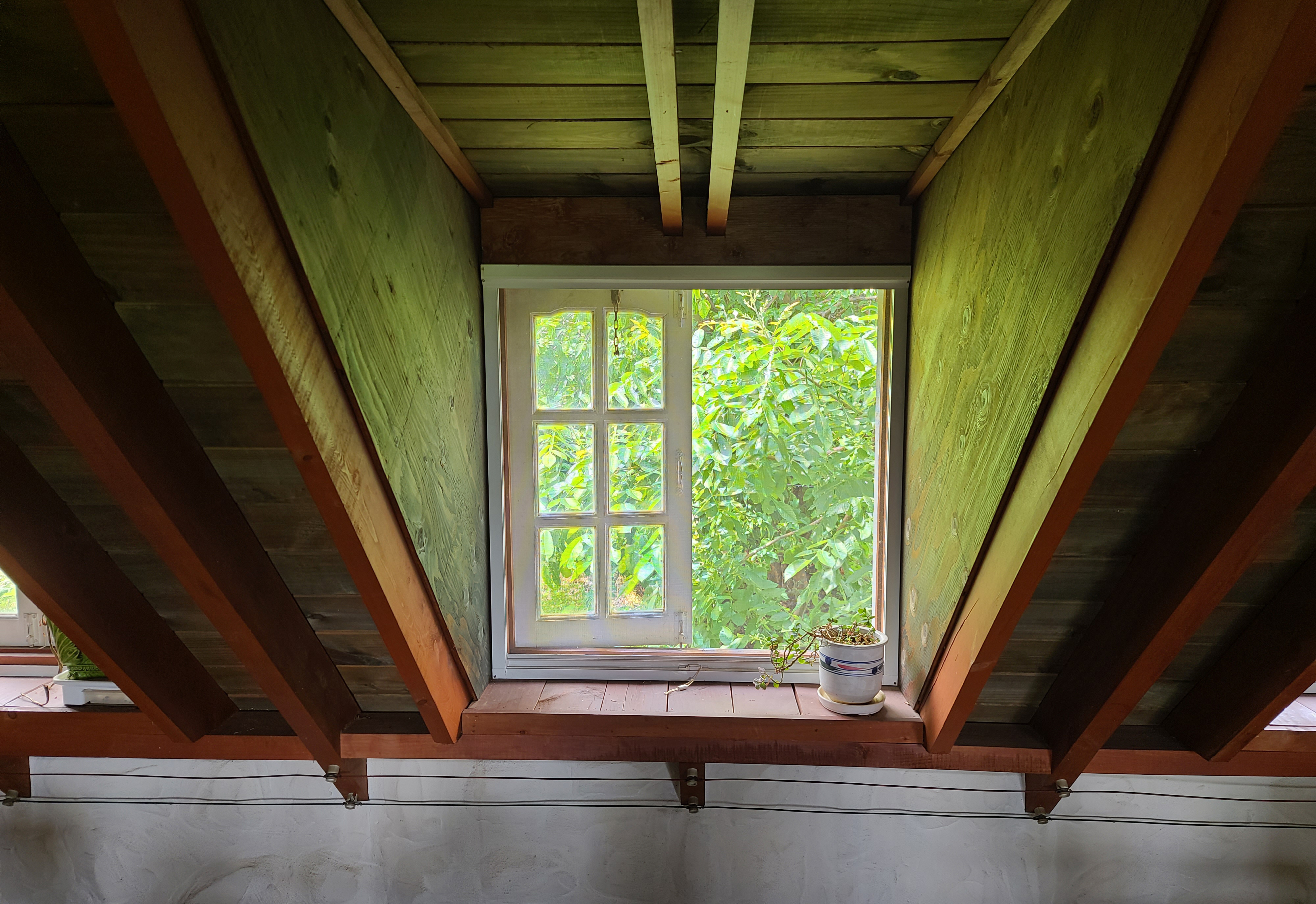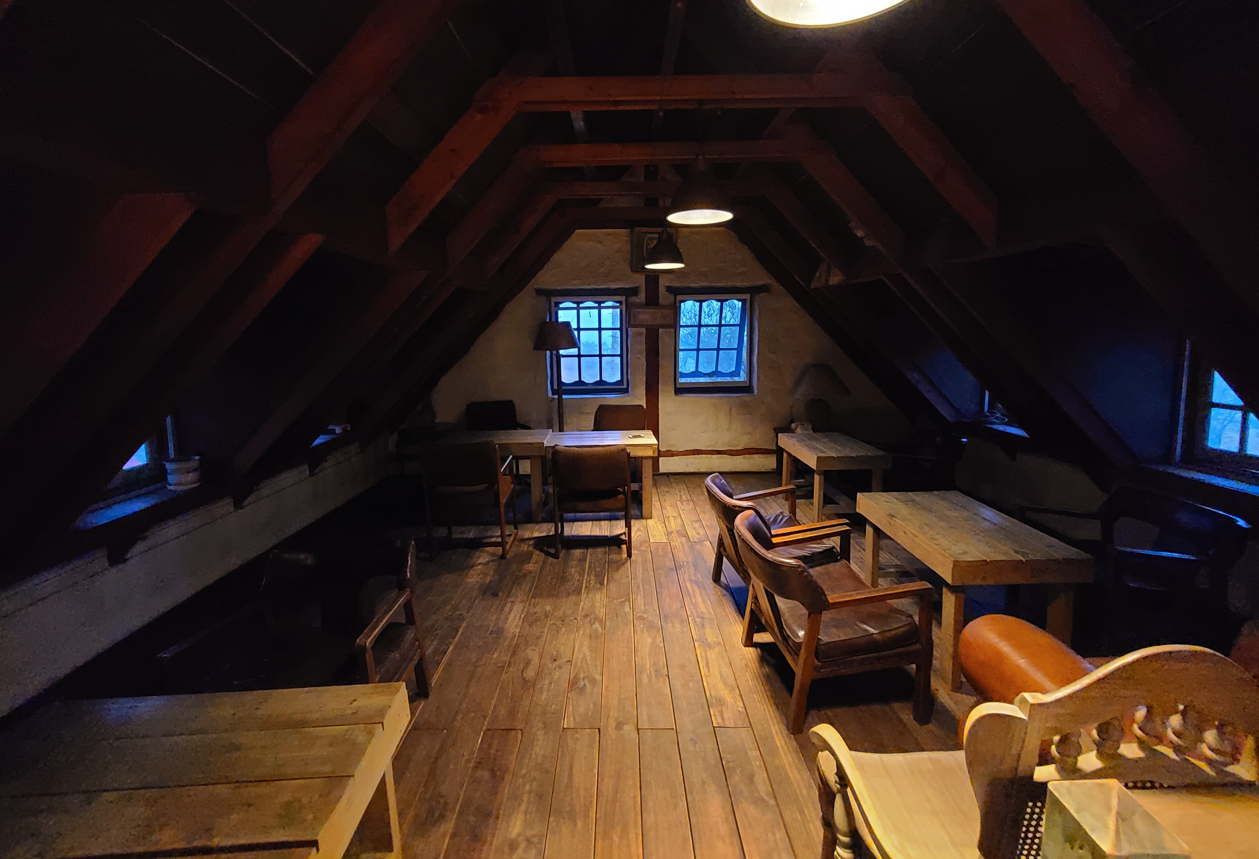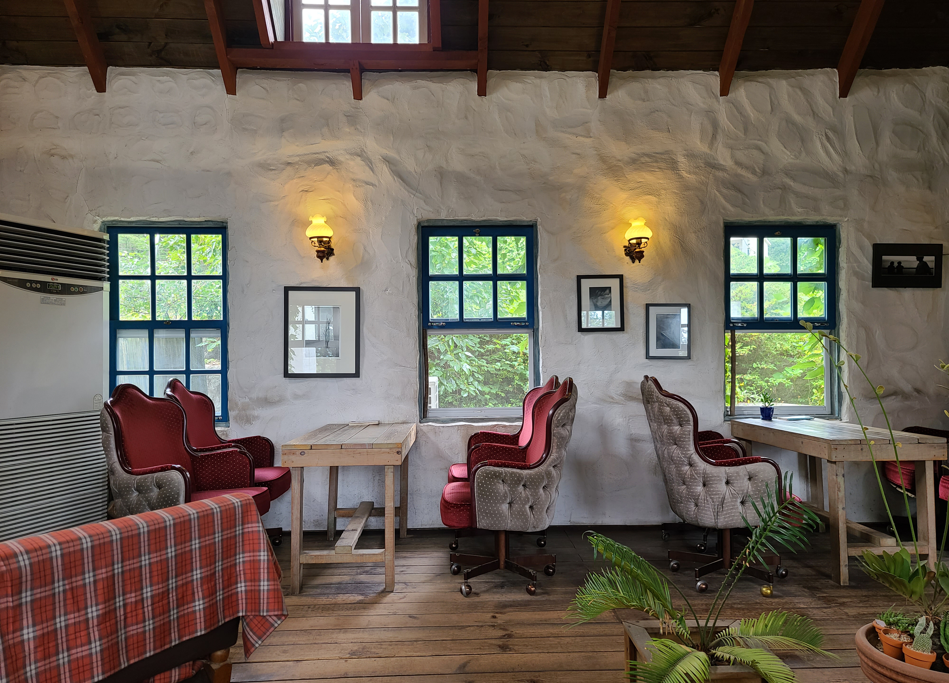 그리고, 2층은 제가 즐겨 이용하는 공간입니다. 박공형 지붕으로 되어있는 2층은 여름이나 봄에 가면 나뭇잎의 푸르름을 온전히 볼 수 있고, 따로 냉방을 하지 않아도 시원한 기운을 느낄 수 있어서 선호하는 곳입니다. 특히 비 올 때 2층에서 혼자 조용히 음악을 듣고 있으면, 기분이 더 묘하게 좋더라고요.