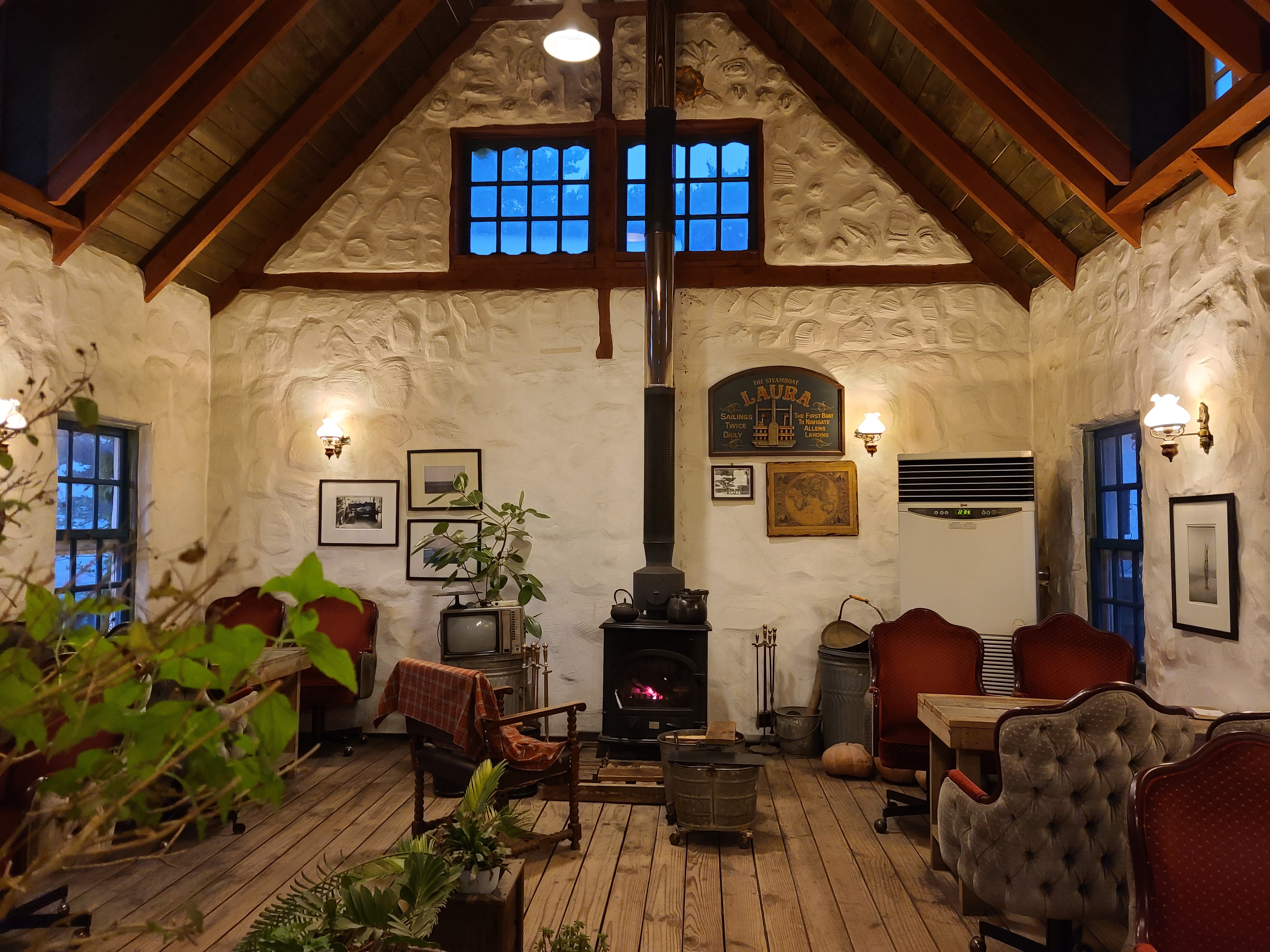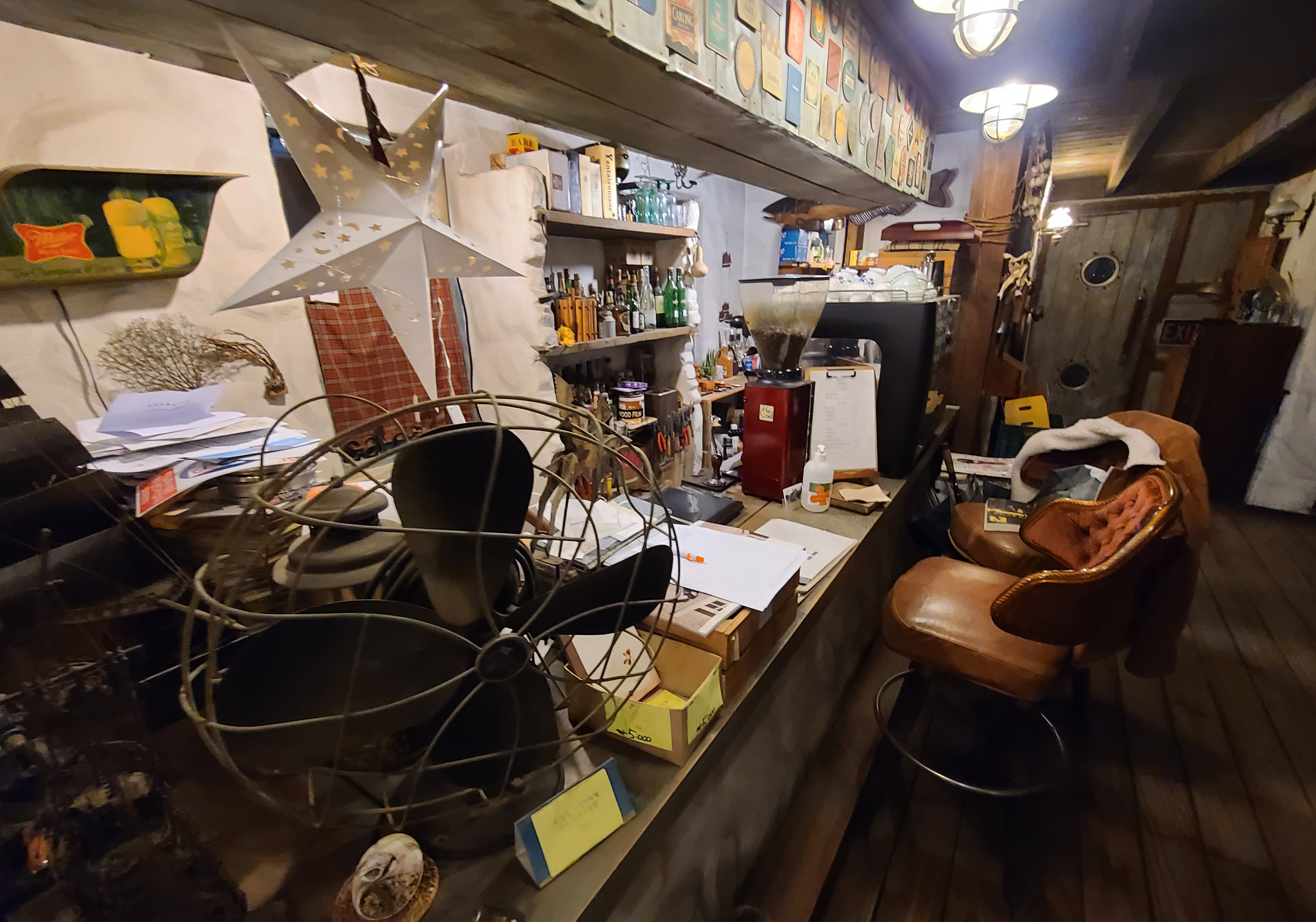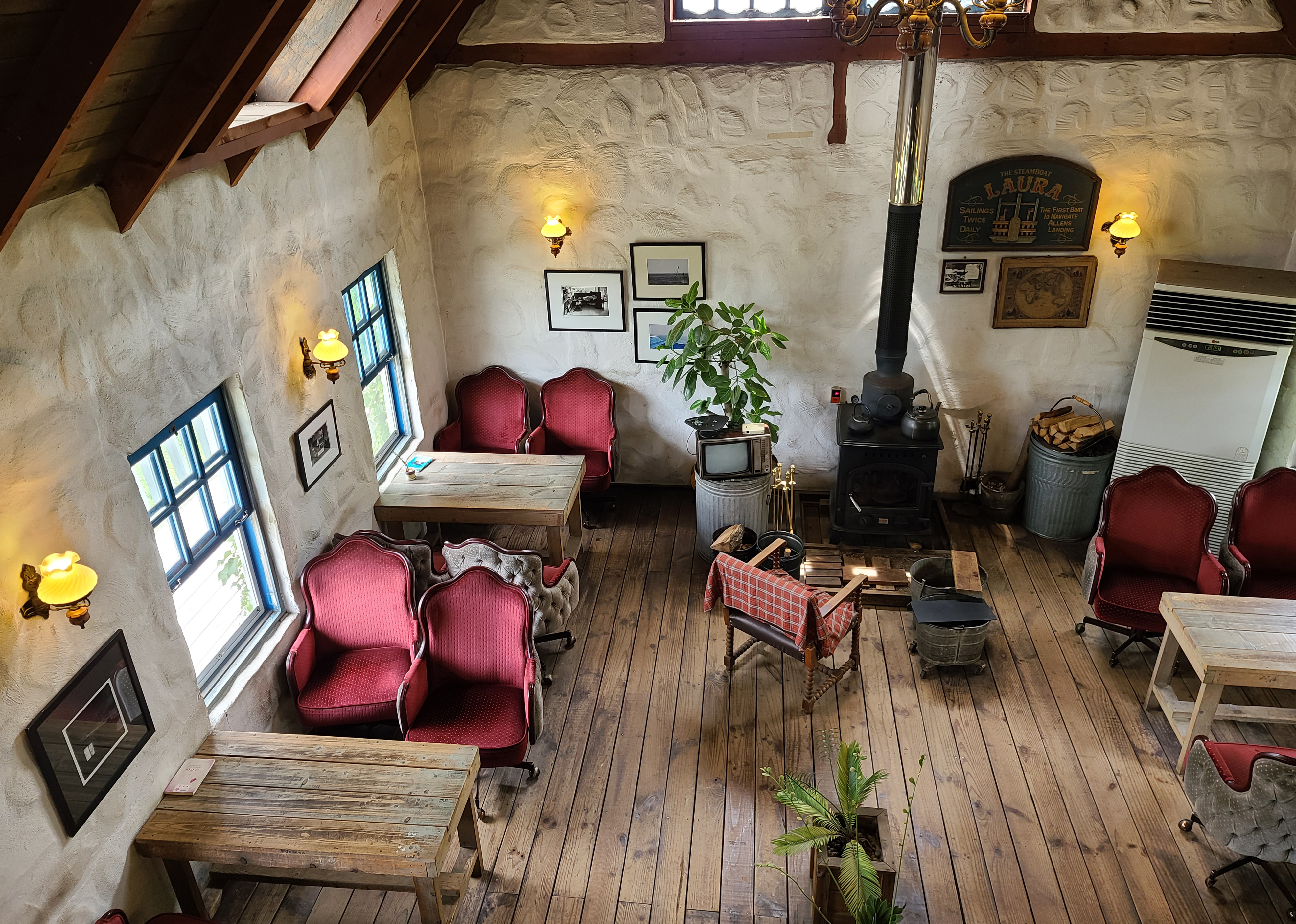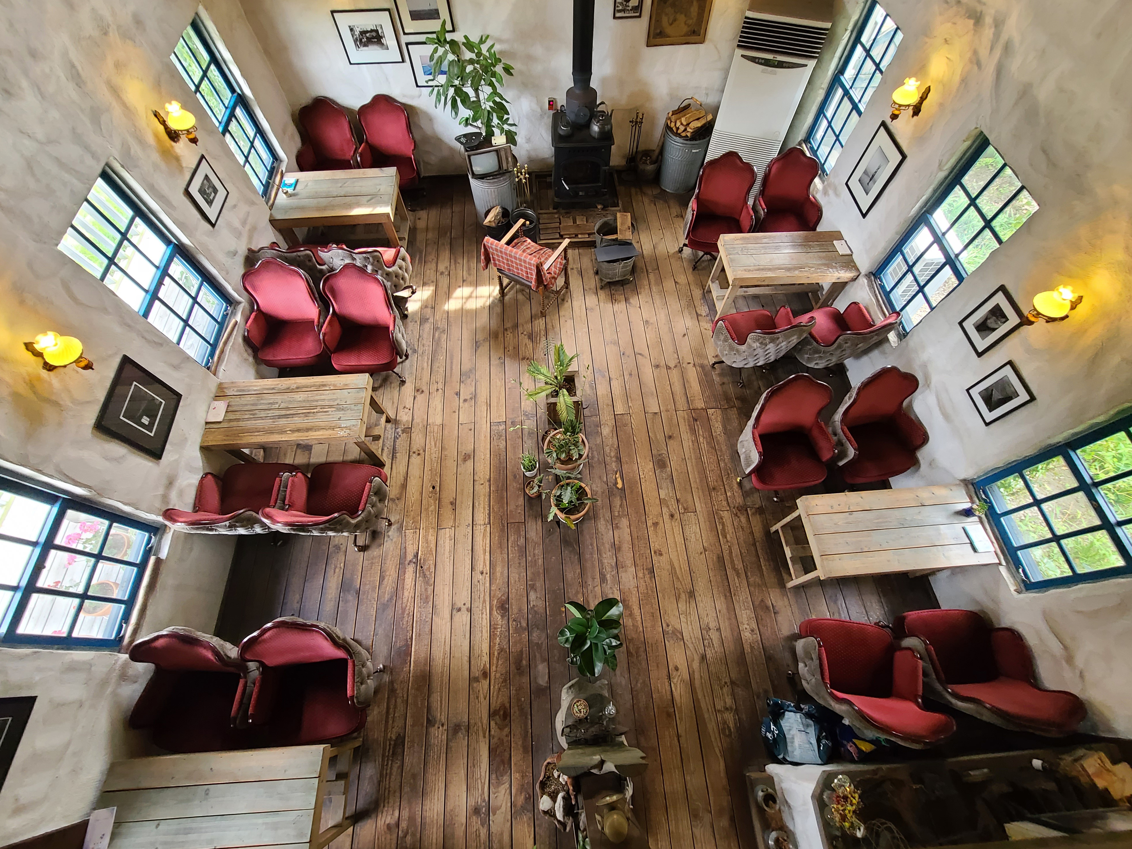 가게의 메인인 카페 공간이 나옵니다. 나무로 된 투박하게 생긴 테이블과 옛날 다방에서 볼 법한 의자가 눈에 띄고, 추울 때 특히 빛을 발하는 화목난로가 가게의 중앙을 지키고 있었습니다.