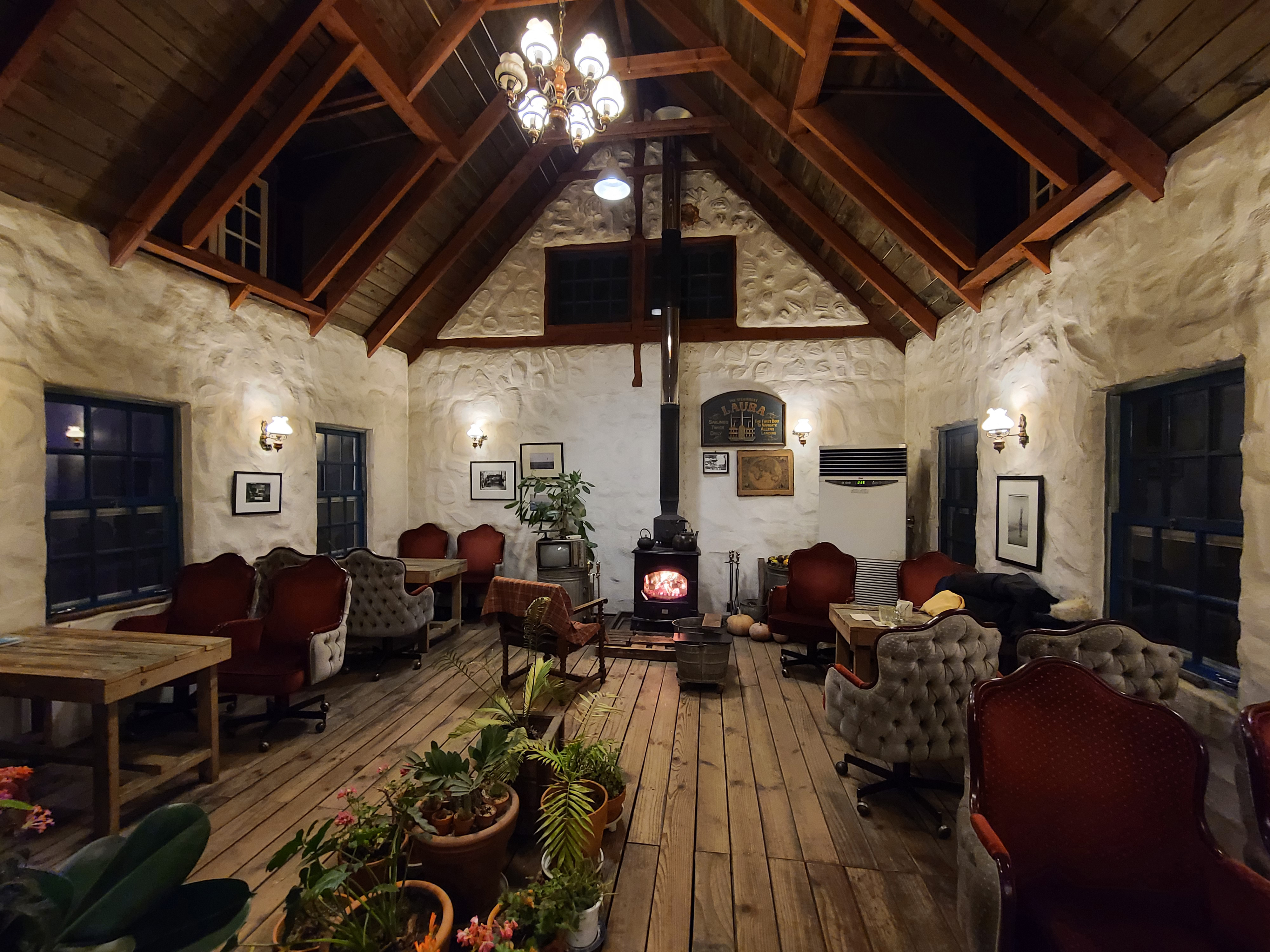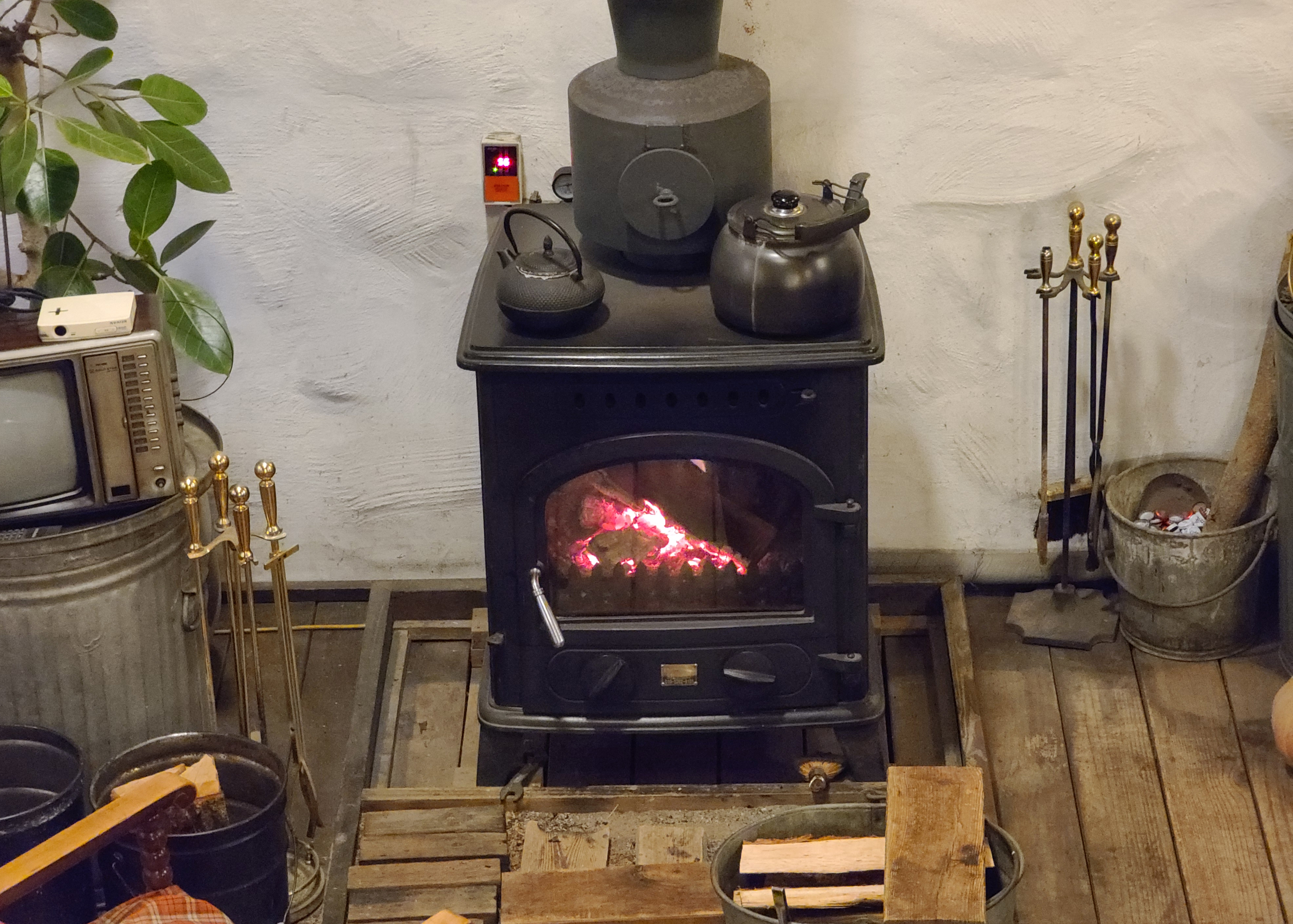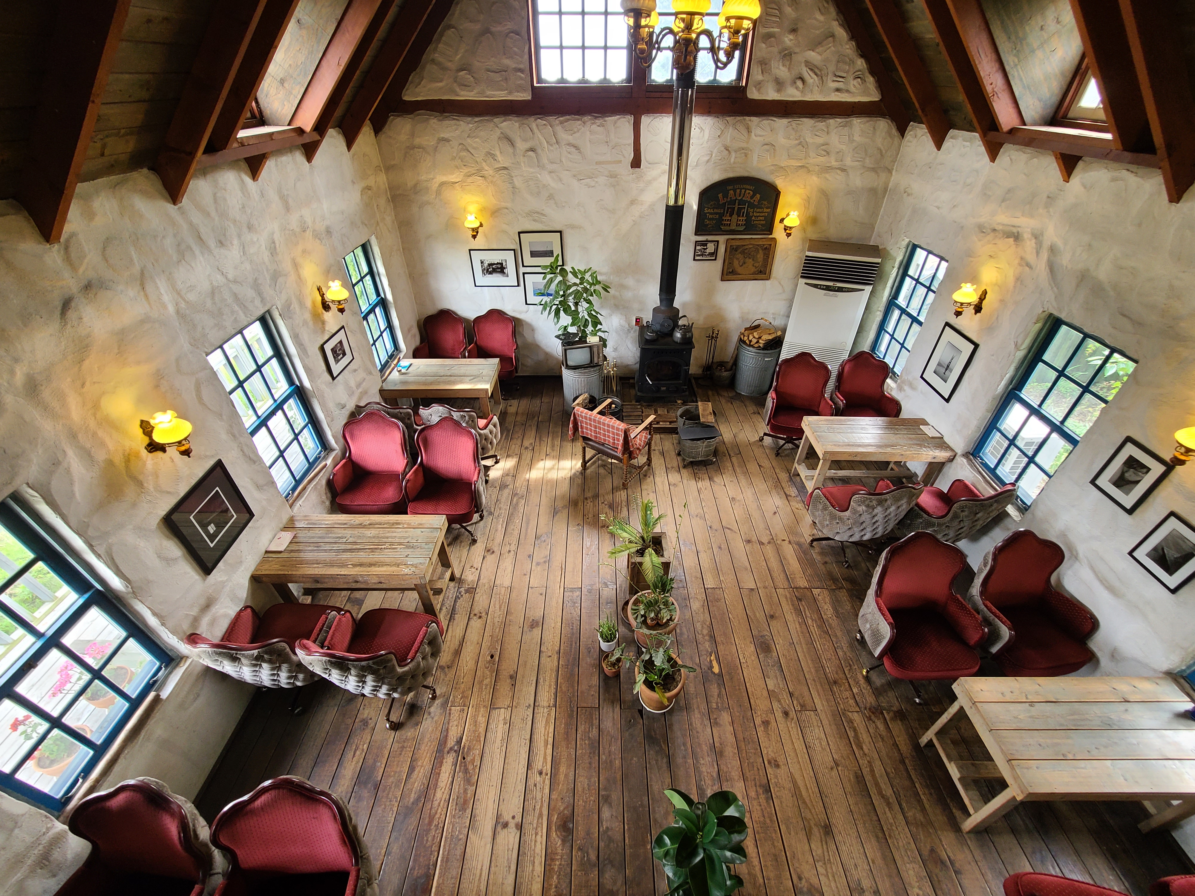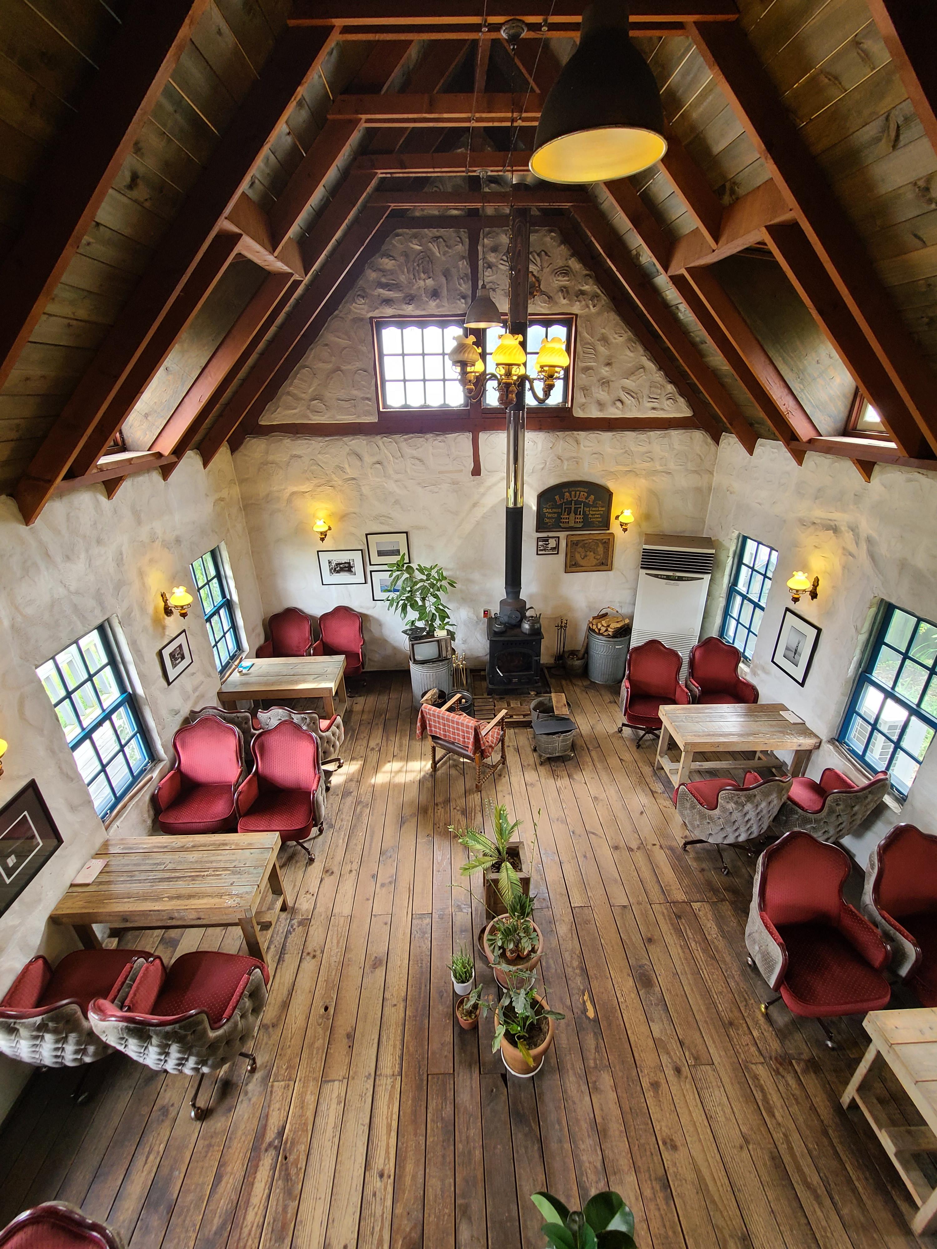 가게의 메인인 카페 공간이 나옵니다. 나무로 된 투박하게 생긴 테이블과 옛날 다방에서 볼 법한 의자가 눈에 띄고, 추울 때 특히 빛을 발하는 화목난로가 가게의 중앙을 지키고 있었습니다.