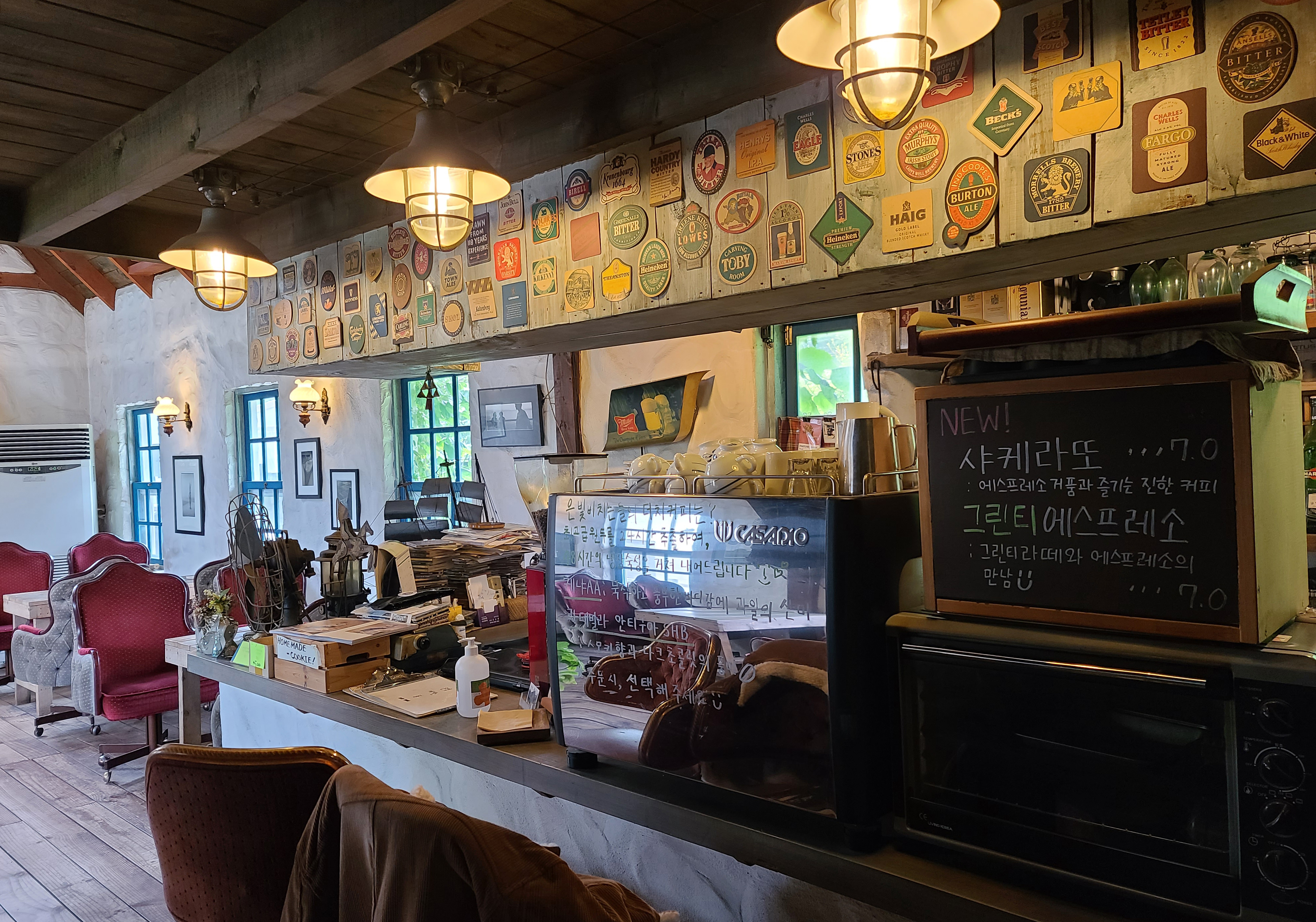 은빛비치는들 카페는 외국의 시골집 같은 느낌으로 가게입니다. 가게 안으로 들어가면, 나무로 된 삐걱이는 소리의 바닥이 나옵니다. 펍(PUB)을 떠올리게 하는 조그마한 선술집 느낌의 공간을 지나가면,,