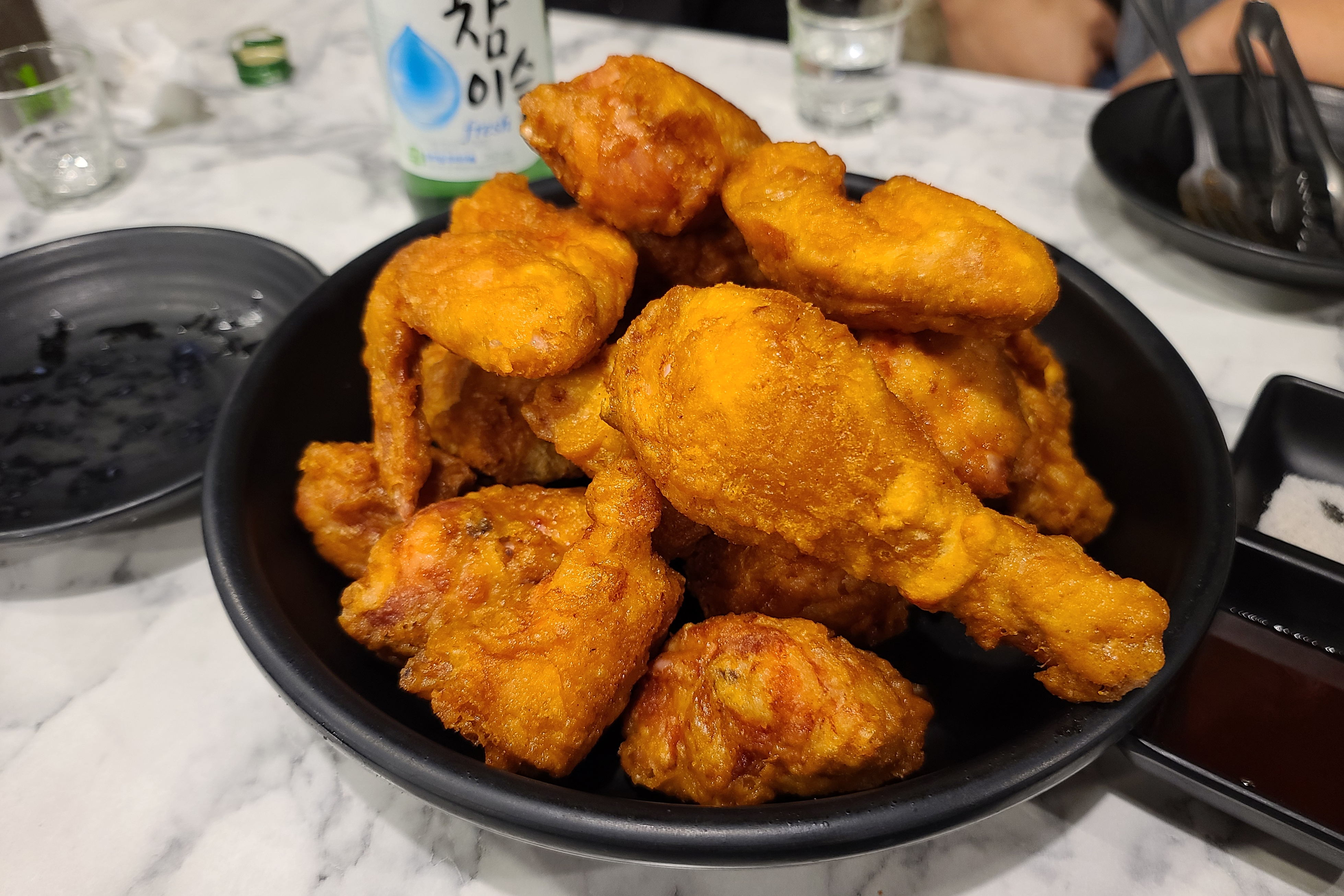 가락동 치킨맛집 다가마통닭의 가마솥에 튀겨낸 후라이드치킨은 위와같이 나옵니다. 바삭한 튀김옷 안에 속살은 촉촉하고 부드러워서 저는 후라이드치킨을 주로 먹는 편입니다. 다가마통닭 만의 독특한 맛의 후라이드치킨은 언제 먹어도 질리지 않는 것 같습니다.
