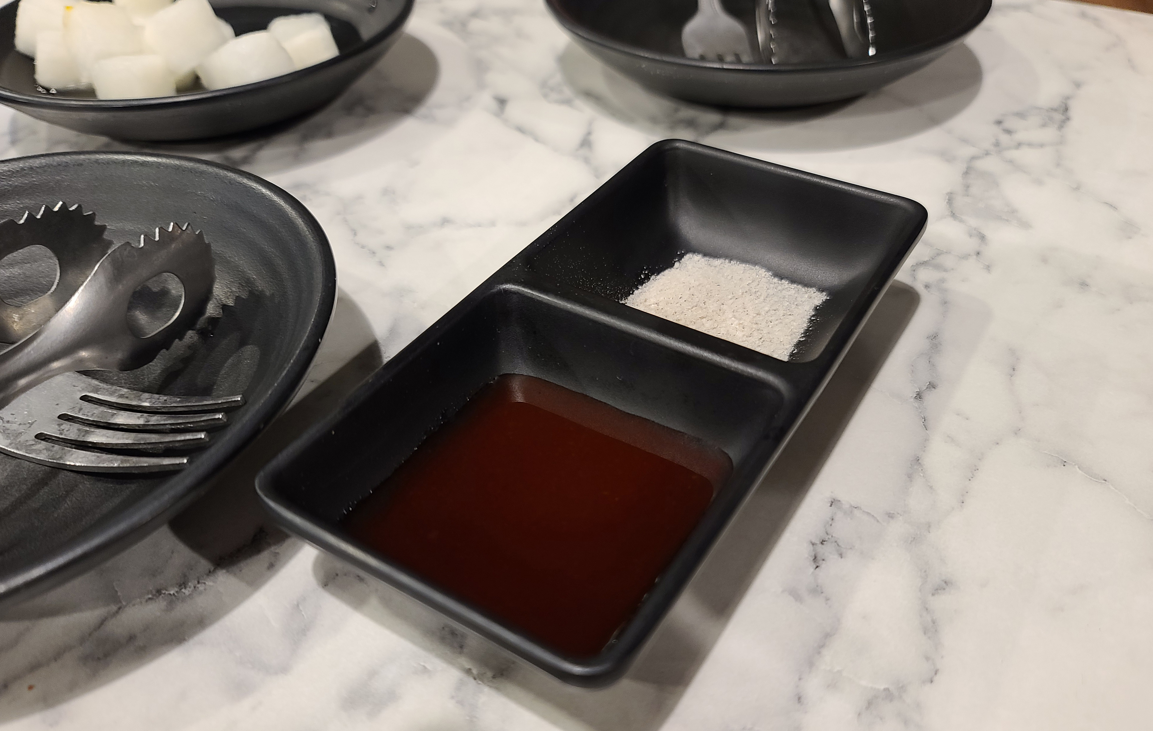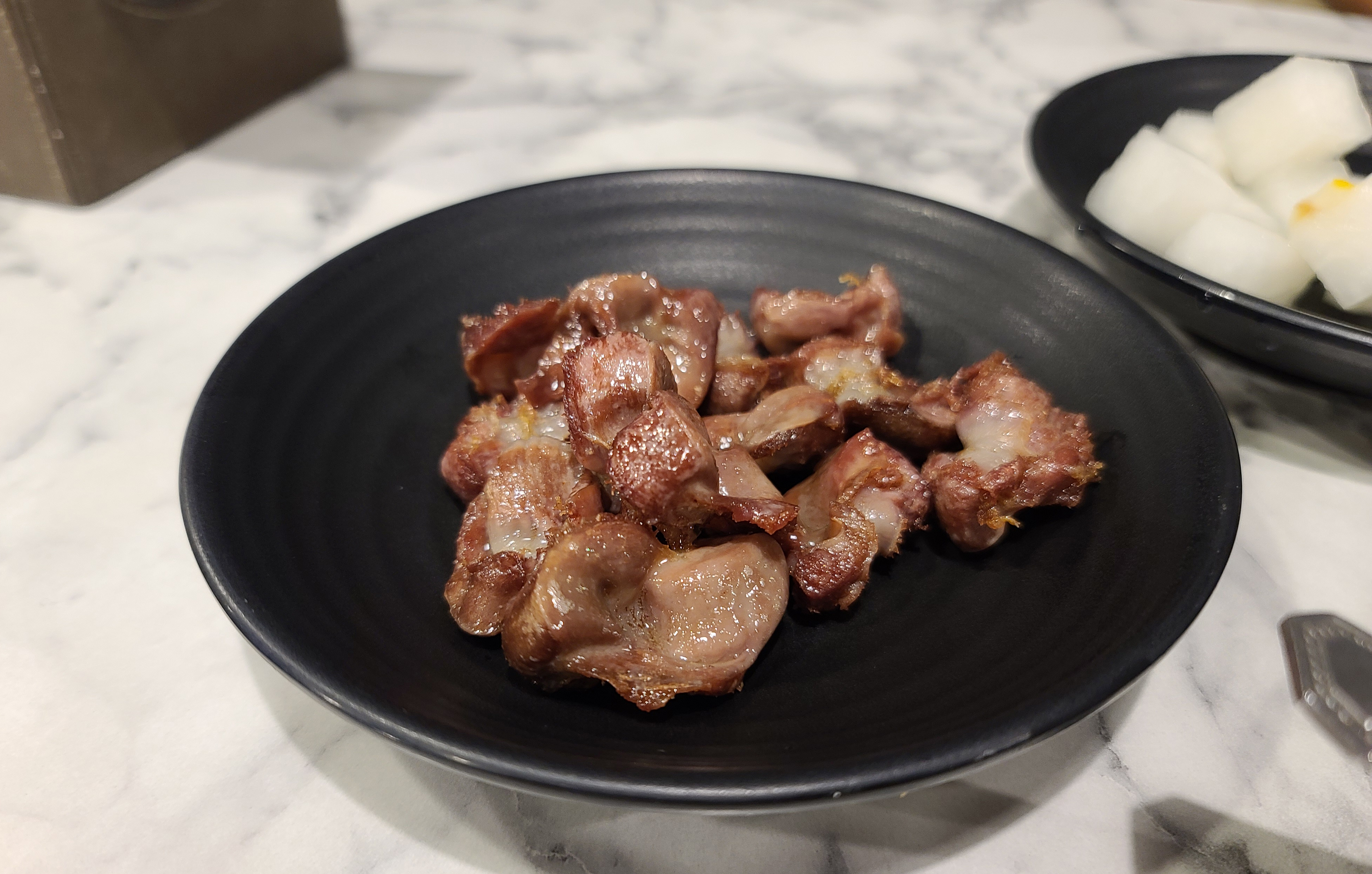 치킨을 주문하면 먼저 직접 담근 치킨무와 소금, 양념 그리고 닭똥집이 제공됩니다. 특히 이 소스와 치킨무는 맛이 좋은데, 치킨무에 레몬을 넣어서 더 상큼한 맛을 강조한 점이 인상적이었고, 닭똥집과 치킨 모두에 두루 어울리는 소스역시 이 집의 매력 포인트였습니다.