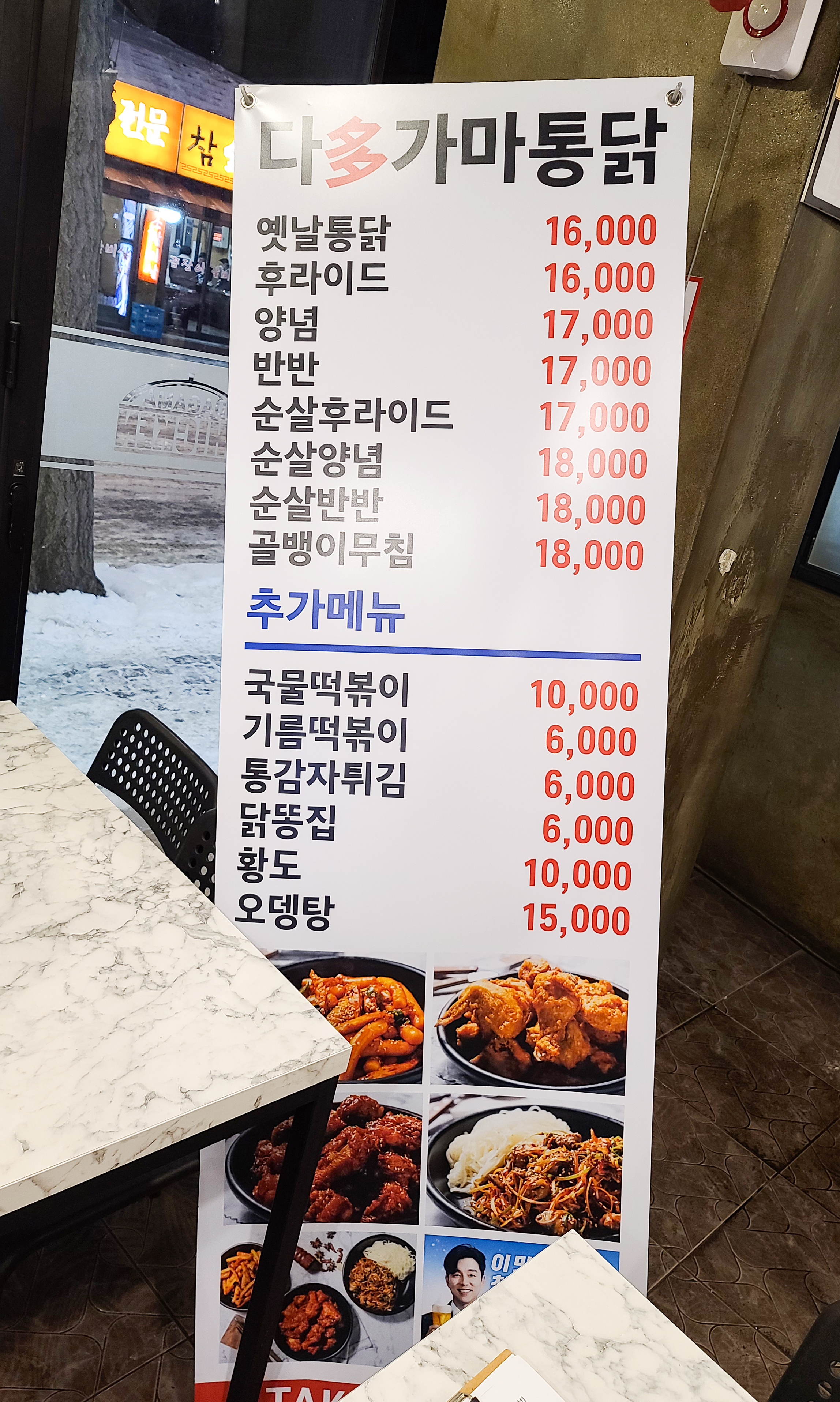 가락동 다가마통닭의 메뉴는 위와 같습니다. 옛날통닭, 후라이드, 양념, 반반, 순살후라이드, 순살양념, 순살반반, 골뱅이무침, 국물떡볶이, 기름떡볶이, 통감자튀김, 닭똥집, 황도, 오뎅탕 등이 있었습니다. 오늘 소개해드릴 메뉴는 후라이드치킨, 옛날통닭, 기름떡볶이 입니다.