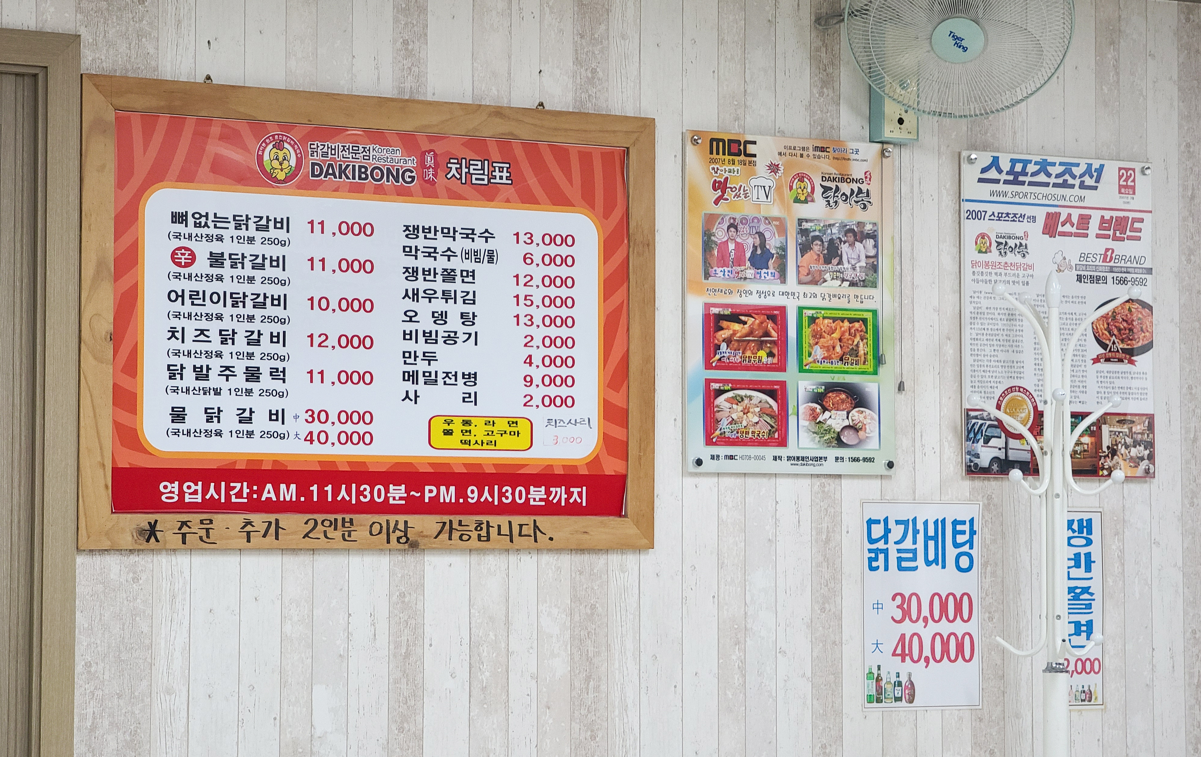 강화 닭이봉닭갈비 가게에 들어가면 위와같이 매장이 깔끔하게 잘 정돈되어 있었습니다. 닭이봉닭갈비의 메뉴는 뼈없는닭갈비, 신불닭갈비, 어린이닭갈비, 치즈닭갈비, 닭발주물럭, 물닭갈비, 쟁반막국수, 막국수, 쟁반쫄면, 새우튀김, 오뎅탕, 비빔공기, 만두, 메밀전병, 사리 등이 있었습니다.