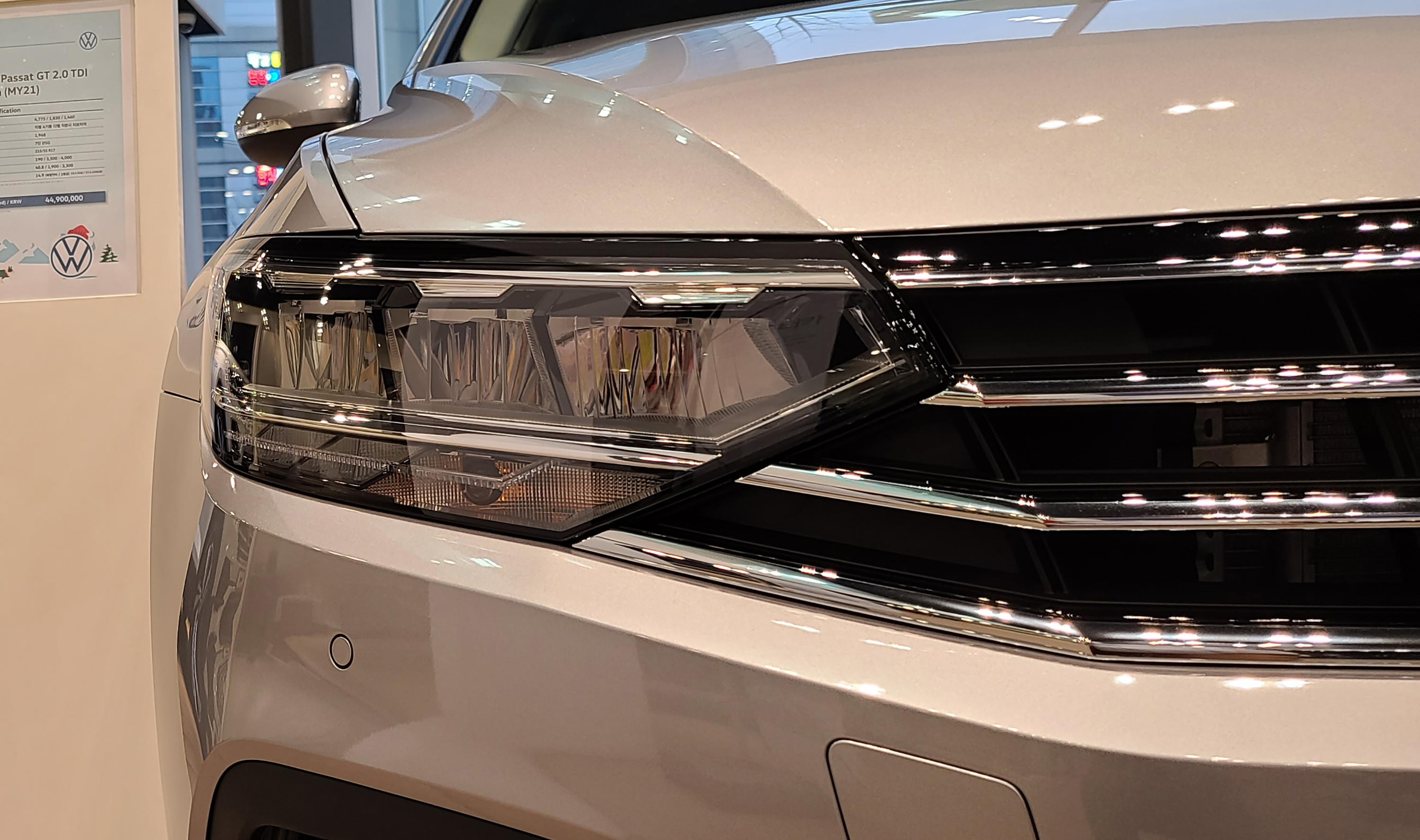 제가 본 폭스바겐 신형 파사트 GT 는 위와 같이 단정하면서도 군더더기 없는 디자인이 인상적이었습니다. 전면부는 폭스바겐 제타, 파사트, 티구안, 투아렉 까지 비슷한 형태로 가로로 길게 뻗어있는 그릴과 조명이 하나로 뻗어나가 단정하면서 깔끔한 이미지를 보여주었고, 후면부는 볼륨감 있는 트렁크와 심플한 디자인의 후미등이 있었습니다.