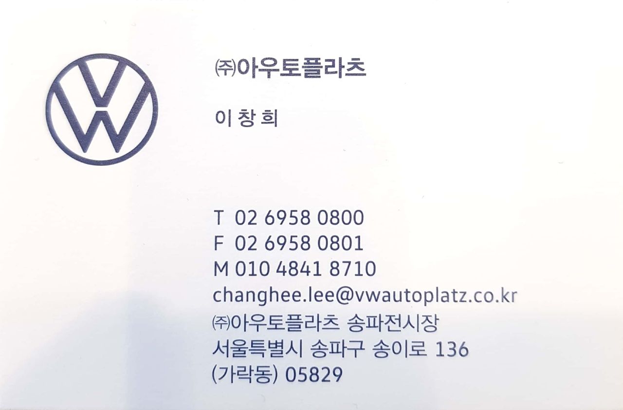 제가 상담받고 있는 폭스바겐 딜러의 명함인데, 친절하게 상담도 잘해 주시고 폭스바겐 아우토플라츠 송파 전시장은 차량 시승도 비교적 빨리 해볼 수 있어서 편하더라고요. 앞으로의 구입까지 잘 이루어지기를 희망해보며, 부족한 리뷰지만 관심 나타내 주셔서 감사합니다.
