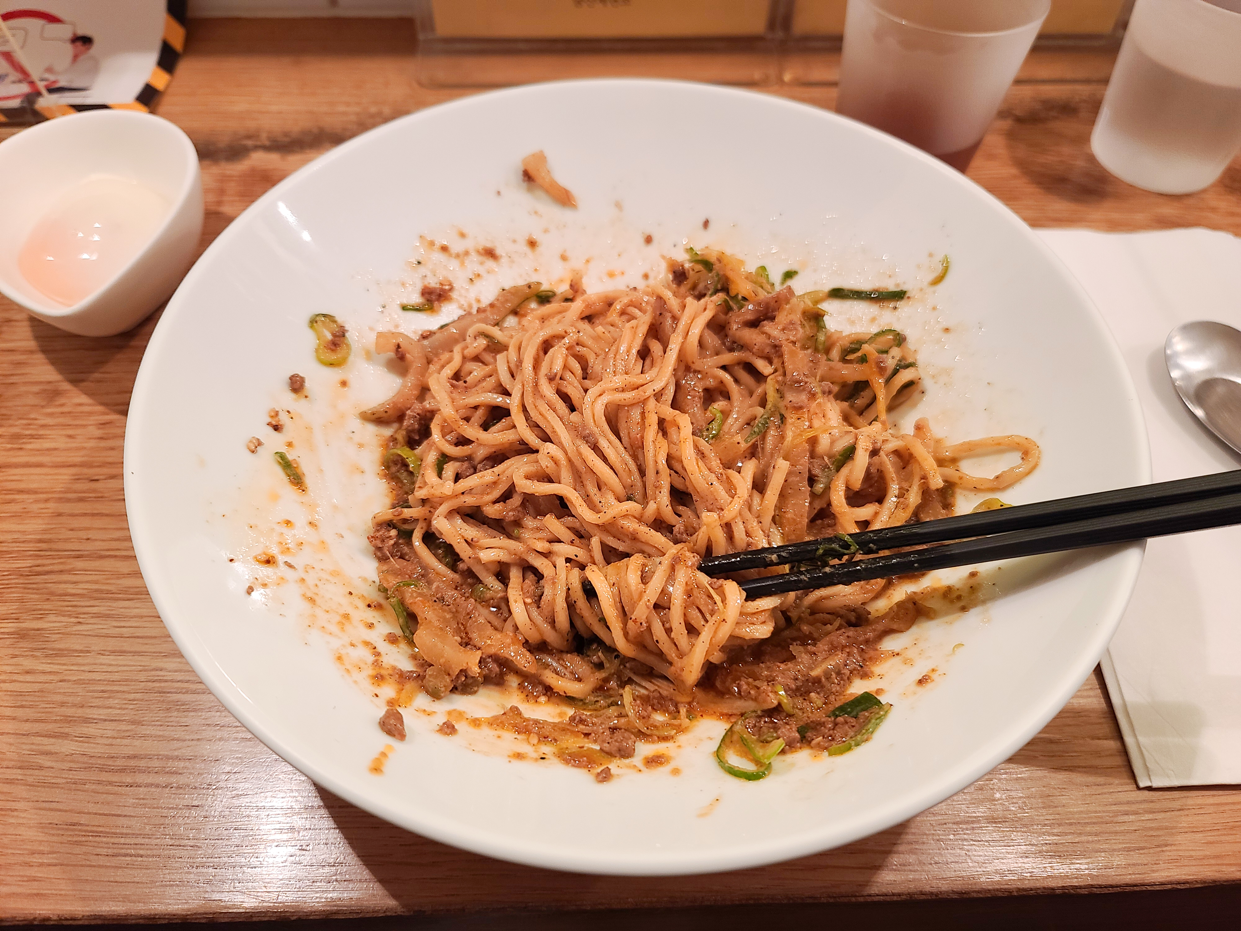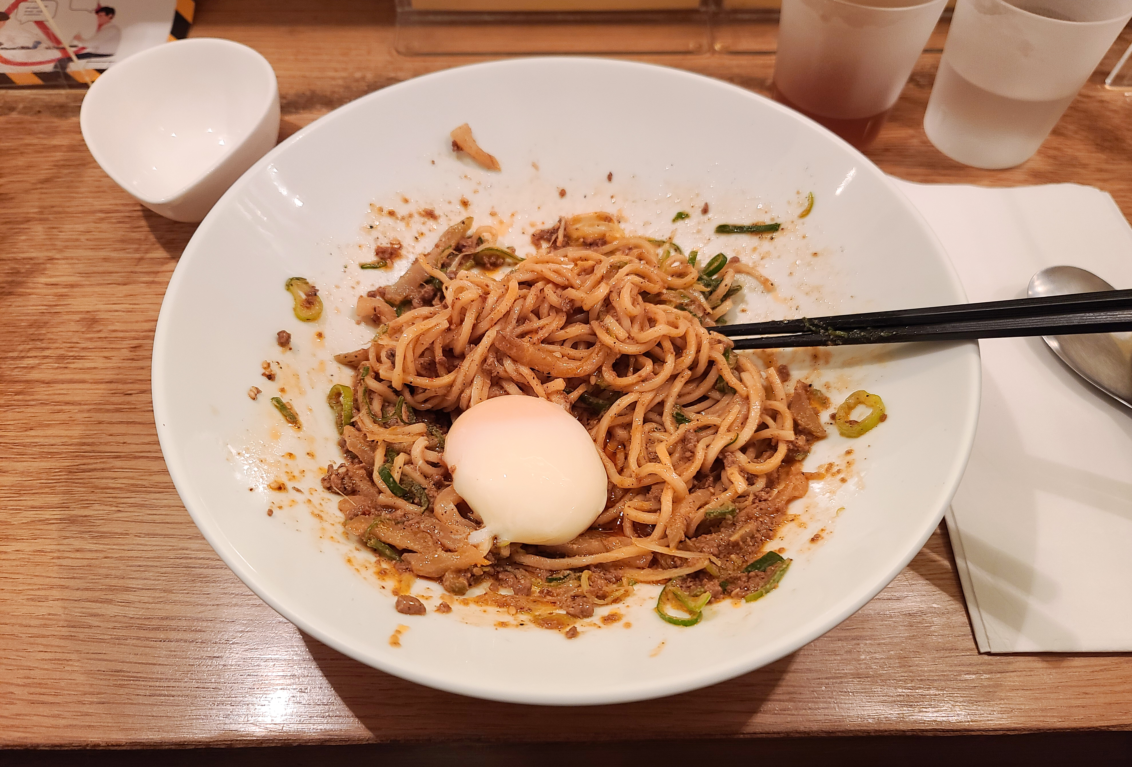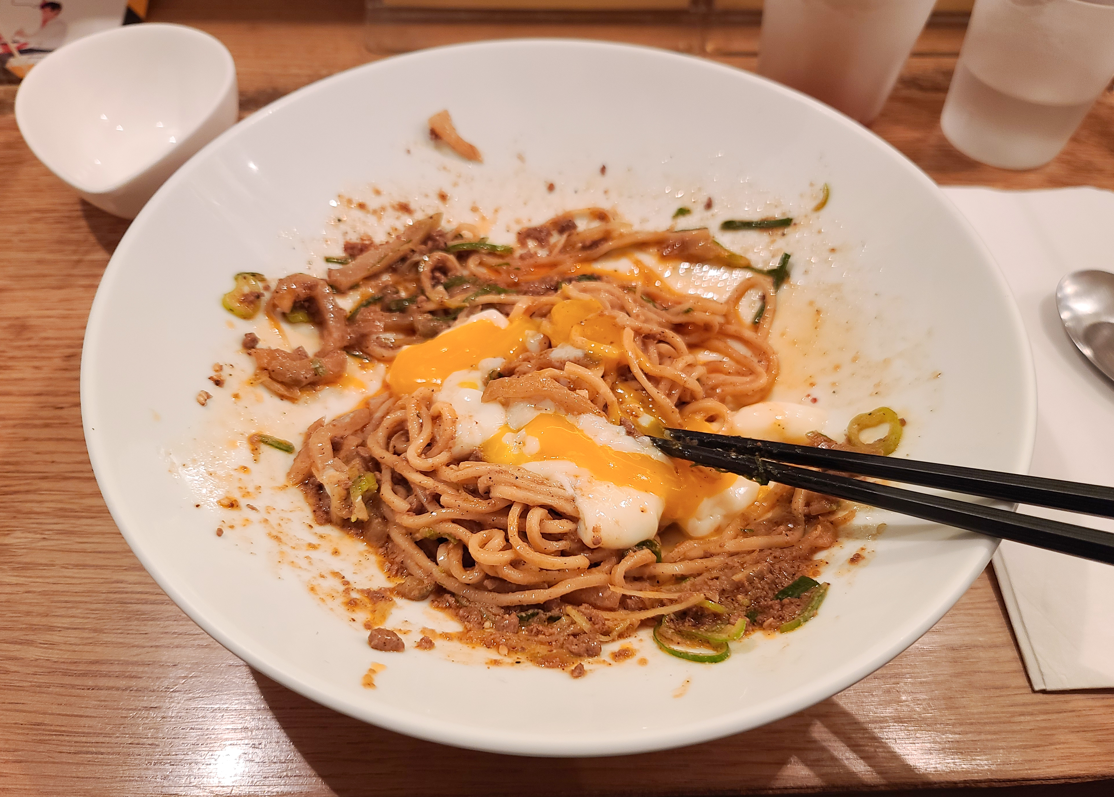 적당히 먹고 난 탄탄멘에 온천달걀(반숙달걀)을 넣고 톡 터트려 비벼서 먹었습니다. 부드러우면서 고소한 맛의 달걀은 면과 잘 어울려서 또 새로운 맛을 보여주었습니다.