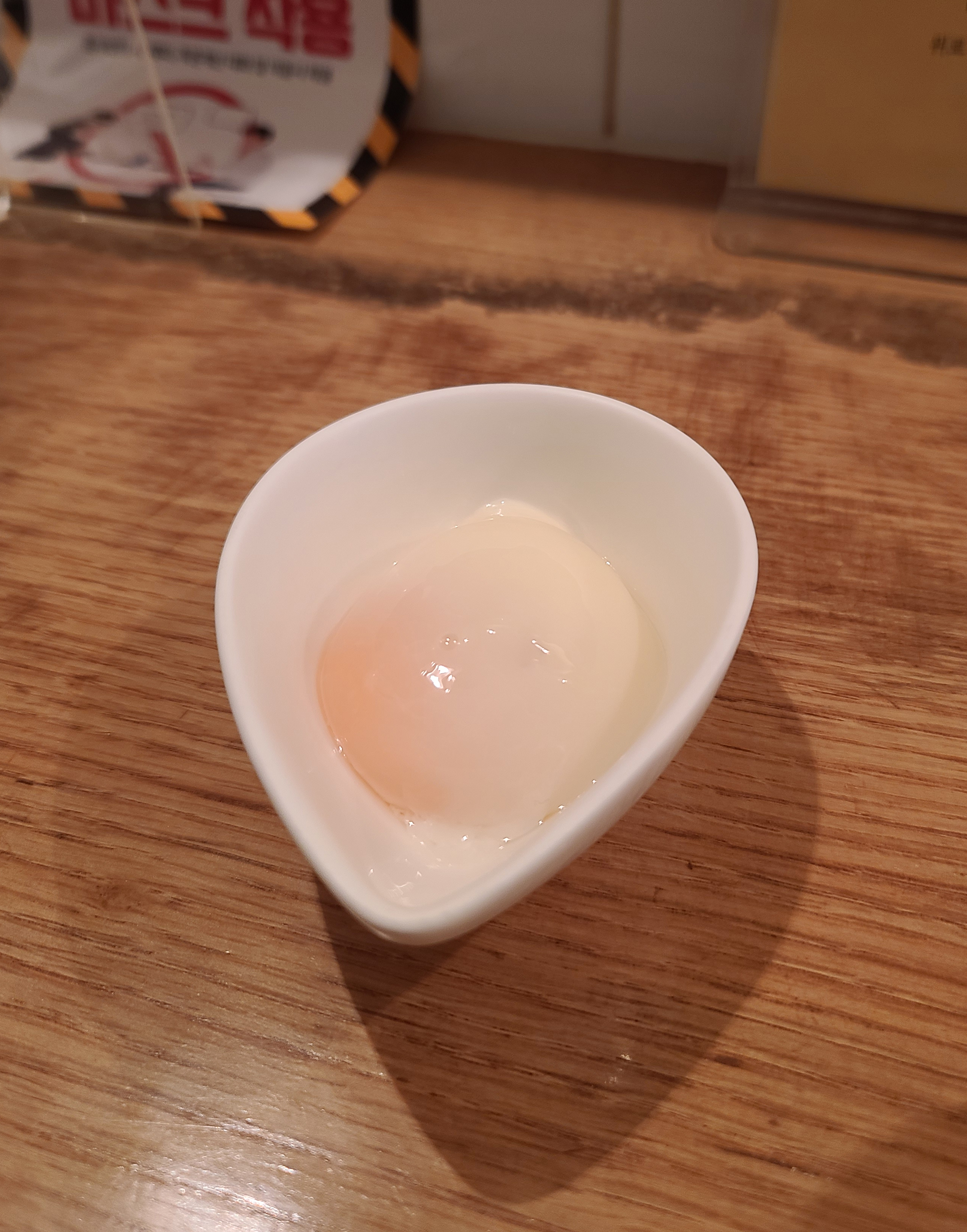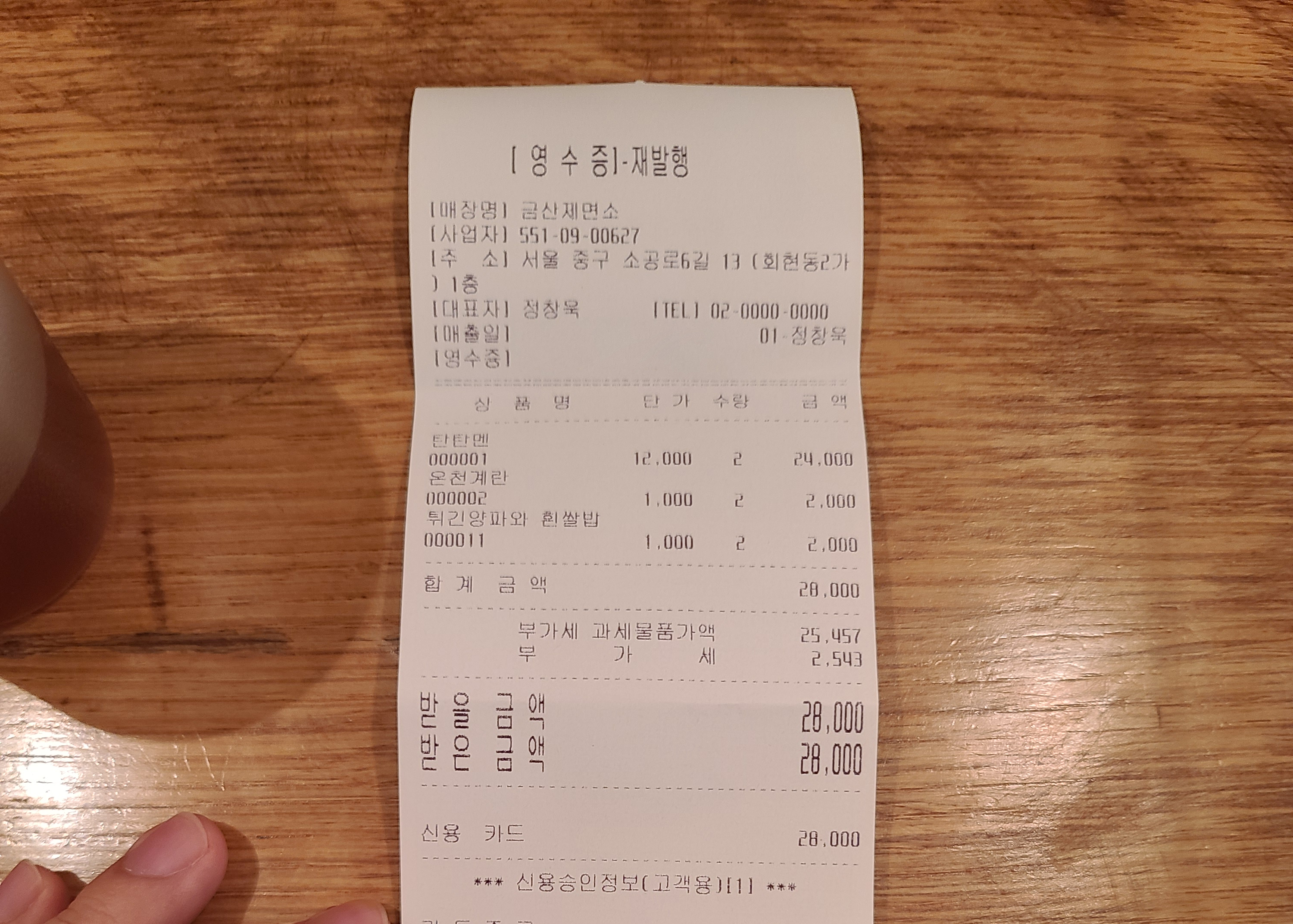 가게에 들어가니 정창욱 셰프가 직접 "주차는 잘하셨는지" 물어봐주셨습니다. 다행히도 인근 공영주차장을 찾아서 주차를 하고 왔다고 한 다음, 금산제면소의 메인 메뉴인 탄탄멘과 온천 달걀, 튀긴 양파와 흰쌀밥을 함께 주문했습니다. 식사 금액은 선결제를 하였고 총금액 28,000원이 나왔습니다.