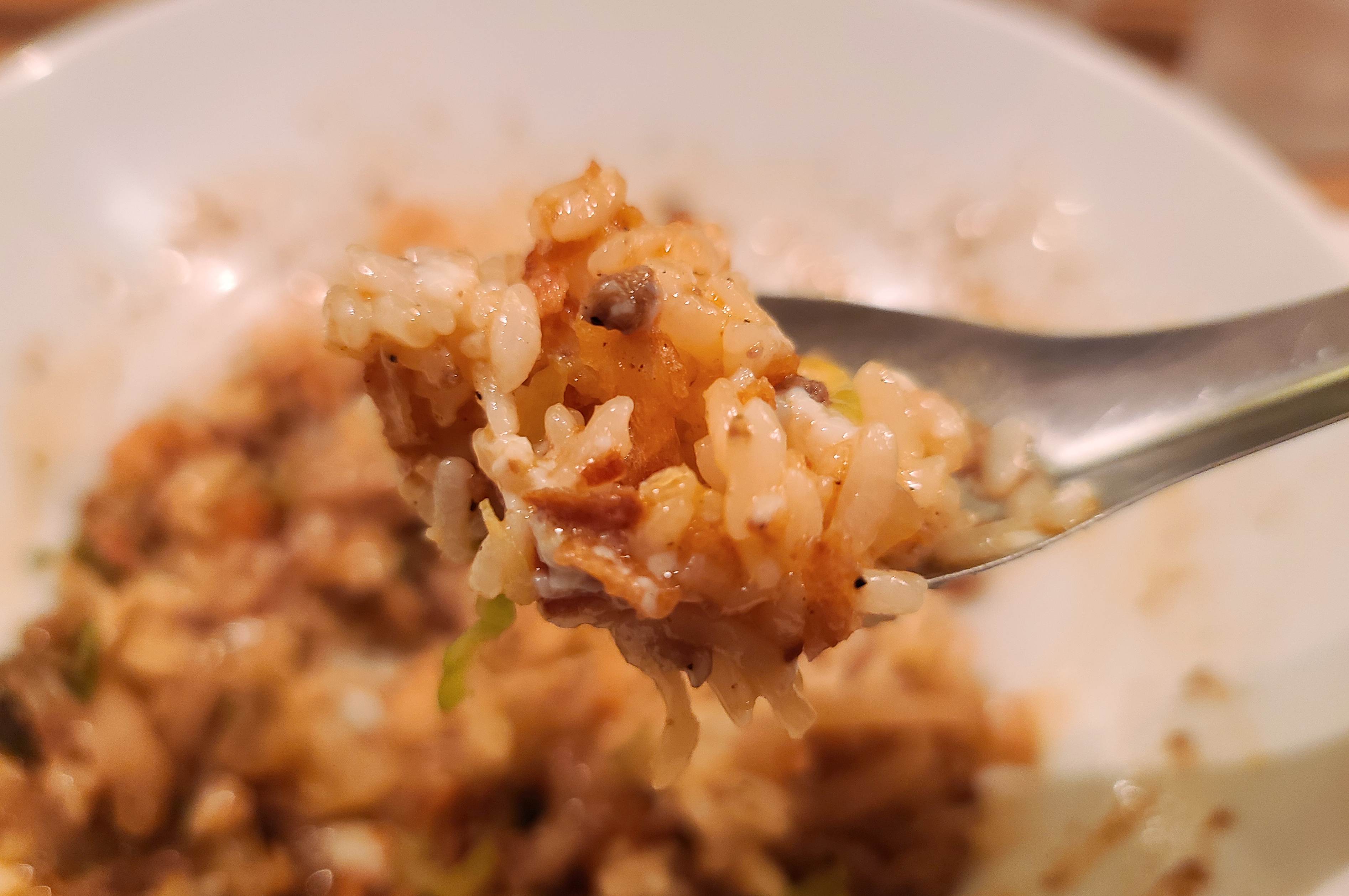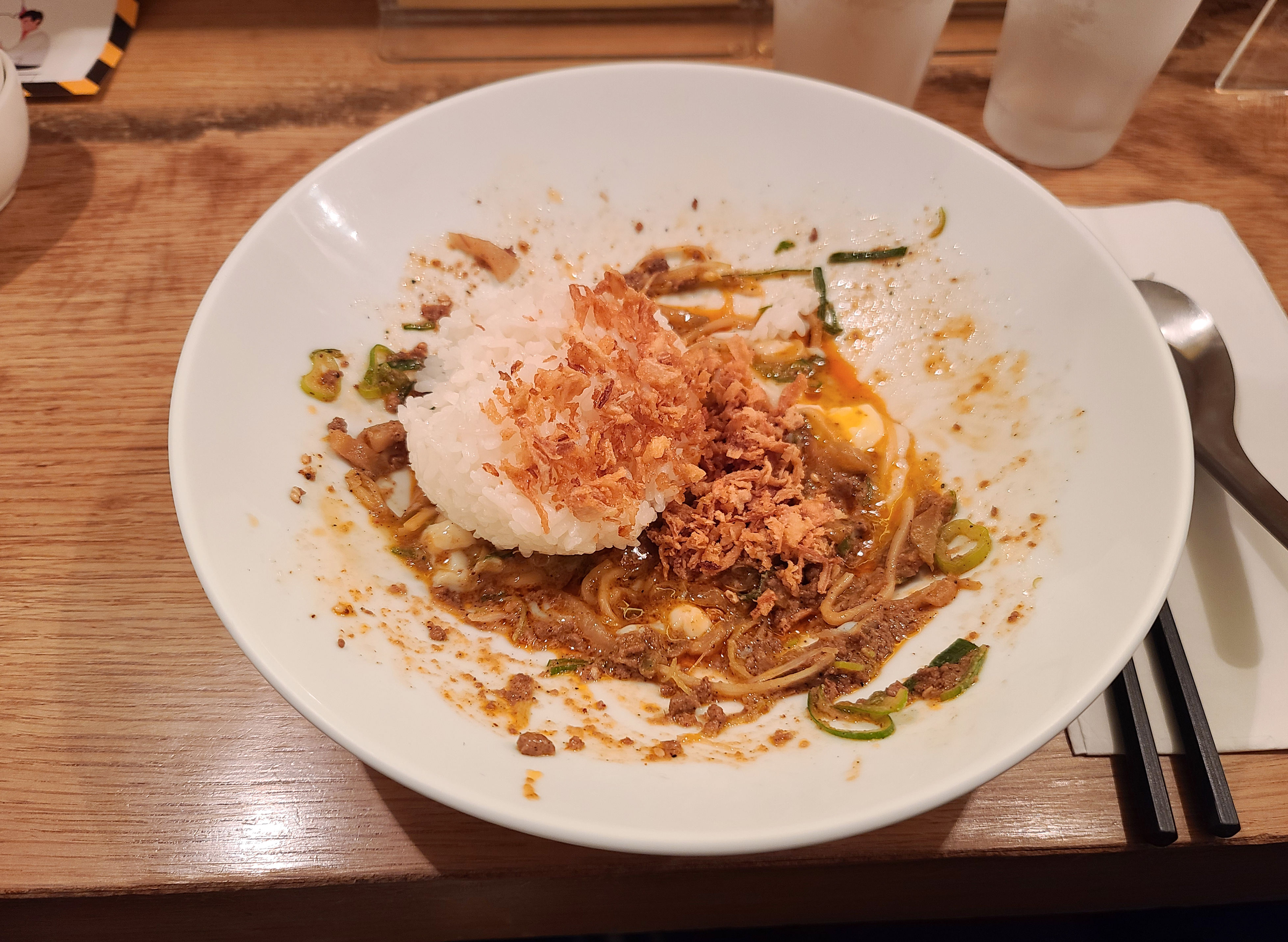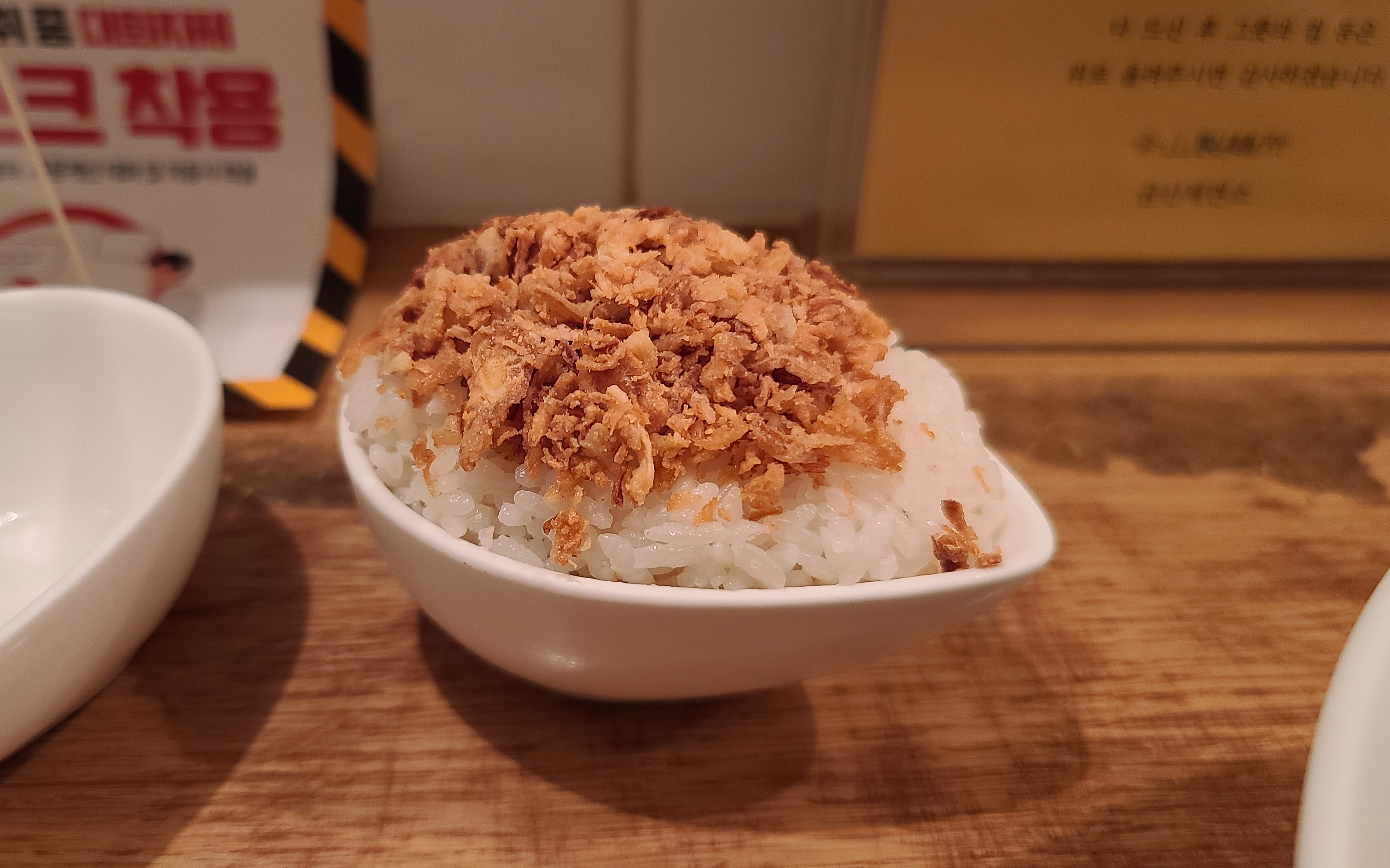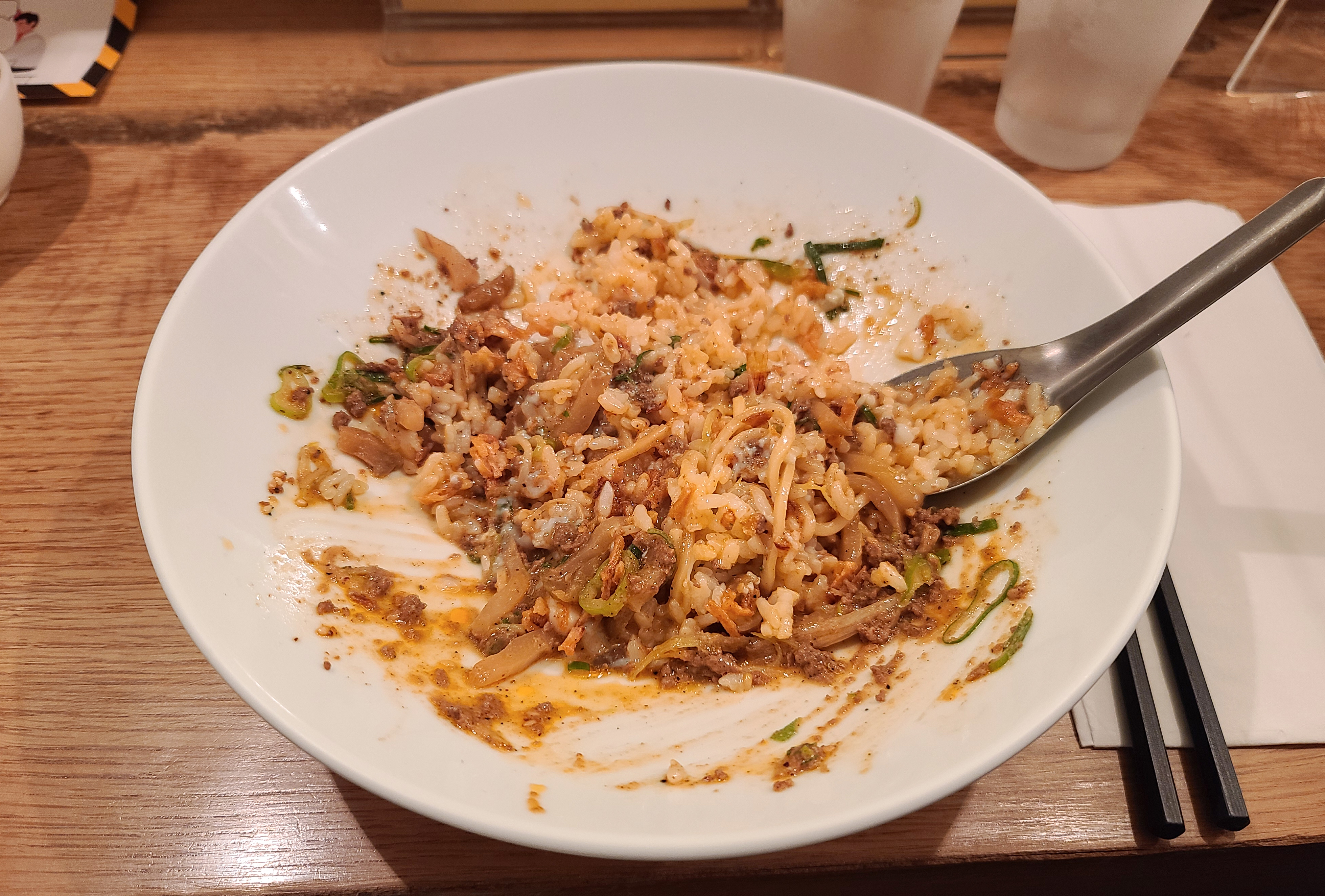 마지막으로 튀긴 양파를 얹은 흰쌀밥을 남은 양념에 비벼서 먹으면 속이 든든할 정도로 배불리 먹을 수 있었습니다. 튀긴 양파가 바삭하면서 양파의 고소한 향 때문에 더욱 맛있게 마무리를 할 수 있었던 것 같습니다. 탄탄멘에 달걀과 밥까지 먹으니 은근히 배가 불렀고, 맛도 좋아서 기분 좋게 식사를 마칠 수 있었습니다.