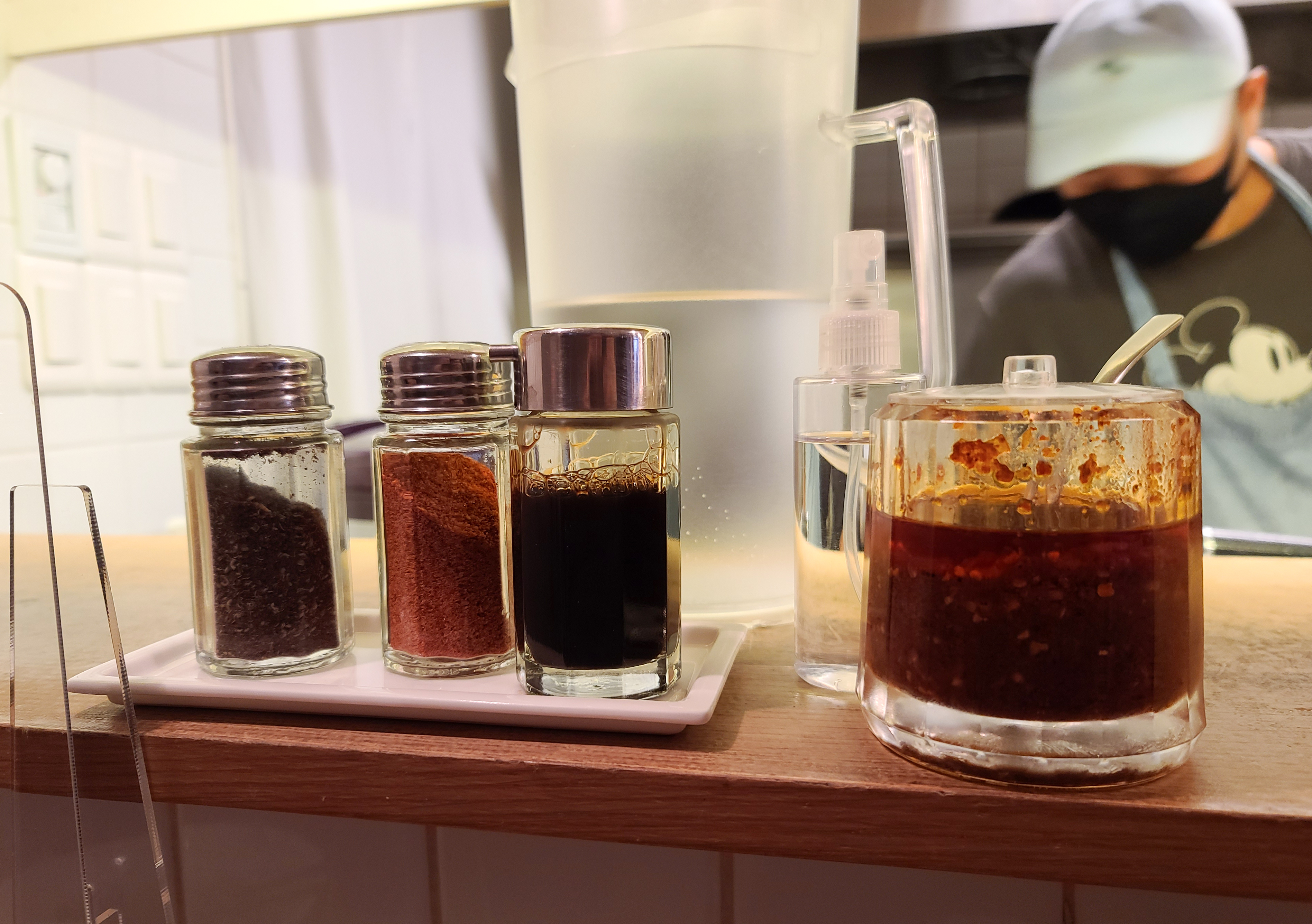 탄탄멘은 기본적으로 나오는 양념과 면을 슥슥 비벼서 먹어도 맛있었지만, 추가로 고추기름 혹은 흑식초와 비벼서 먹어도 맛있었습니다. 양념통을 찍다가 우연히 정창욱 셰프의 모습도 사진에 찍혔더라고요.(ㅋㅋ)