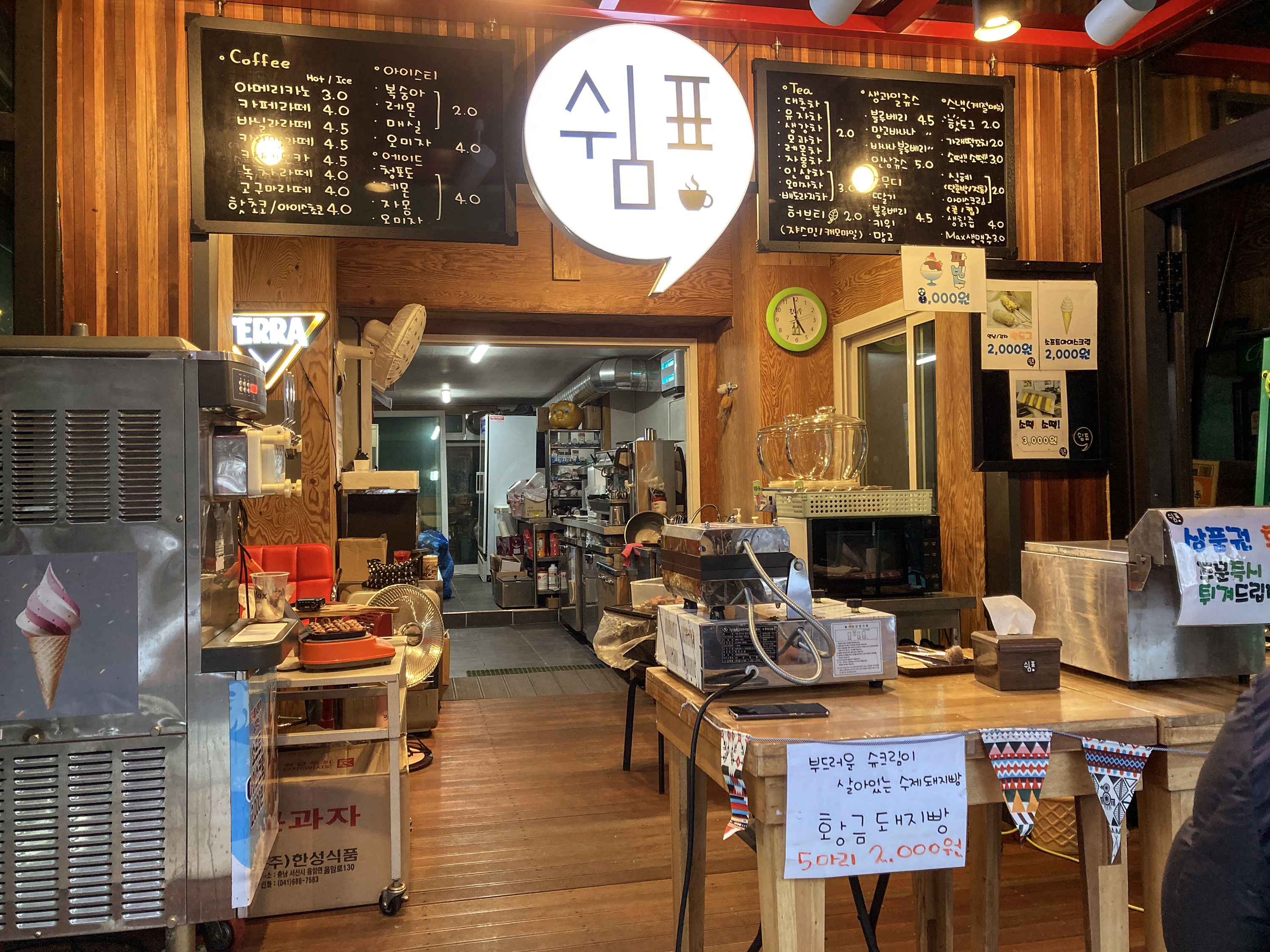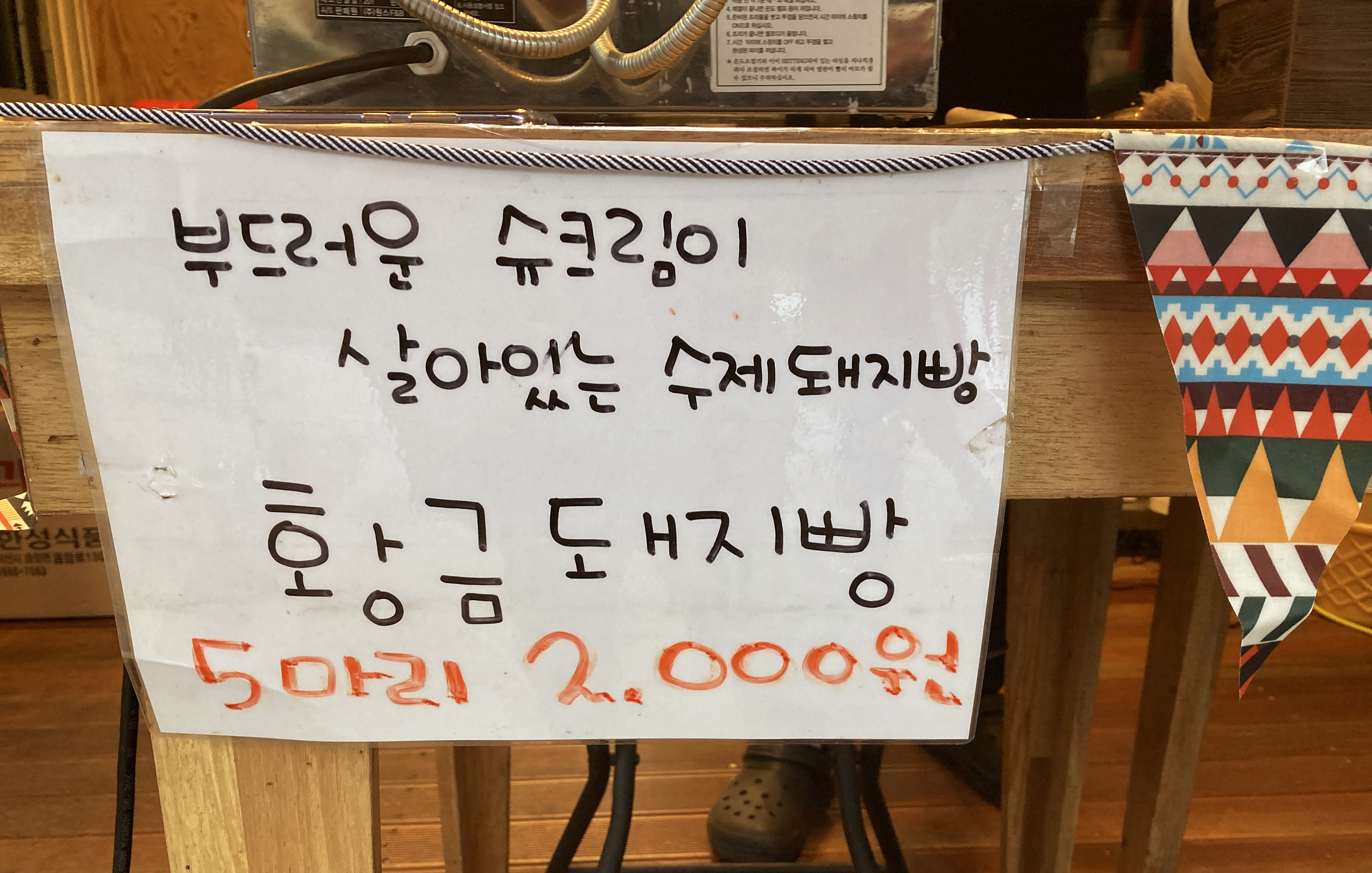 출렁다리 구경을 마친 뒤 주차장으로 내려오는 길목에 쉼표라는 길거리 상점이 있더라고요. 어묵과 황금돼지빵, 커피 등을 판매하는 곳으로 저희는 소금산 출렁다리 이용권을 구입하면서 받은 지역 상품권을 이용해 황금돼지빵을 구입했습니다. 5마리 2,000원이었는데 3명이서 가서 아주머니께 1마리만 더 구워주시면 안되겠냐고 부탁하였더니, 마침 마감시간이라고 하시며 선뜻 한마리 더 채워서 황금돼지빵 6마리를 구워주었습니다.