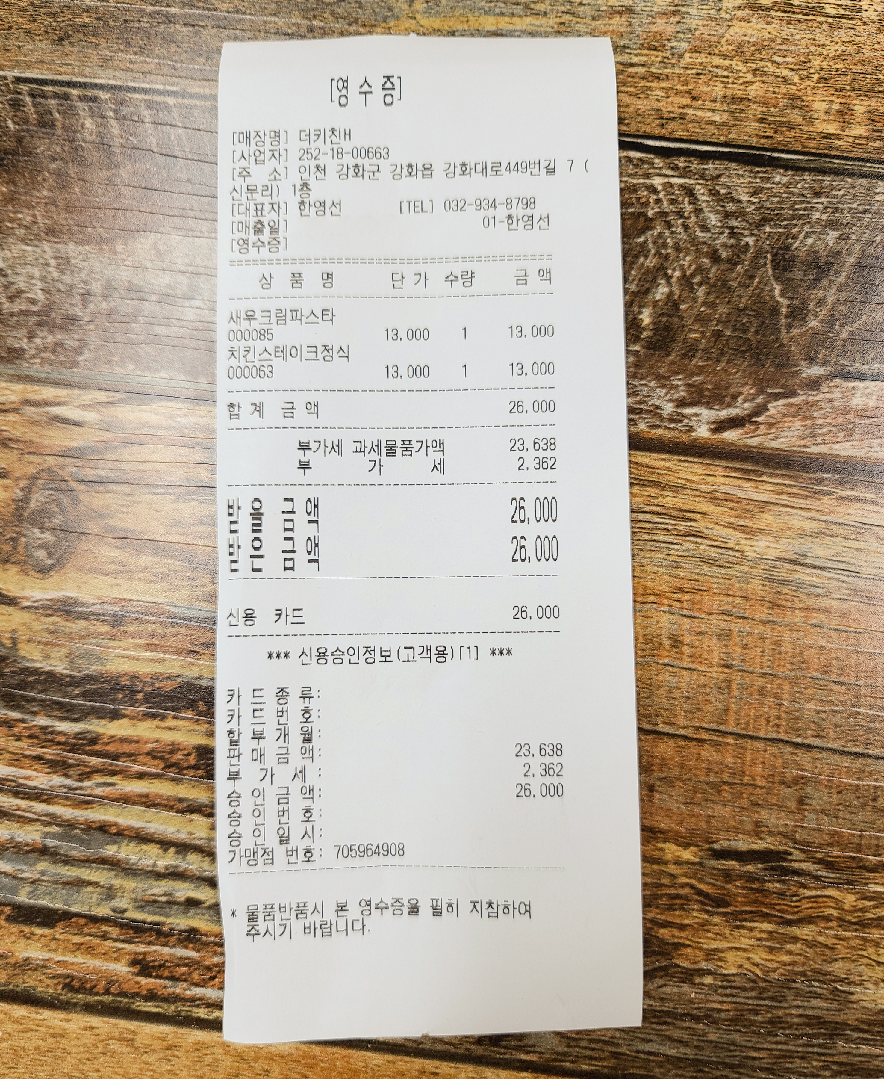 더키친에이치는 선주문 결제를 하고 있습니다. 휴게소처럼 음식을 미리 주문하고, 음식이 나오면 음식이 담긴 트레이를 직접 가져다가 식사하는 형태로 되어있는 가게입니다. 저희는 단짠치킨스테이크정식과 새우크림파스타를 주문했습니다. 식사에 총비용은 26,000원이 나왔습니다.