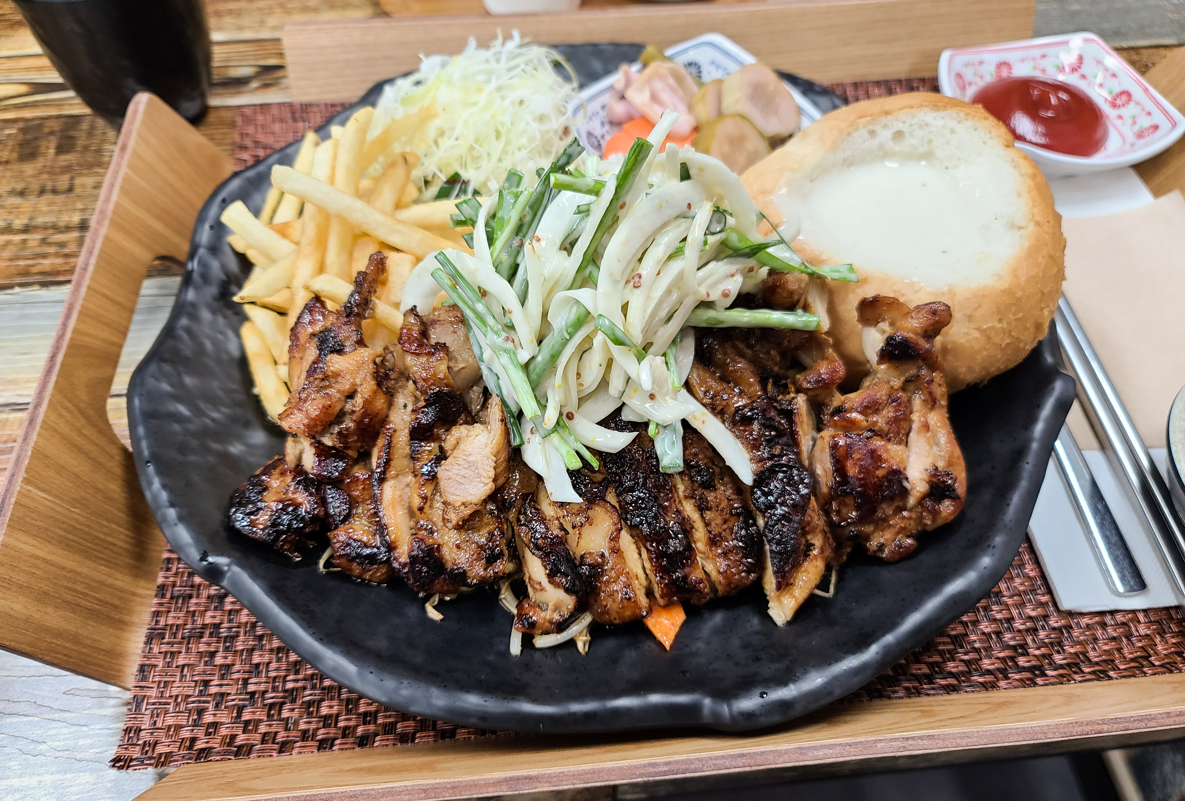 다음은 제가 주문한 단짠치킨스테이크정식이 나왔습니다. 더키친에이치의 단짠치킨스테이크정식은 구성이 다채로웠습니다. 빠네(빵)을 그릇 삼아 크림스프를 주었으며, 직접 담근 김치와 피클 그리고 샐러드, 감자튀김 등이 제공되었습니다.
