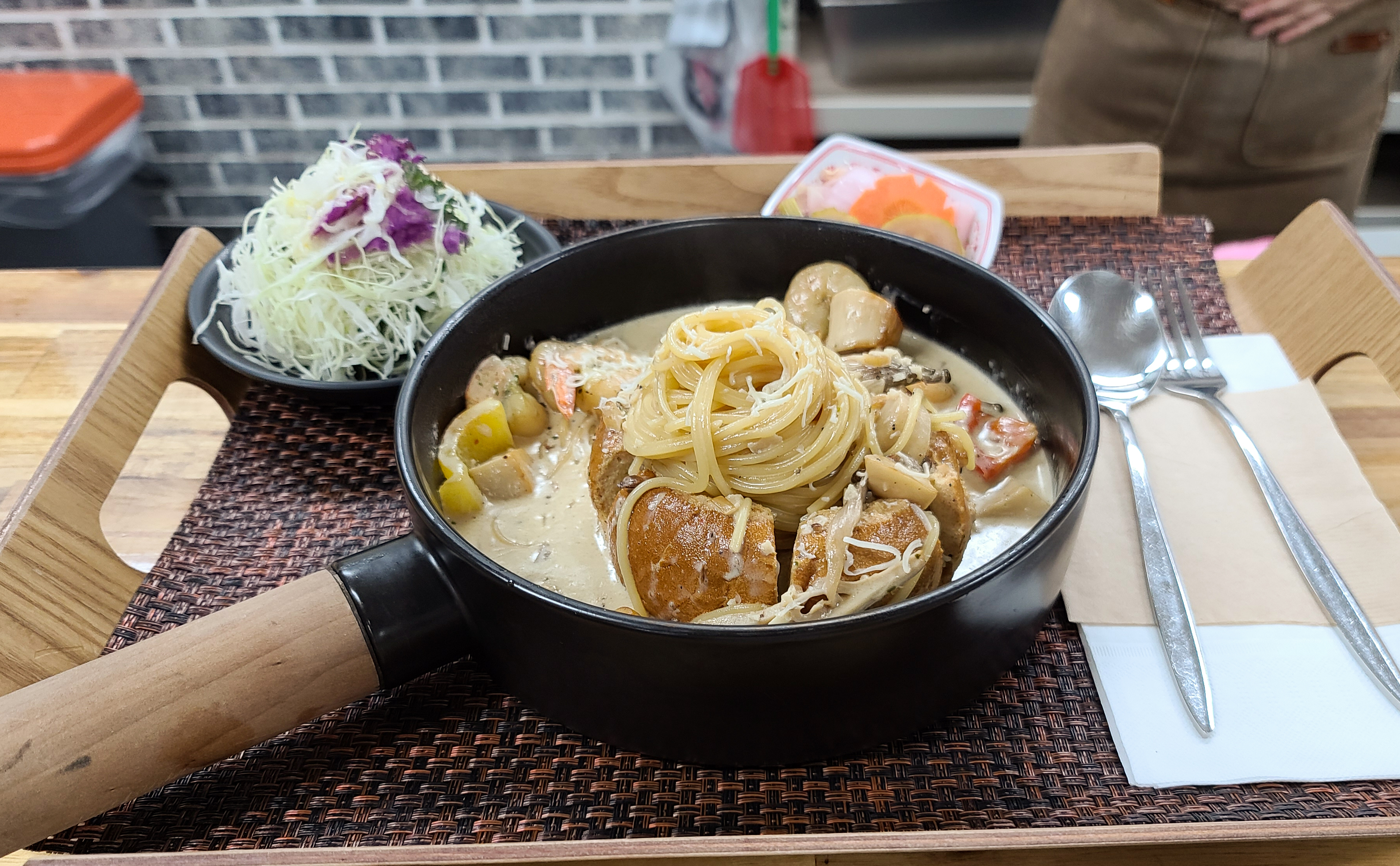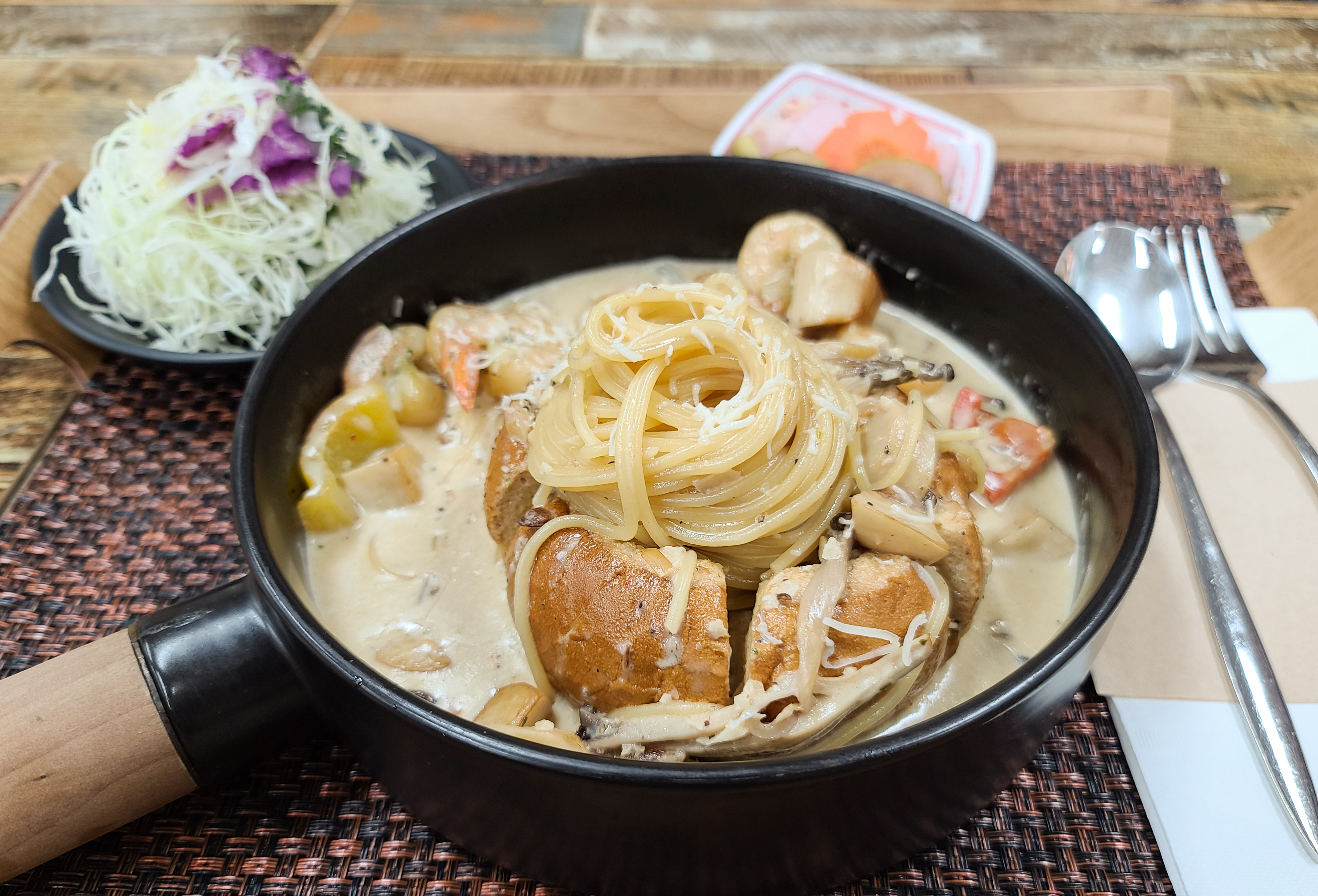 새우크림파스타의 모습입니다. 빵과 함께 크림소스에 새우와 마늘 등 채소가 들어간 파스타였습니다. 제가 주문한 메뉴는 아니어서 맛을 보지는 않았는데, 같이 간 동생에게 물어보니 맛있게 먹었다고 하더라고요.