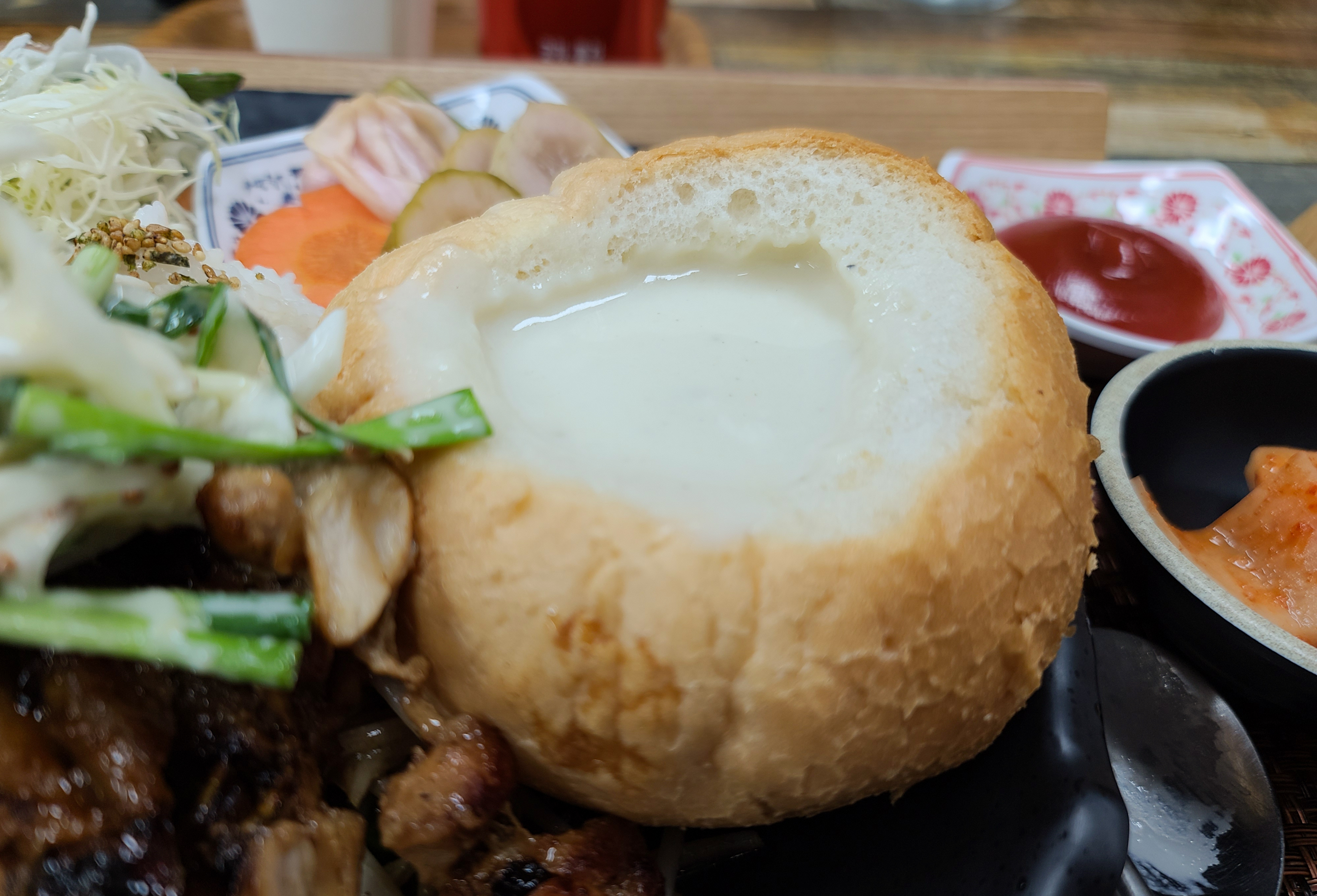 다음은 제가 주문한 단짠치킨스테이크정식이 나왔습니다. 더키친에이치의 단짠치킨스테이크정식은 구성이 다채로웠습니다. 빠네(빵)을 그릇 삼아 크림스프를 주었으며, 직접 담근 김치와 피클 그리고 샐러드, 감자튀김 등이 제공되었습니다.