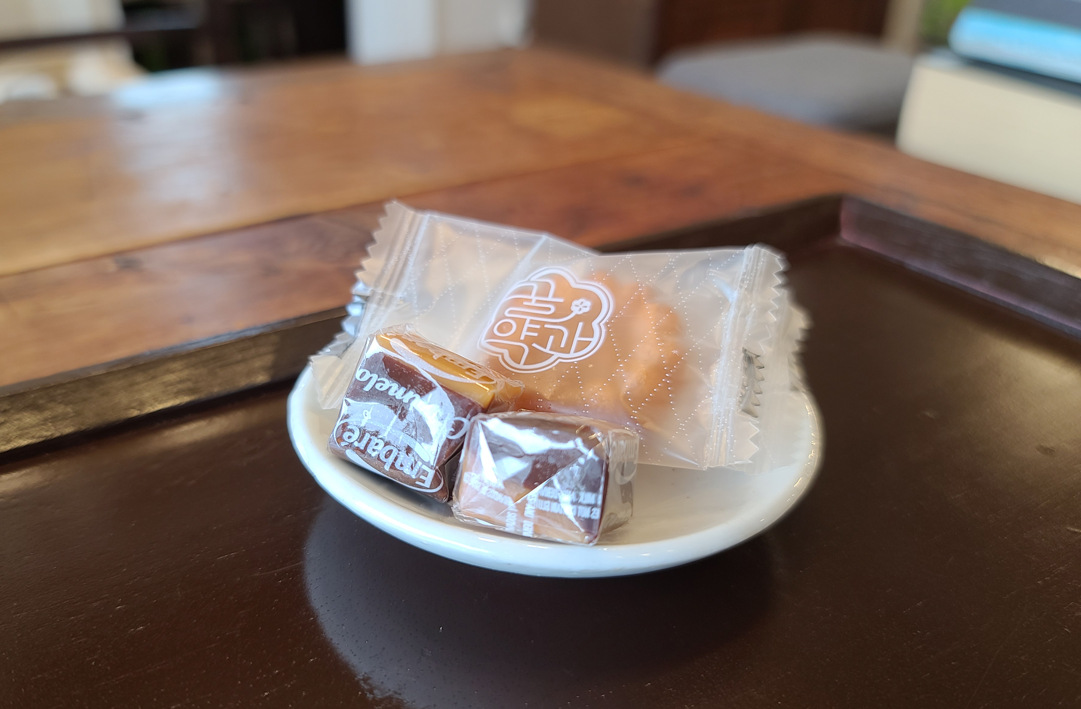 인사동고갤러리 카페의 메뉴는 위와 같이 되어있었습니다. 커피, 라떼, 아이스티, 코코아, 생과일주스, 꾸지뽕, 수제청귤차, 수제레몬차, 수제생강차, 수제오이차 등이 있었습니다. 저는 꾸지뽕 차를 선택했는데, 차와 함께 다과를 내어주셔서 좋았습니다. 그럼 이제 본격적으로 카페의 모습을 살펴볼까요?