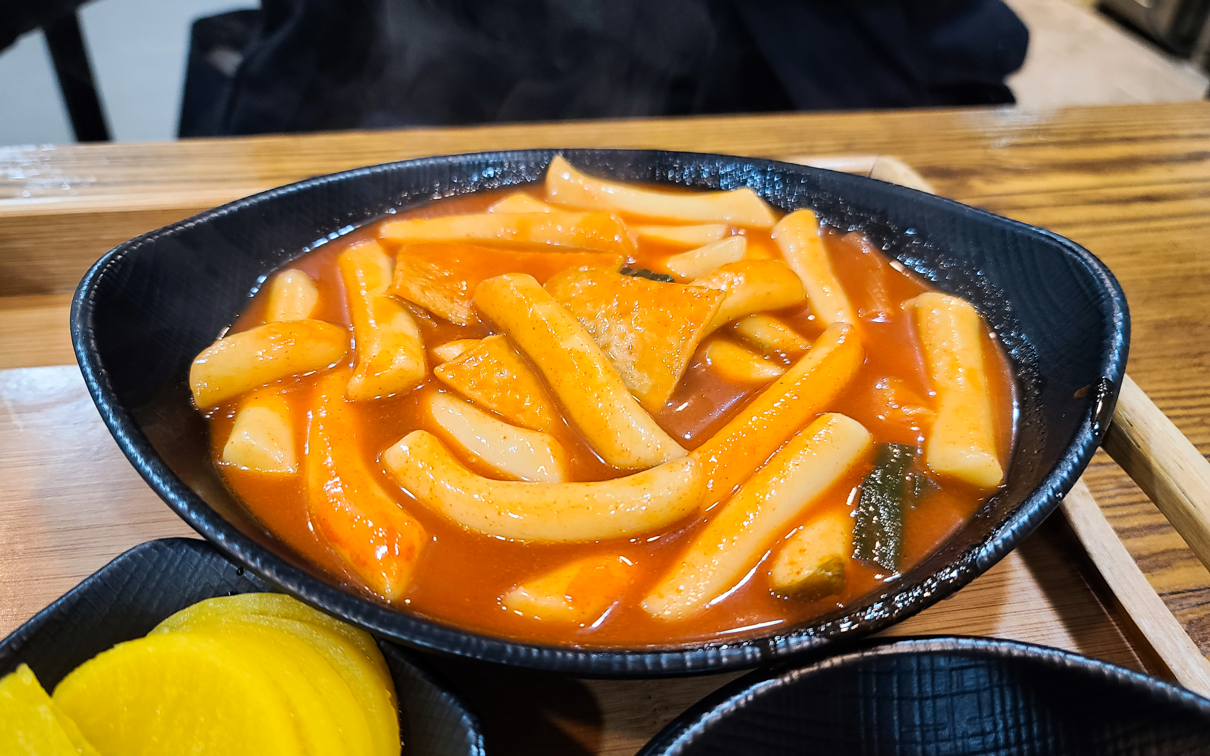 떡볶이 2인분을 한 접시에 주시는 줄 알고 떡볶이 2인분 양으로는 좀 작은 듯하네(?)라는 생각을 했는데, 떡볶이 접시가 하나 더 등장하더라고요. 떡볶이는 재료가 간단해 보였는데, 파와 떡볶이 떡 그리고 어묵이 들어가 있었습니다. 떡볶이 떡은 적당히 쫄깃한 식감이 있었고, 국물은 좀 단 맛이 강했습니다.