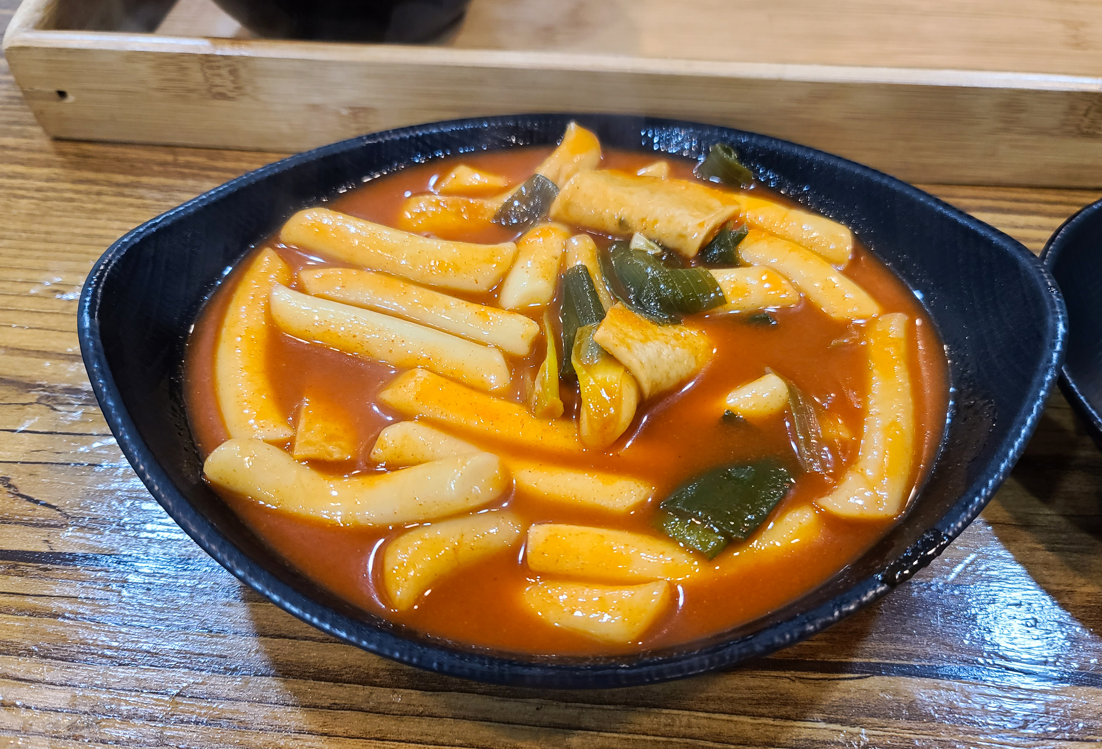떡볶이 2인분을 한 접시에 주시는 줄 알고 떡볶이 2인분 양으로는 좀 작은 듯하네(?)라는 생각을 했는데, 떡볶이 접시가 하나 더 등장하더라고요. 떡볶이는 재료가 간단해 보였는데, 파와 떡볶이 떡 그리고 어묵이 들어가 있었습니다. 떡볶이 떡은 적당히 쫄깃한 식감이 있었고, 국물은 좀 단 맛이 강했습니다.