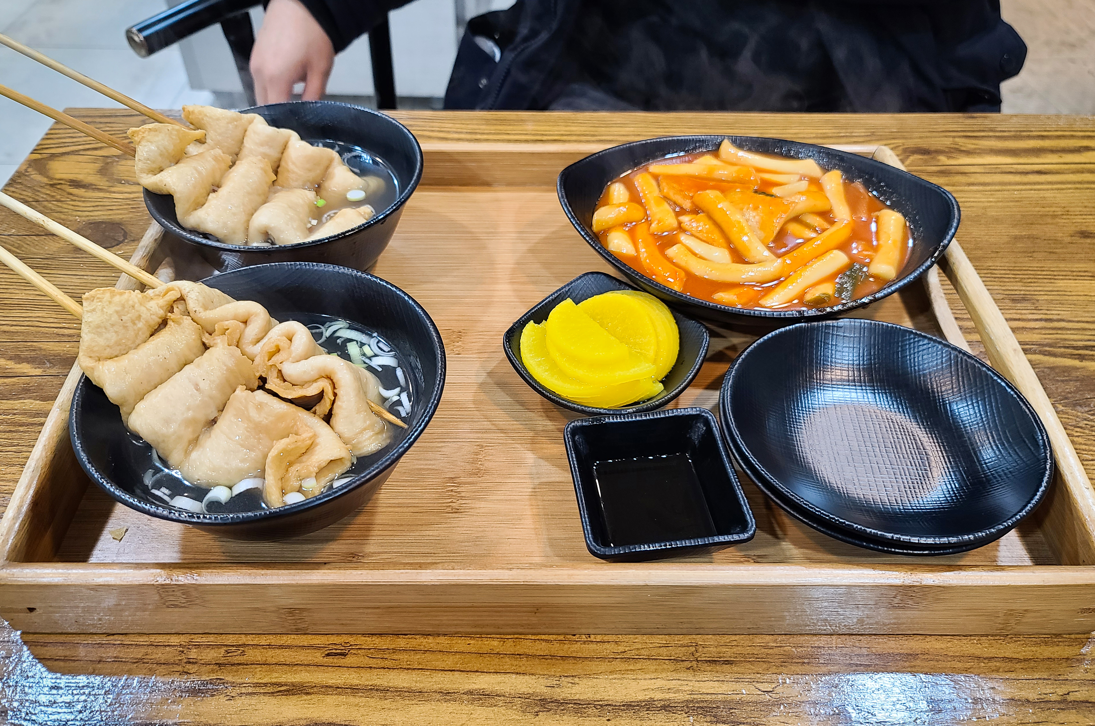 수진역 떡볶이당의 메뉴는 위와 같습니다. 떡볶이, 순대, 오뎅, 튀김, 음료수, 닭강정의 메뉴가 있었고, 금액은 떡볶이 기준 3,500원으로 부담스럽지 않은 가격에 형성되어 있었습니다. 저희는 떡볶이 2인분, 오뎅 4개, 튀김 5개를 주문하였습니다. 우선 떡볶이와 어묵 그리고 반찬으로 단무지가 나왔습니다.