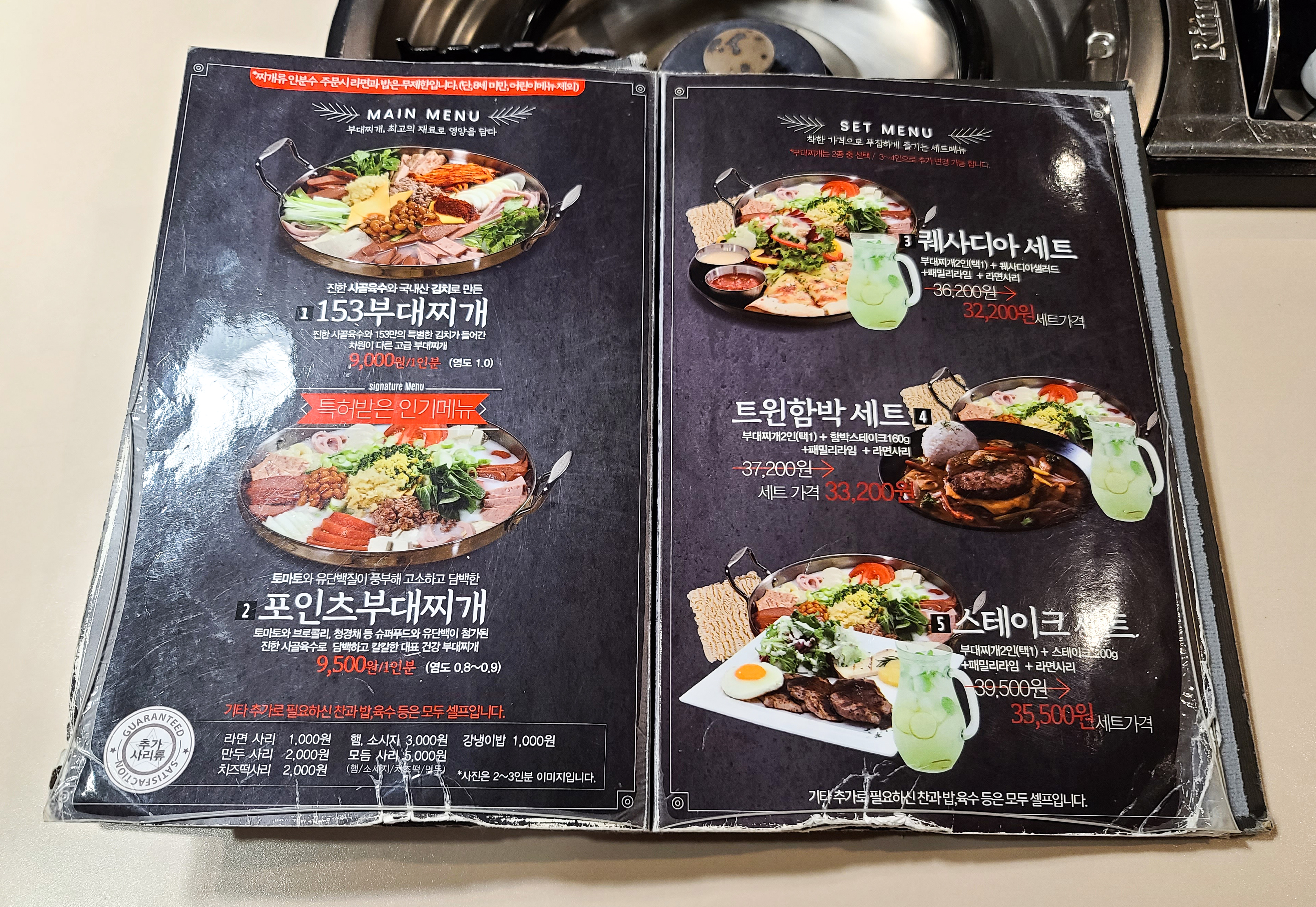 '153포인츠부대찌개'의 메뉴를 살펴보시면, 153부대찌개, 포인츠부대찌개, 퀘사디아세트, 트윈함박세트, 스테이크세트 등이 있었습니다. 가게에는 식후 마실 수 있는 간이 커피숍도 마련되어 있어서 식사와 커피를 동시에 즐길 수 있었습니다. 저희는 특허받은 인기 메뉴(?)인 포인츠 부대찌개를 주문하였습니다.