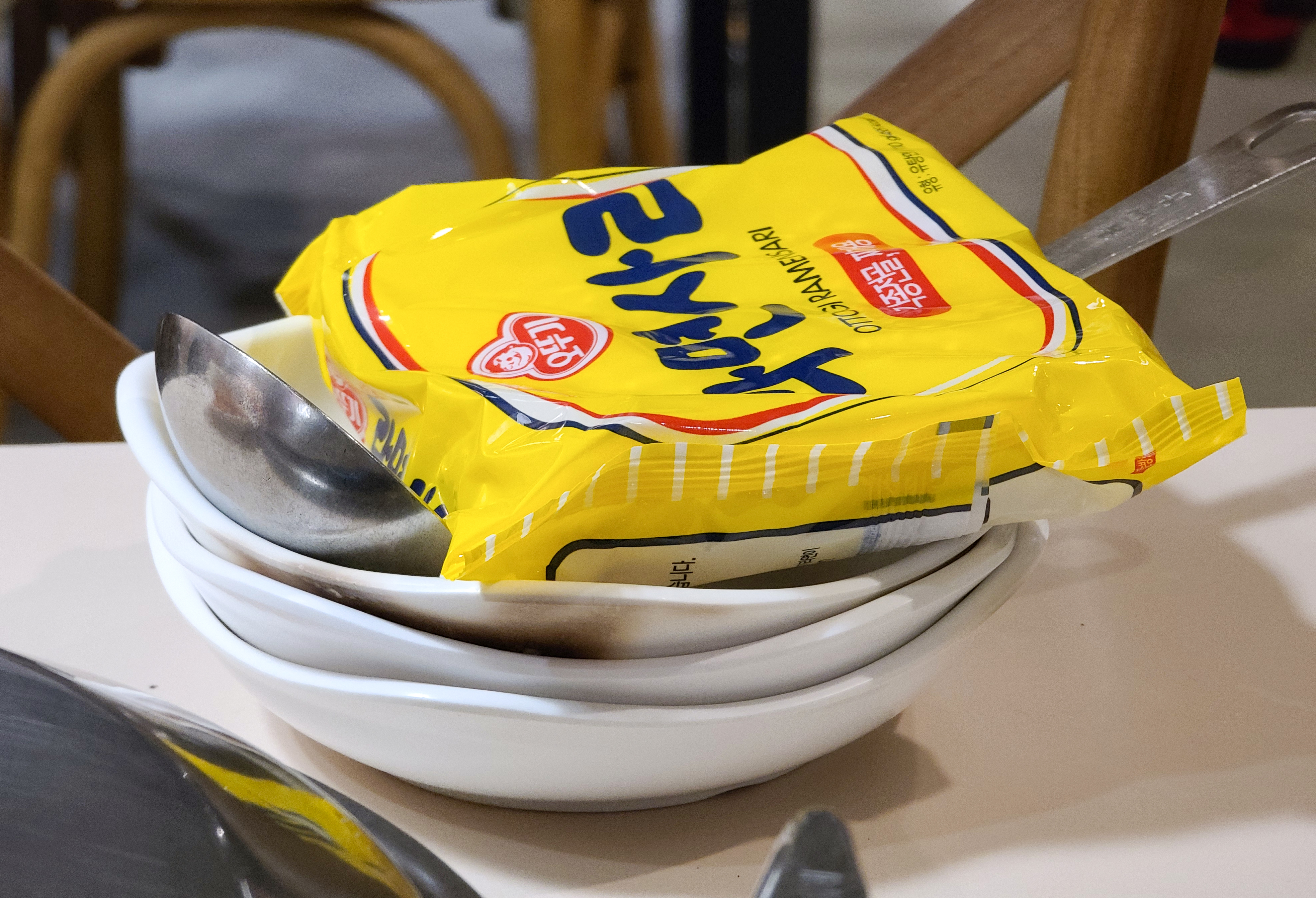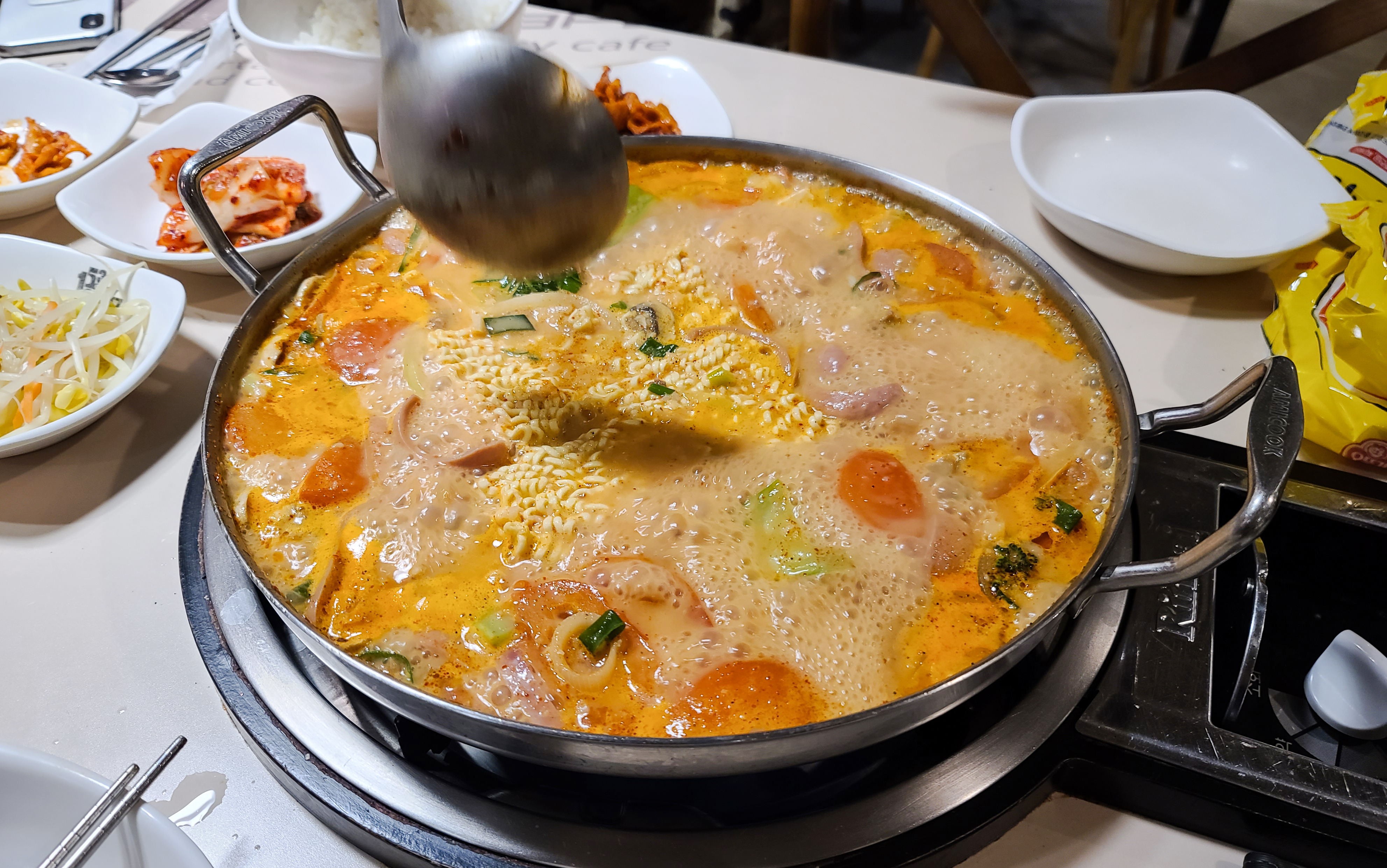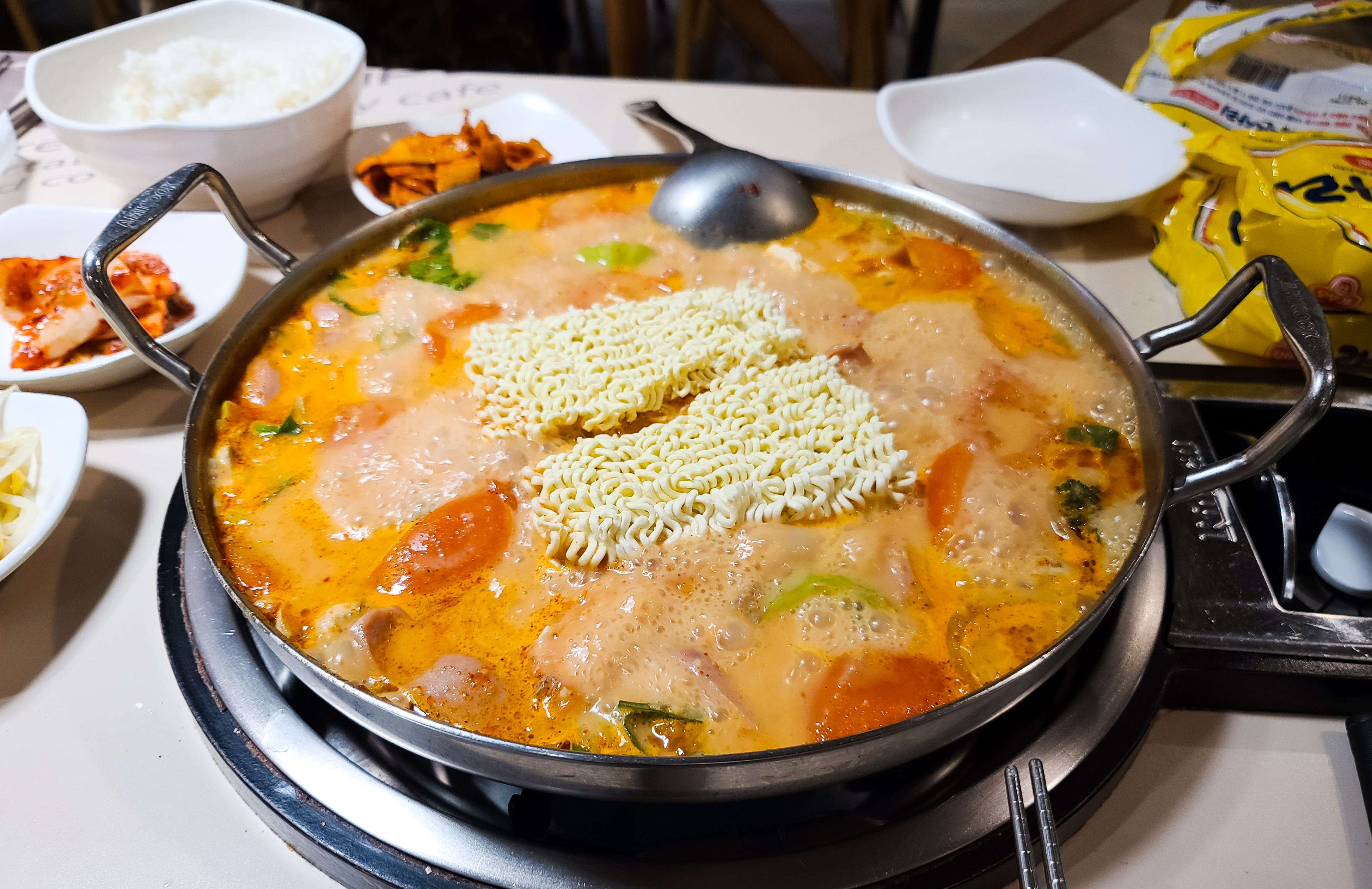 부대찌개가 끓기 시작하였고, 끓고 있는 부대찌개에 라면사리를 넣어주었습니다. 처음에는 흰 국물로만 가득했는데, 안에 있던 양념이 섞이면서 우리가 흔히 알던 부대찌개의 모양을 찾아갔습니다.