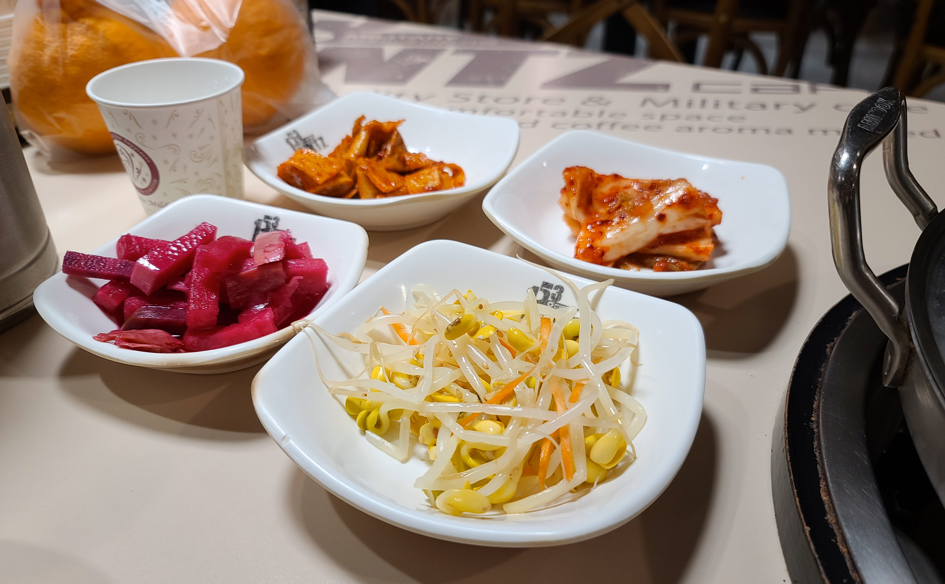 곧이어 주문한 부대찌개와 공기밥, 반찬, 라면사리, 그릇 등이 제공되었습니다. 반찬은 어묵볶음, 배추김치, 콩나물무침, 피클 이 제공되었습니다. 이 부대찌개는 흰 국물에 토마토, 치즈, 마늘, 양송이버섯, 채소 등이 들어간 게 특징이었습니다.