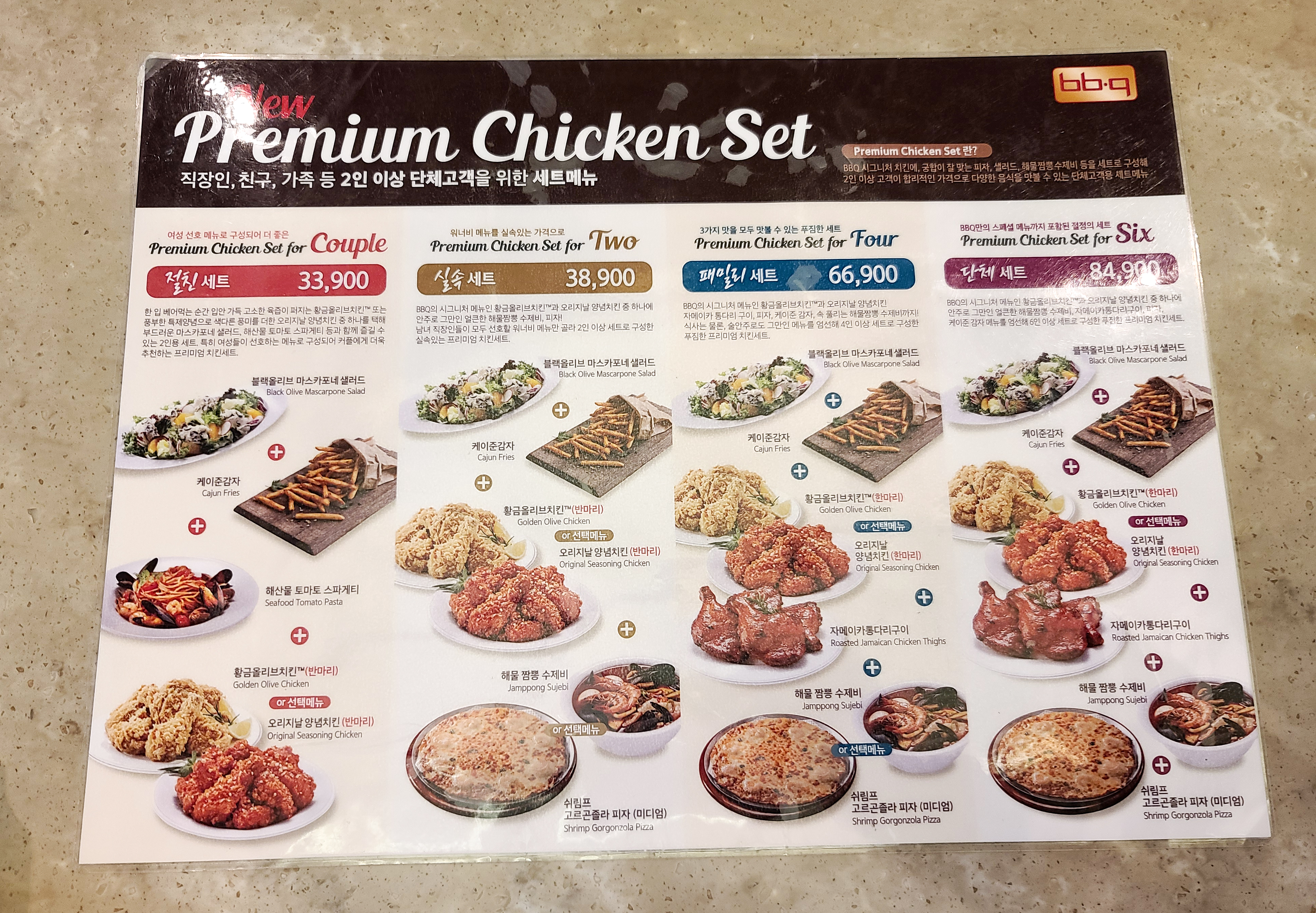 BBQ 의 메뉴는 위와 같습니다. 아무래도 본사 건물에 위치한 BBQ 여서 그런지, 메뉴는 정말 다양하고 많더라고요. 후라이드치킨, 양념치킨, 구이치킨, 사이드 메뉴, 피자 등 구성이 다채로웠습니다. 다양한 메뉴를 동시에 즐길 수 있는 세트메뉴로는 3만원대~ 8만원대까지 다양했습니다. 저희는 BBQ 황금올리브 후라이드치킨, 양념치킨, 왕갈비치킨을 주문했습니다.