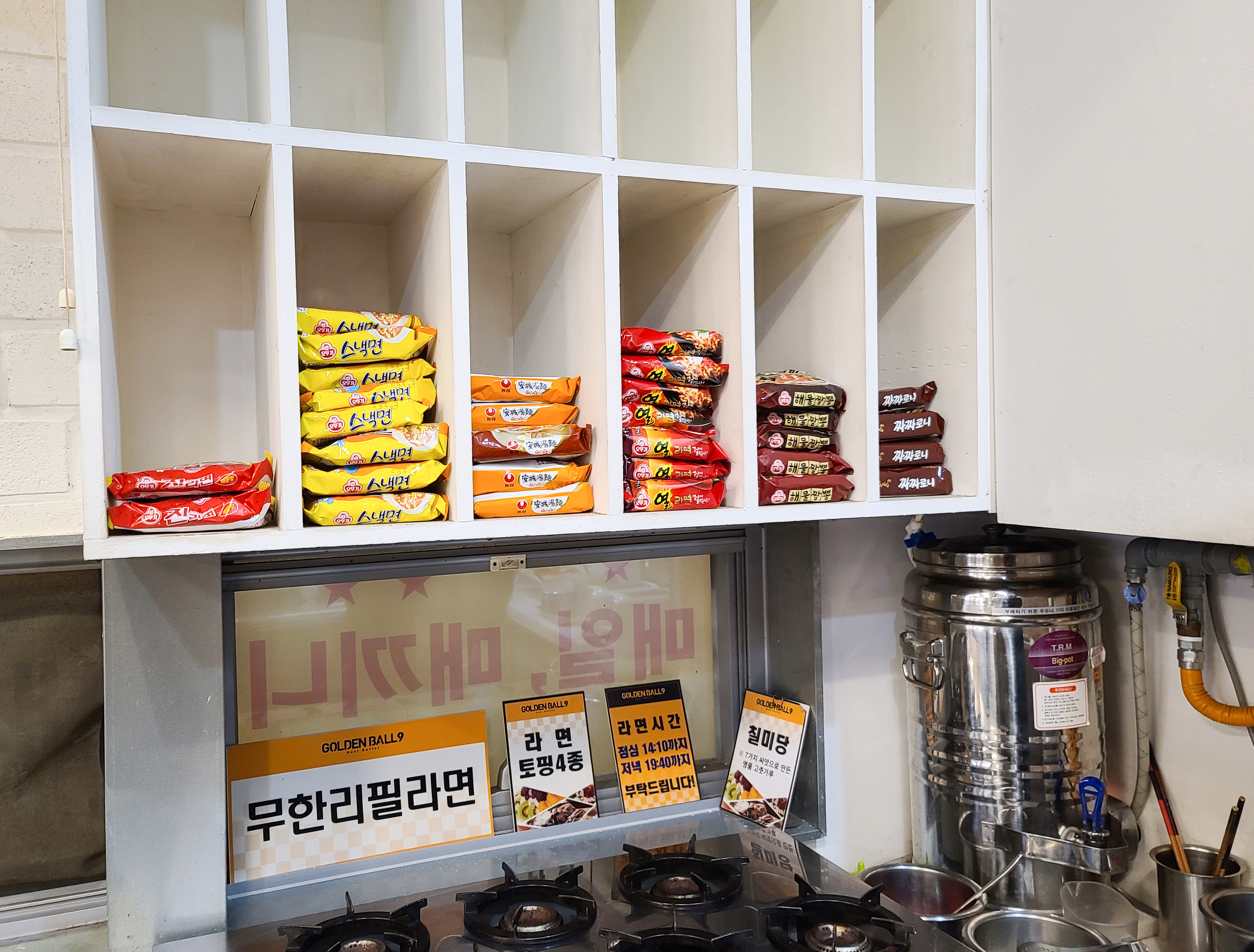 골든볼9 에서는 음료수나 라면, 쿠키, 빵 등을 곁들여 먹을 수도 있었습니다. 라면의 종류는 진라면, 스낵면, 안성탕면, 열라면, 해물짬뽕, 짜짜로니 등이 있었고, 빵은 식빵과 단팥빵이 있었습니다.